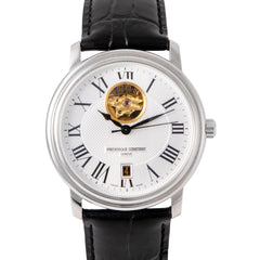 This Pre-owned Frederique Constant Persuasion Heart Beat 40mm, steel case, silver dial, steel bezel and black leather strap in excellent condition. Mechanized by Frederique Constant calibre FC-315 automatic movement. Includes box, Frederique Constant sales warranty card dated April 2018 and 2 years Timepiece360 warranty.
