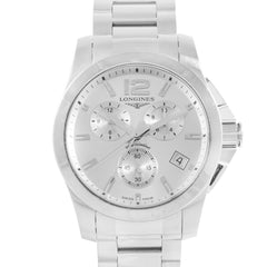 This Pre-owned Longines Conquest Chronograph 41mm, steel case, silver dial, steel bezel and steel bracelet with 11 links is in very good condition. Mechanised by Longines calibre L 541.2 quartz movement. Includes box, extra leather strap, 2 extra links, and 2 years Timepiece360 warranty.