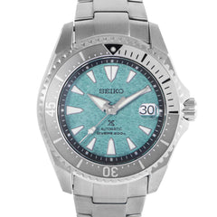 This Pre-owned Seiko Prospex Sea 43.5mm, titanium case, blue-green dial, titanium bezel and titanium bracelet with 11 links is in excellent condition. Mechanized by Seiko calibre 6R35 automatic with manual movement. Includes box, blank Seiko sales warranty card and 2 years Timepiece360 warranty.