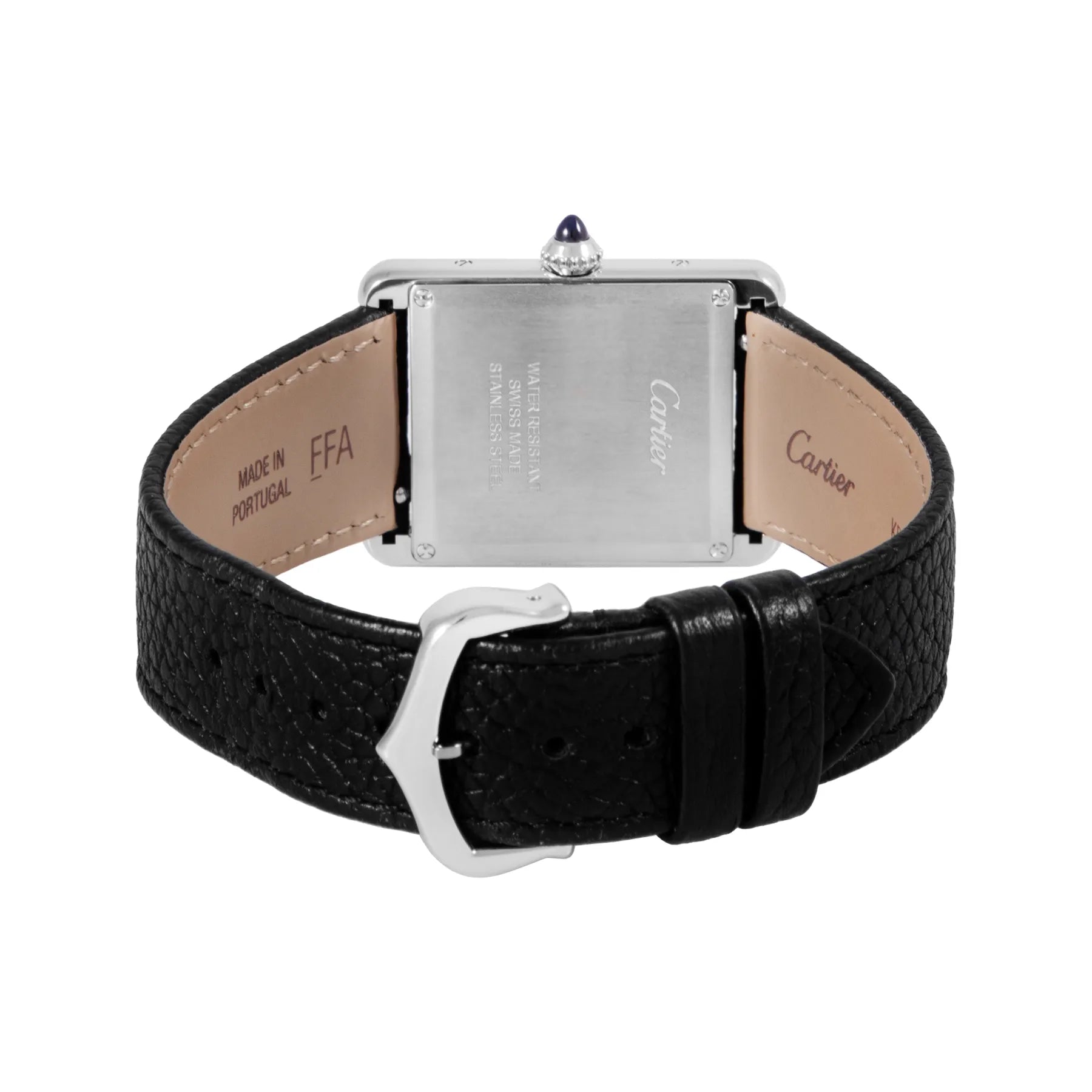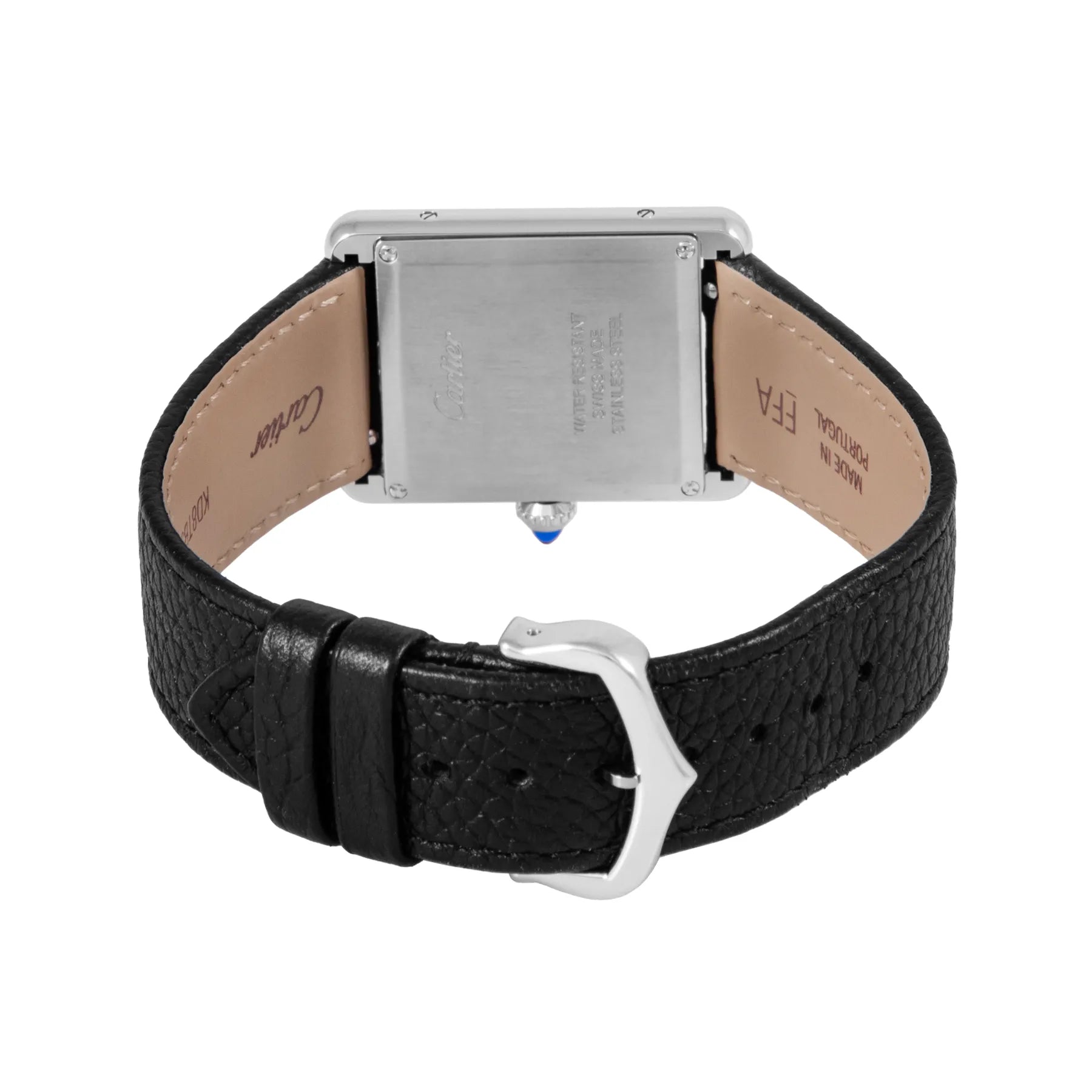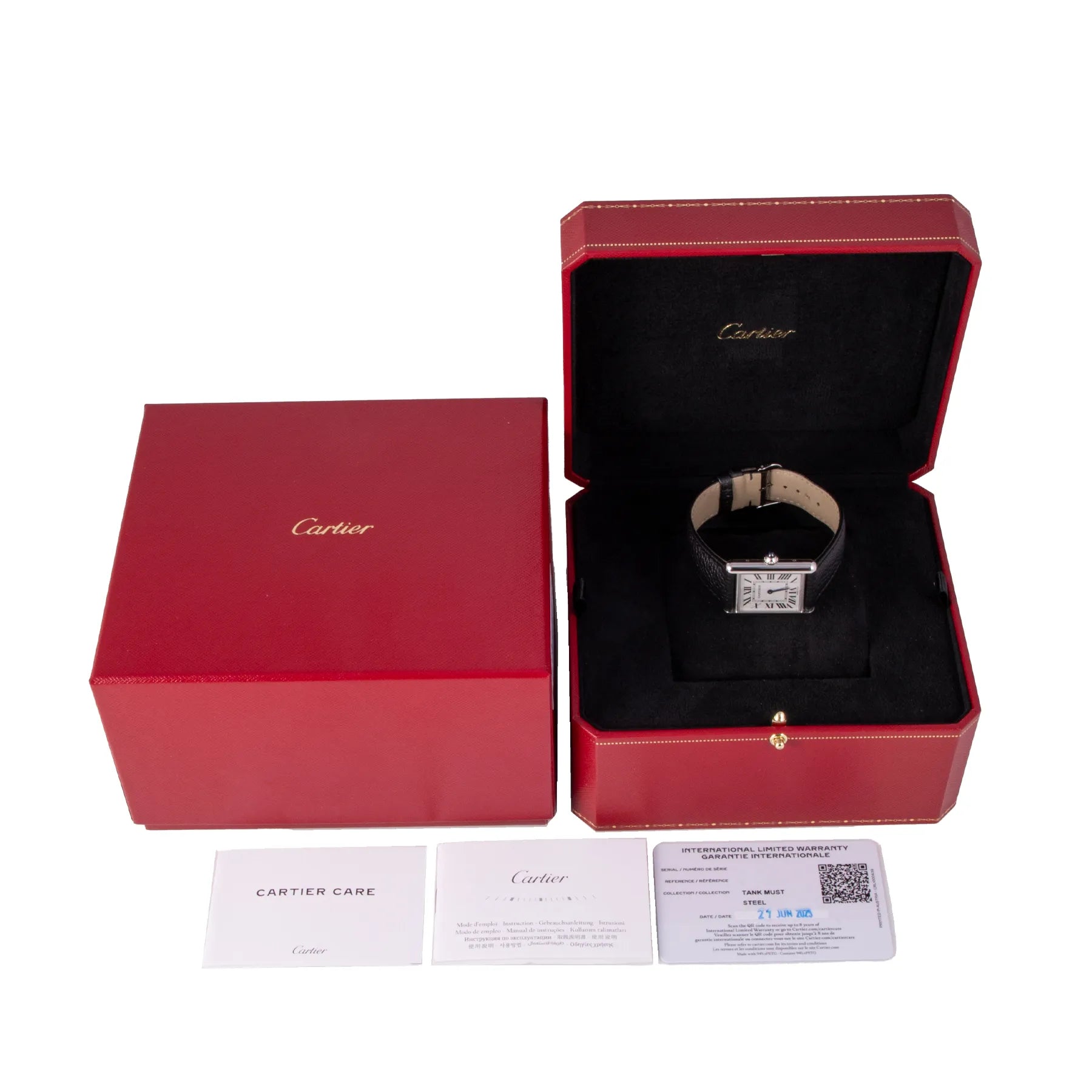 This Pre-owned Cartier Tank 33.7mm x 25.5mm, steel case, silver dial, steel bezel and black leather strap is in excellent condition. Mechanised by Cartier calibre quartz movement. Includes box and sales warranty card dated June 2025.