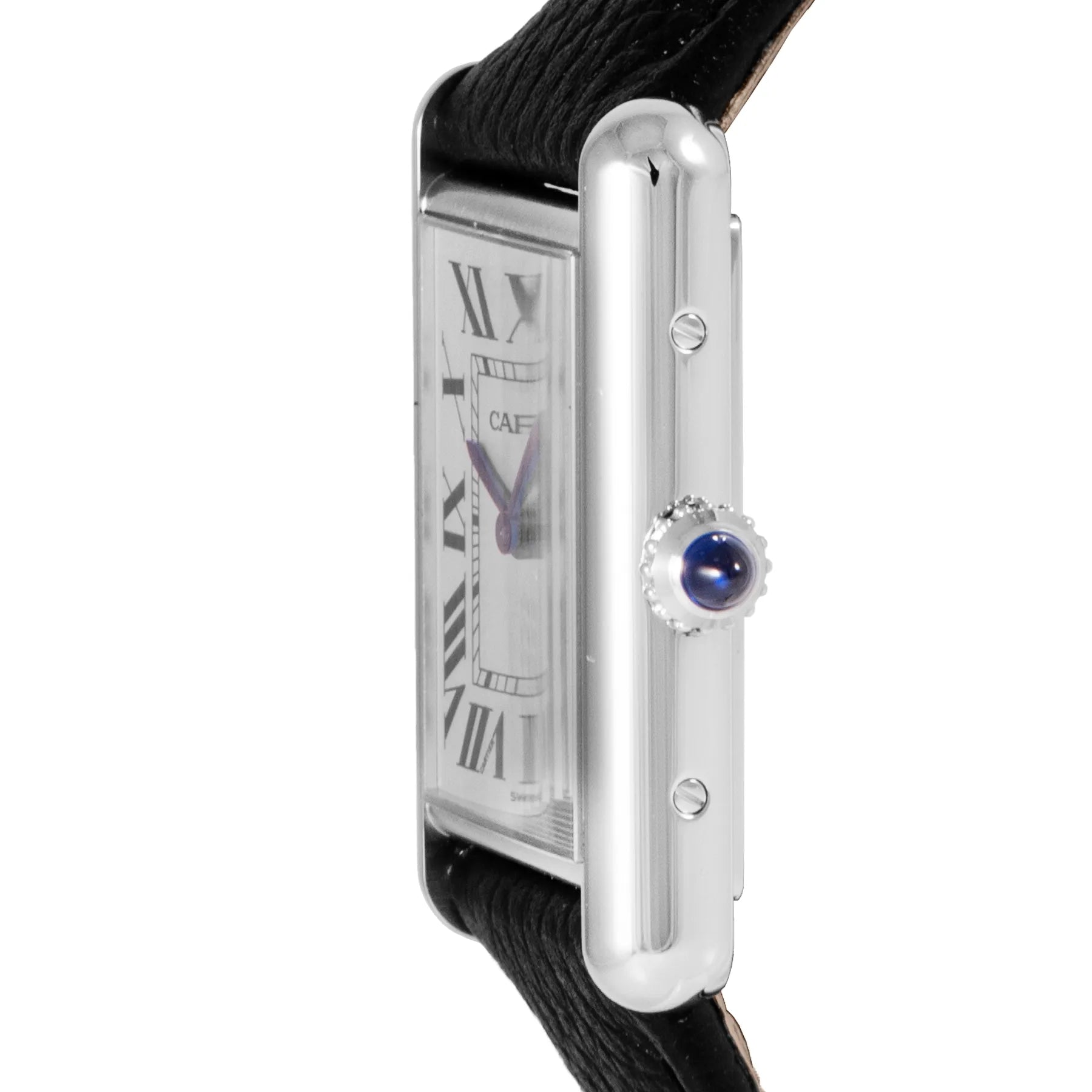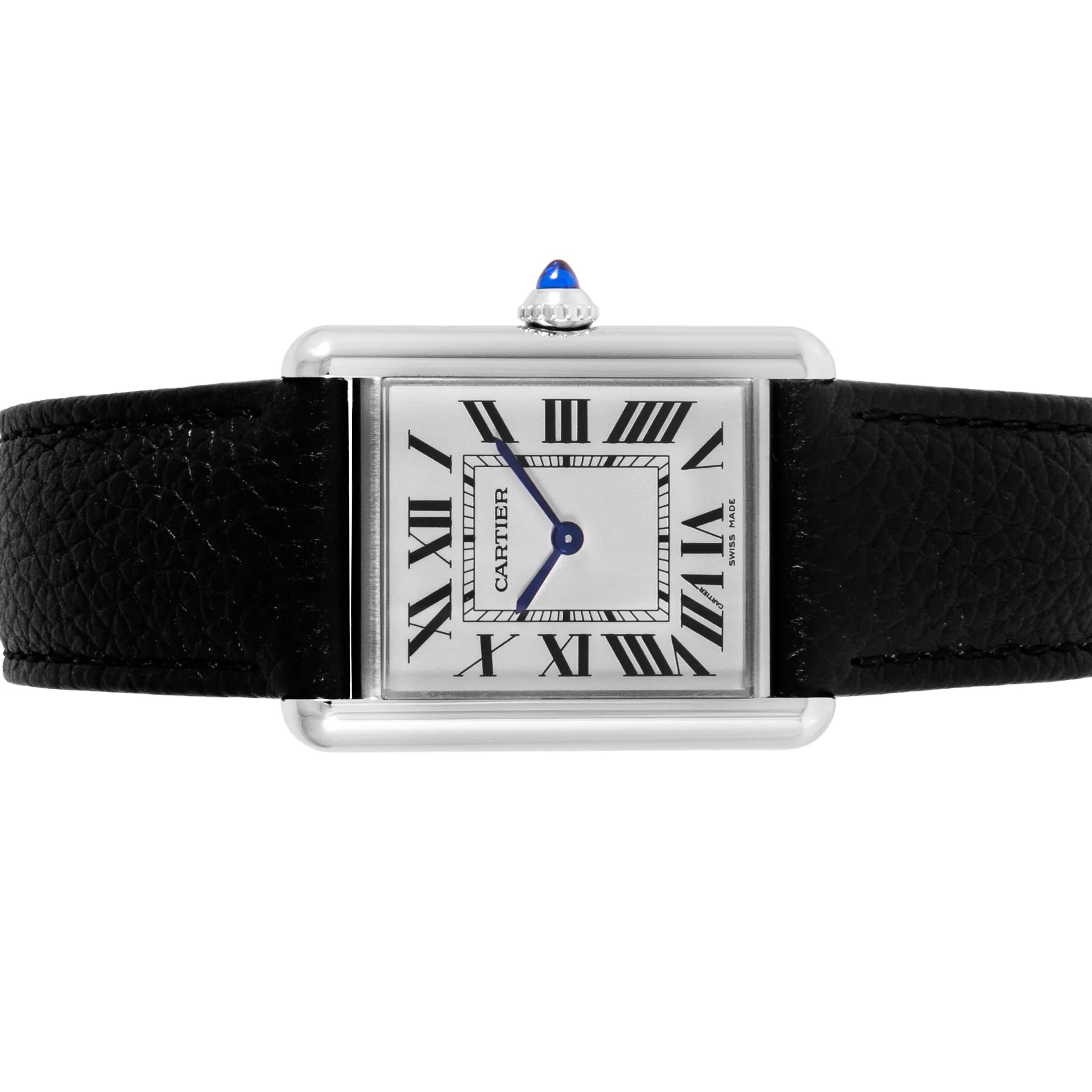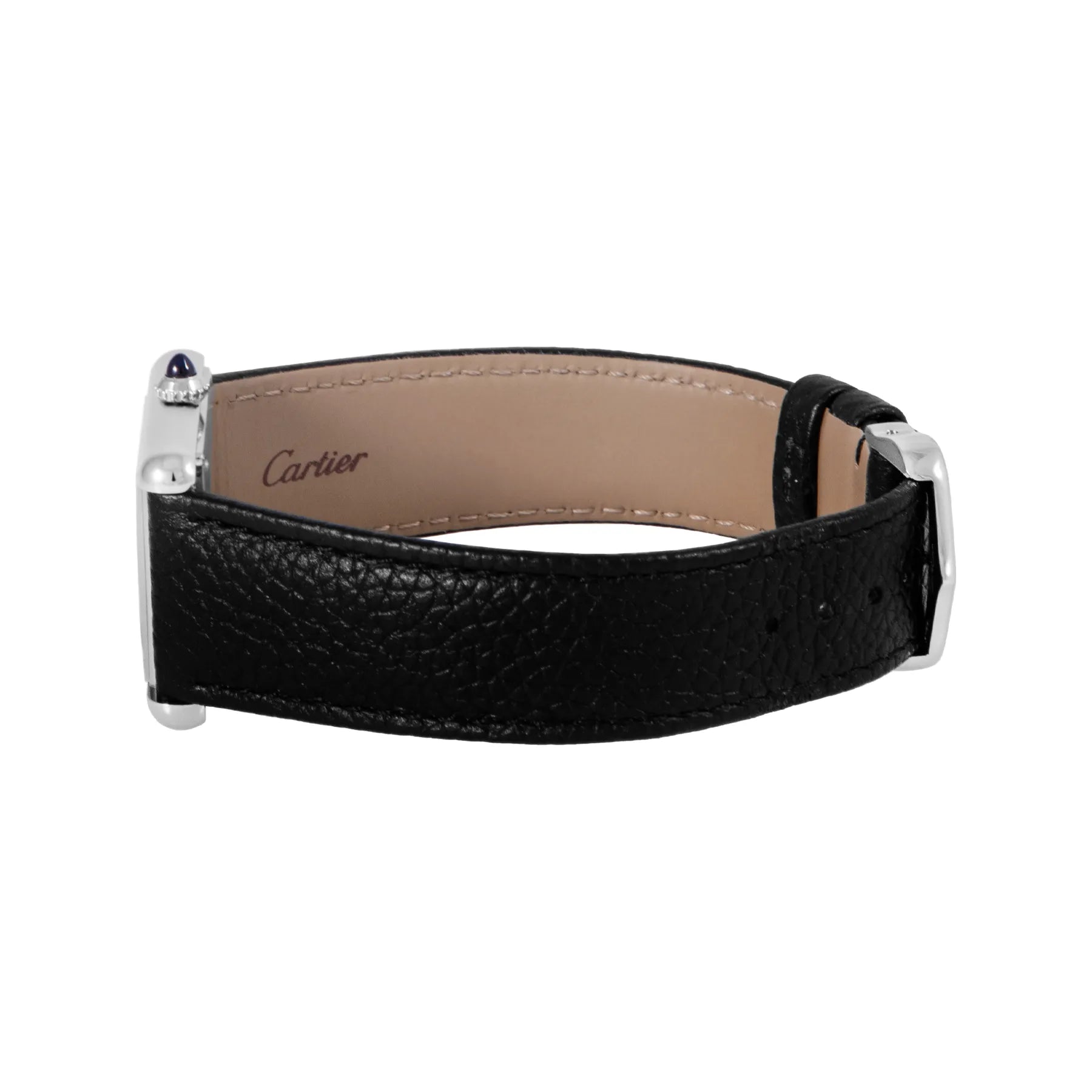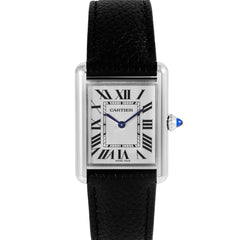 This Pre-owned Cartier Tank 33.7mm x 25.5mm, steel case, silver dial, steel bezel and black leather strap is in excellent condition. Mechanised by Cartier calibre quartz movement. Includes box and sales warranty card dated June 2025.