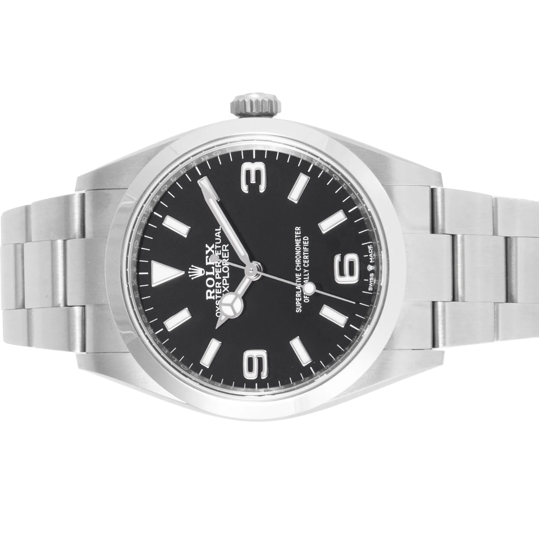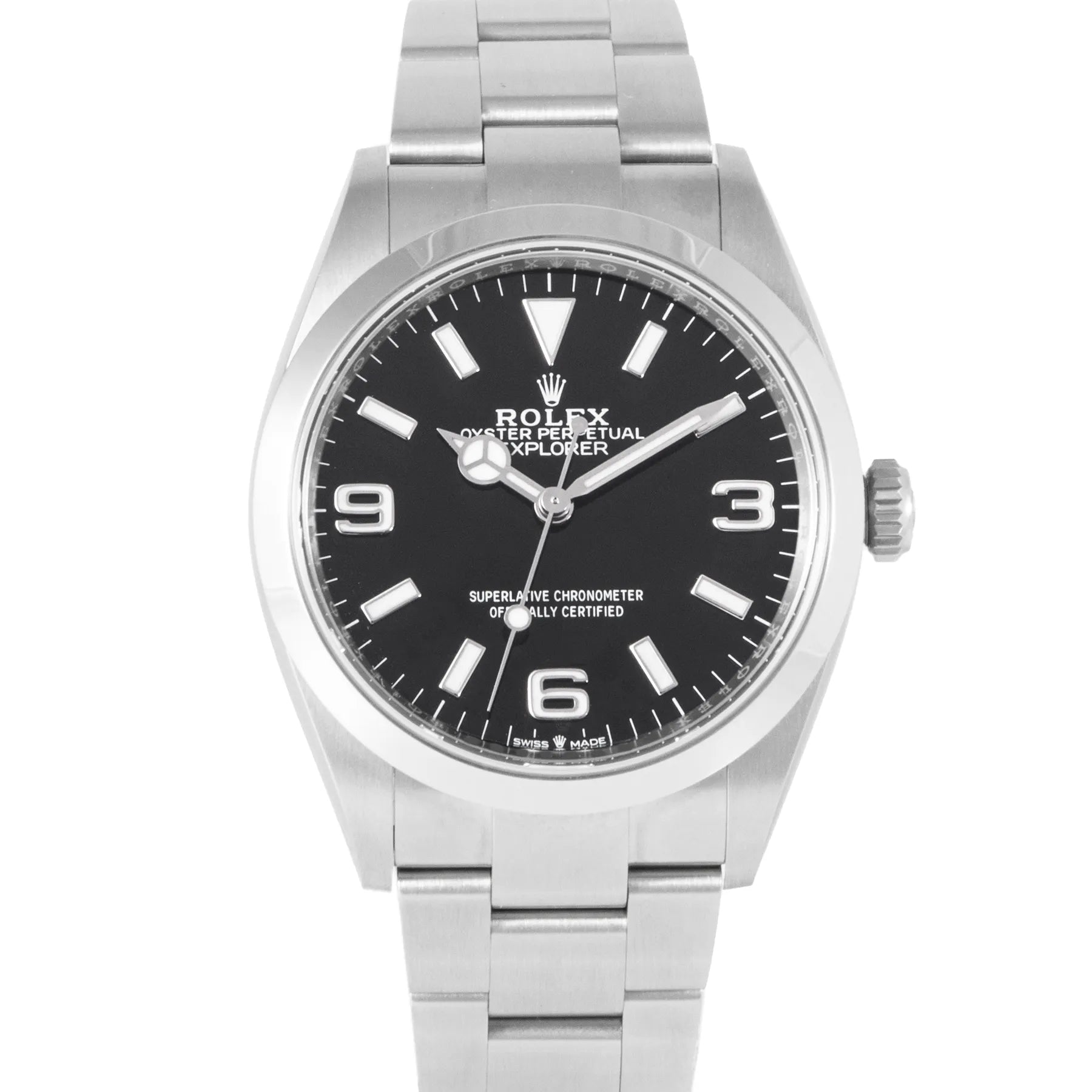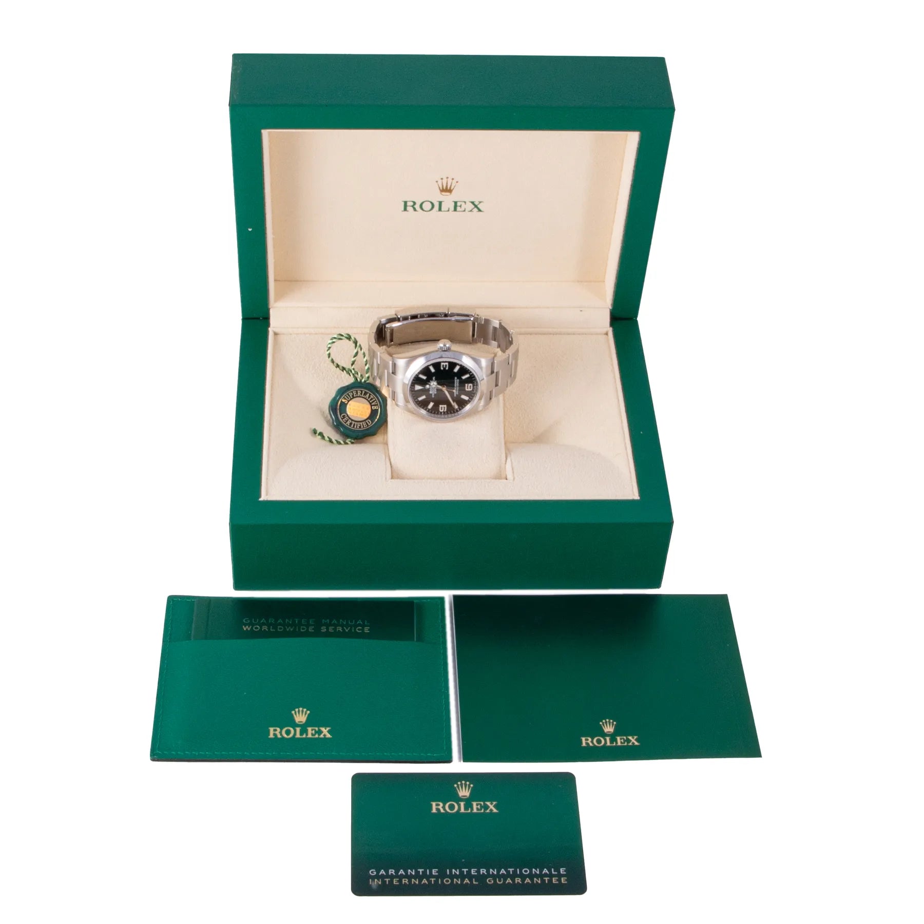 This Pre-owned Rolex Explorer 36mm, steel case, black dial, steel bezel and steel oyster bracelet with 10 links is in very good condition. Mechanised by Rolex calibre 3230 automatic movement. Includes box and sales warranty card dated April 2022.