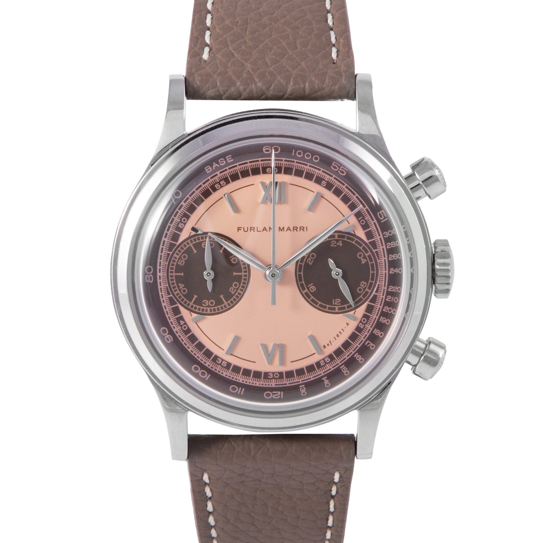 This Pre-owned Furlan Marri "Havana Salmon" 38mm, steel case, salmon dial, steel bezel and brown leather strap is in very good condition. Mechanised by Furlan Marri calibre VK 64A quartz movement. Includes box, extra black leather strap, undated sales warranty card and 2 years Timepiece360 warranty.
