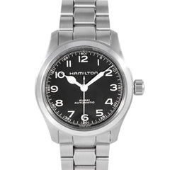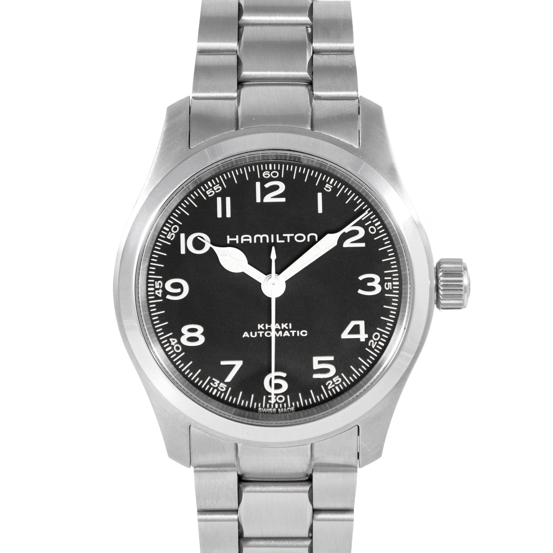 This Pre-owned Hamilton Khaki Field Murph 38mm, steel case, black dial, steel bezel and steel bracelet with 14 links is in excellent condition. Mechanised by Hamilton calibre C07611 automatic movement. Includes box and sales warranty card dated October 2024.