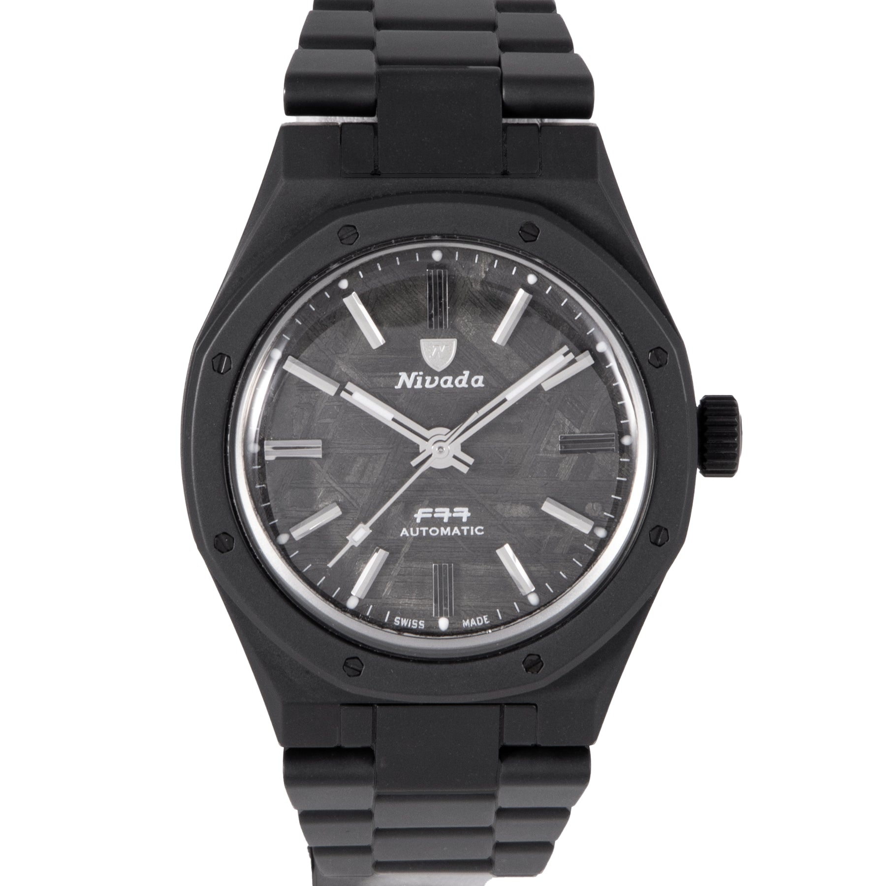 This Nivada F77 37mm, ceramic case, meteorite dial, ceramic bezel and ceramic bracelet with 15 links is in excellent condition. Mechanised by Nivada calibre P024 automatic movement. Includes box and sales warranty card dated February 2025.