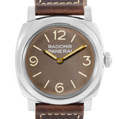 This Pre-owned Officine Panerai Radiomir 1940 3 Days Egiziano Piccolo 47mm, steel case, brown dial, steel bezel and brown leather strap in very good condition. This watch is a Limited Edition of 1,000 pieces only. Mechanized by Panerai calibre P.3000 manual movement. This watch is limited to 1,000 pieces only. Includes box, sales warranty card dated October 2016 and 2 years Timepiece360 warranty.
