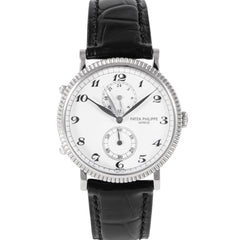 This Pre-owned Patek Philippe Calatrava Travel Time 34mm, white gold case, white dial, white gold bezel and black leather strap is in very good condition. Mechanised by Patek Philippe calibre 215/156 manual movement. Includes travel pouch and service invoice dated October 2025.