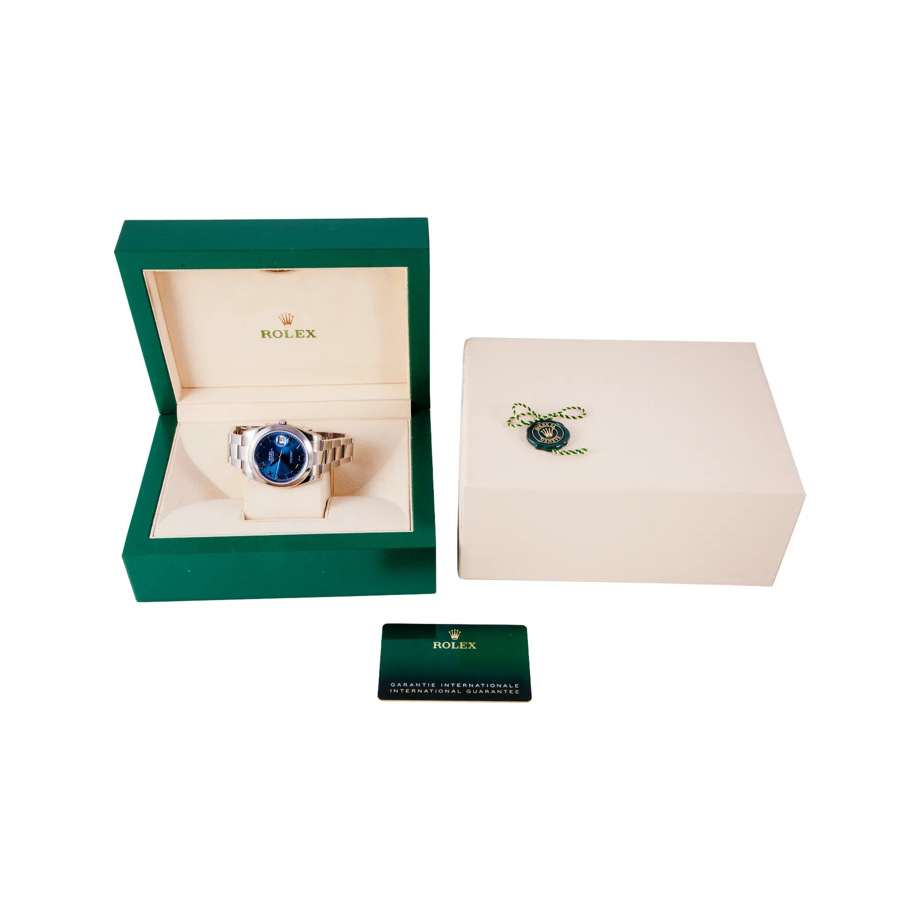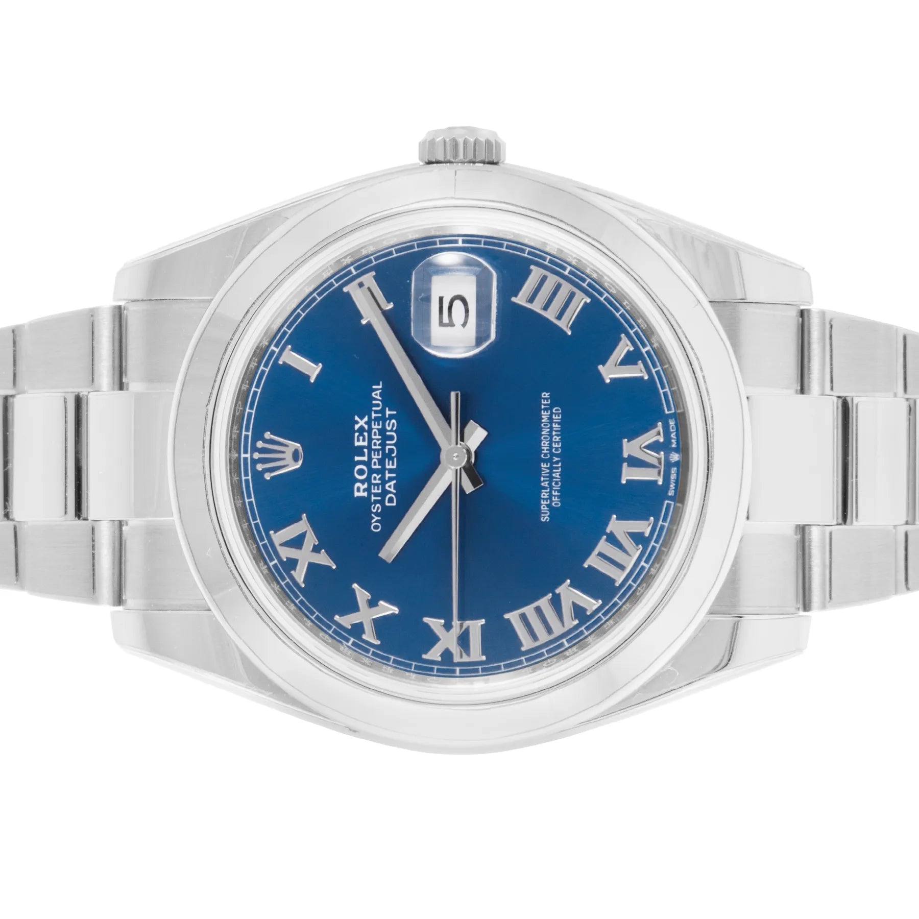 This Pre-owned Rolex Datejust 41mm, steel case, blue roman dial, steel bezel and steel oyster bracelet with 12 links is in excellent condition. Mechanised by Rolex calibre 3235 automatic movement. Includes box and sales warranty card dated June 2024.