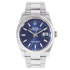 This Pre-owned Rolex Datejust 36mm, steel case, blue dial, white gold bezel and oyster steel bracelet with 10 links is in excellent condition. Mechanised by Rolex calibre 3235 automatic movement. Includes box, Rolex sales warranty card dated January 2020 and 2 years Timepiece360 warranty.