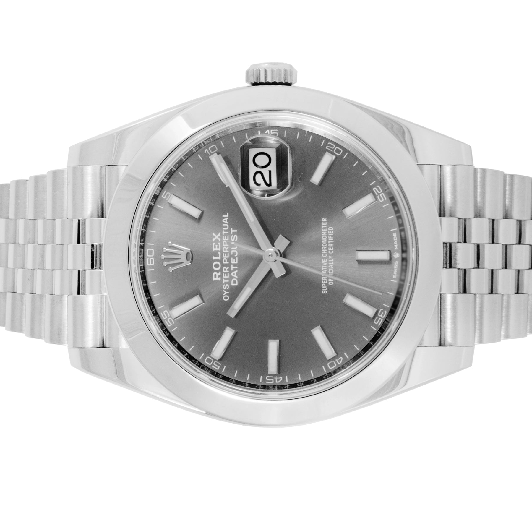 This Pre-owned Rolex Datejust 41mm, steel case, grey dial, steel bezel and steel jubilee bracelet with 18 links is in excellent condition. Mechanised by Rolex calibre 3235 automatic movement. Includes box, sales warranty card dated May 2020, and 2 years Timepiece360 warranty.