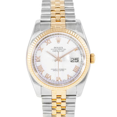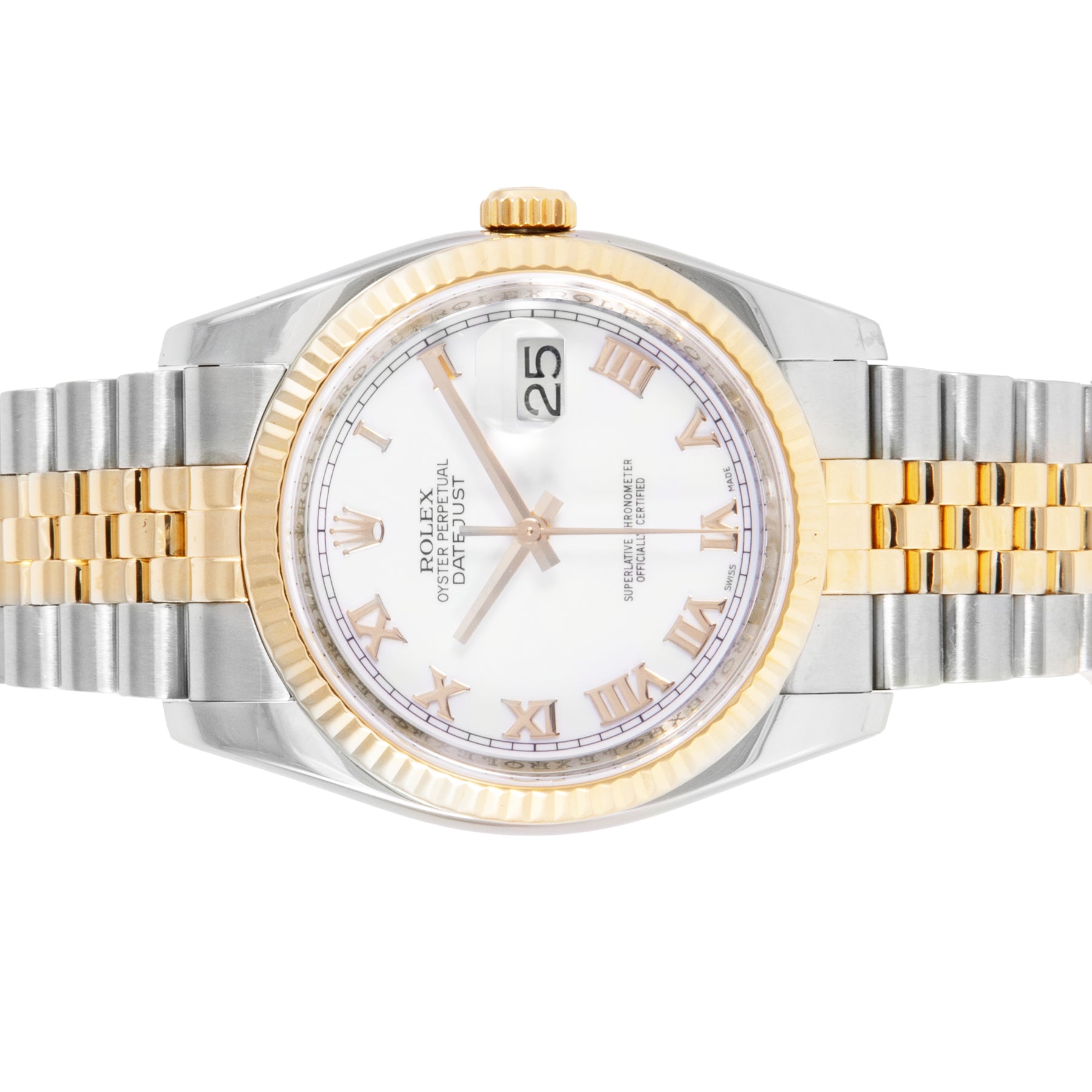 This Pre-owned Rolex Datejust 36mm, steel & yellow gold case, white roman dial, yellow gold bezel and steel & yellow gold jubilee bracelet with 21 links is in excellent condition. Mechanised by Rolex calibre 3135 automatic movement. Includes box, Rolex sales warranty card dated July 2008 and 2 years Timepiece360 warranty.