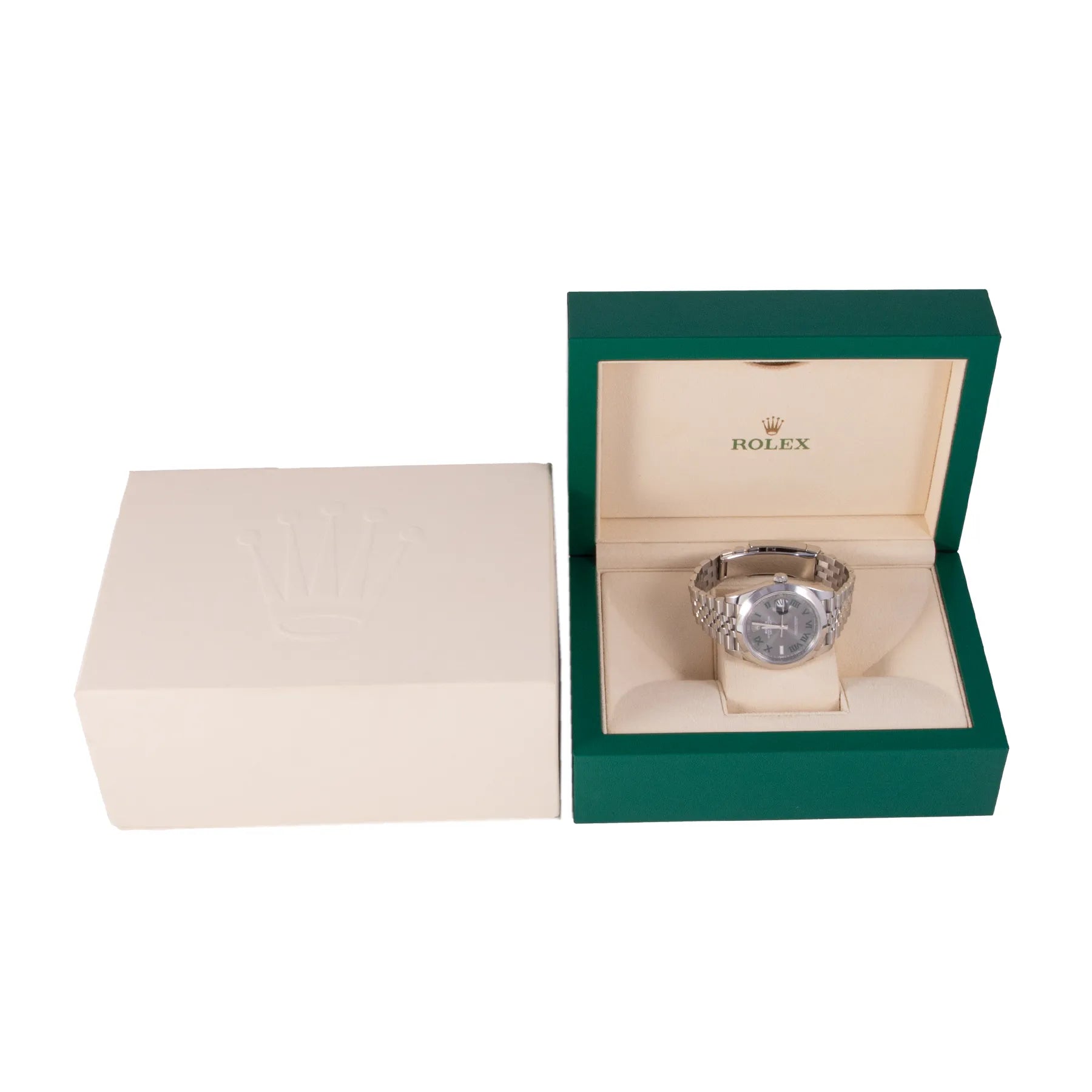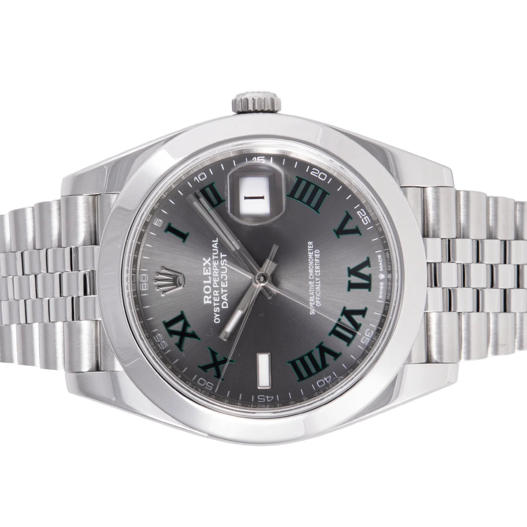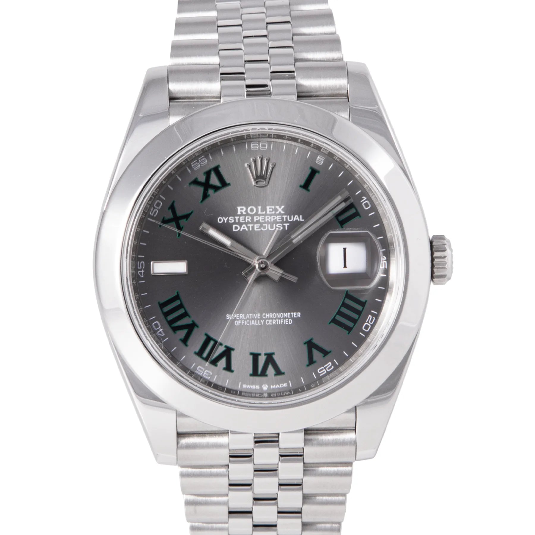 This Pre-owned Rolex Datejust "Wimbledon" 41mm, steel case, slate grey roman dial, steel bezel and steel jubilee bracelet with 19 links is in very good condition. Mechanised by Rolex calibre 3235 automatic movement. Includes box and 2 years Timepiece360 warranty.
