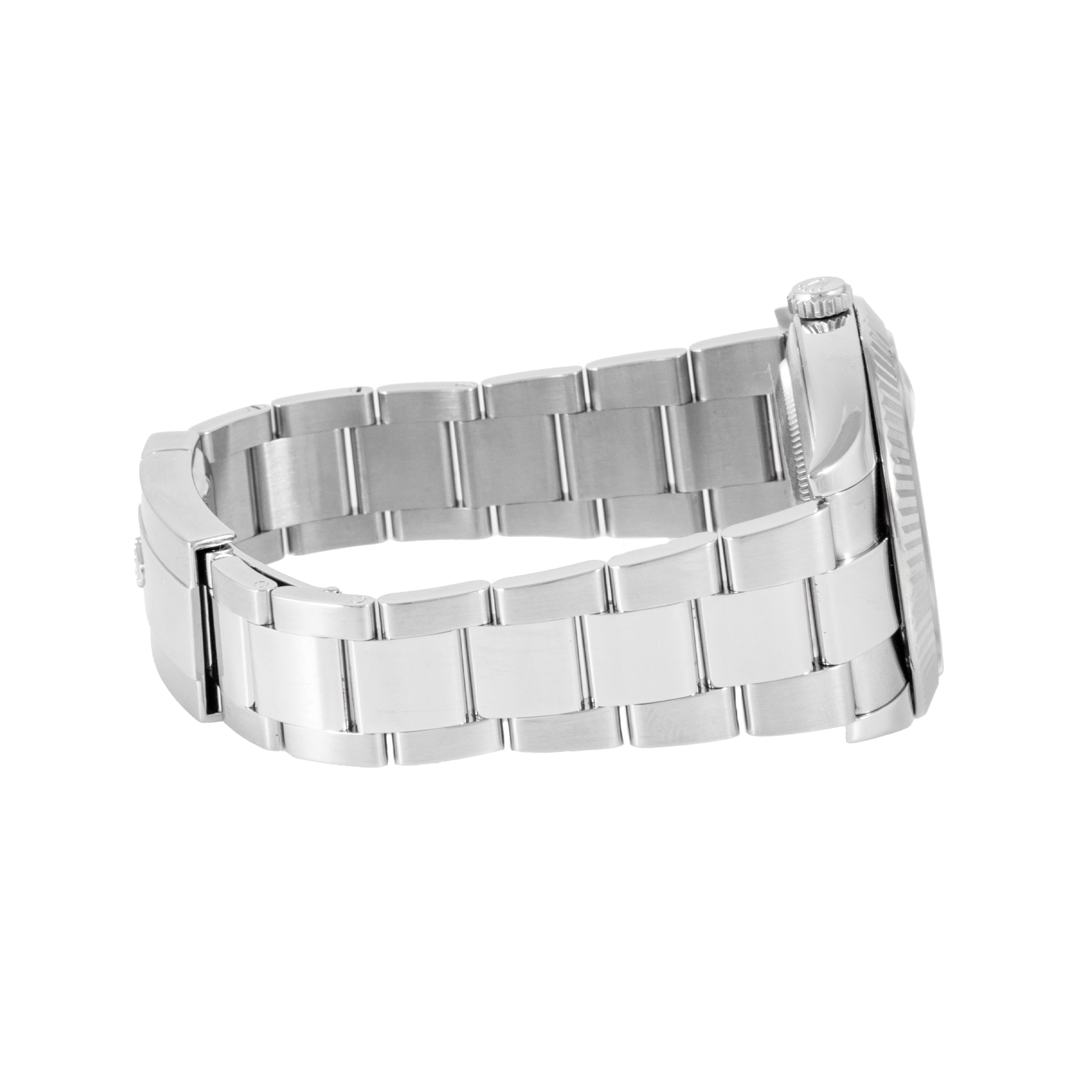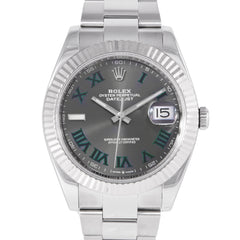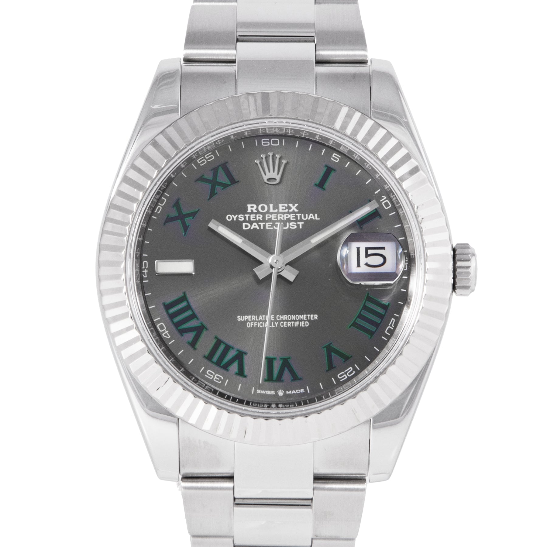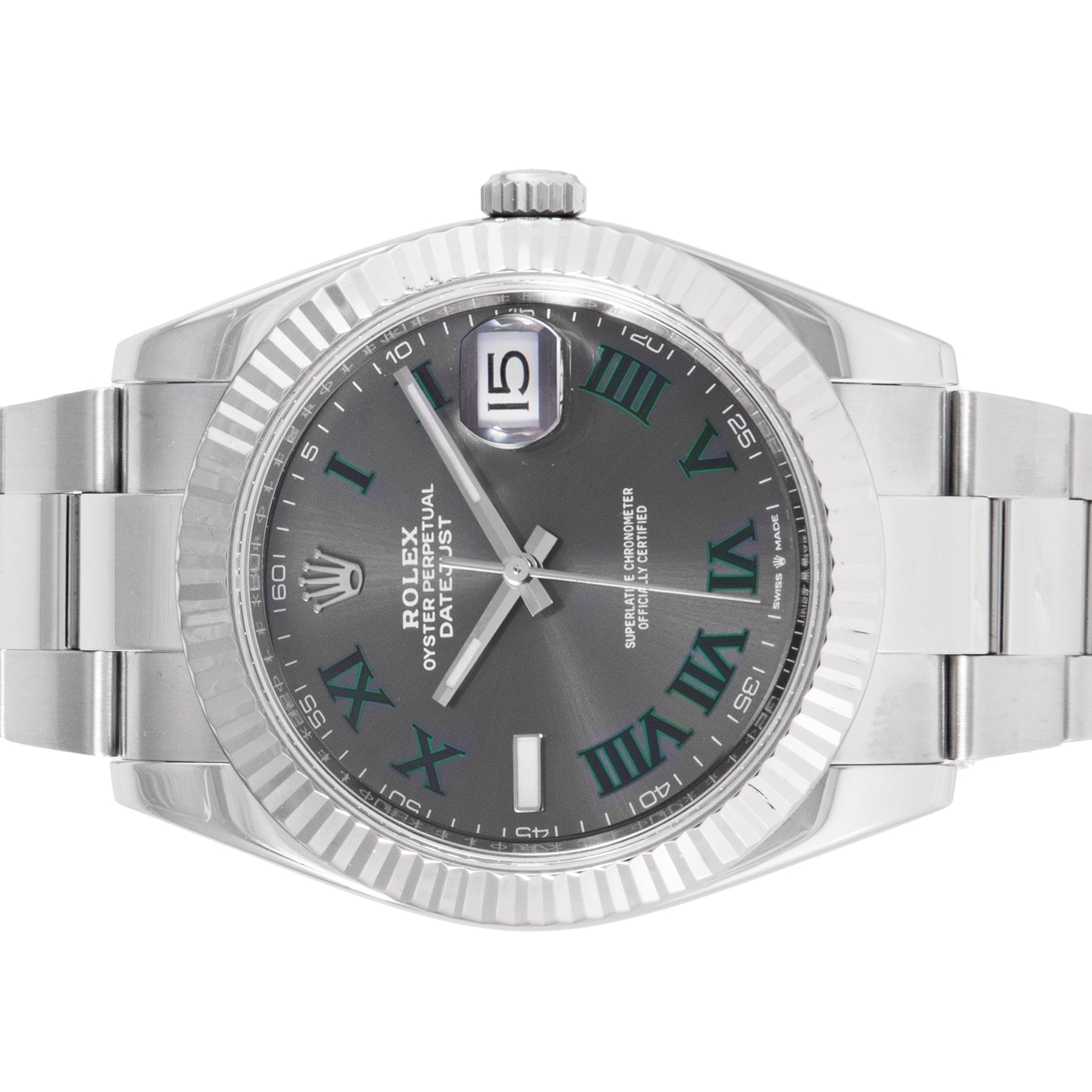 This Pre-owned Rolex Datejust 41mm, steel case, "Wimbledon" slate grey dial, white gold fluted bezel and steel oyster bracelet with 12 links is in excellent condition. Mechanised by Rolex calibre 3235 automatic movement. Includes box, Rolex sales warranty card dated June 2019 and 2 years Timepiece360 warranty.