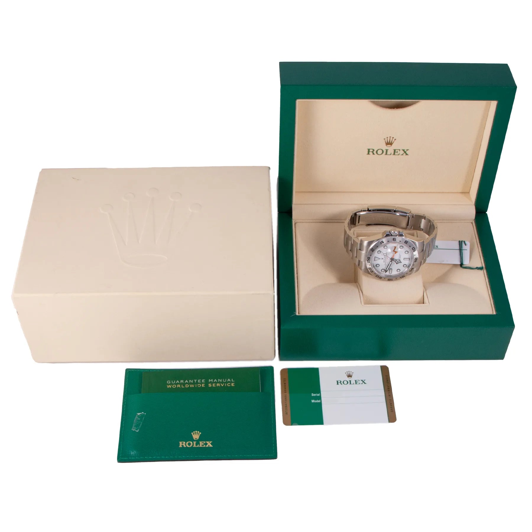 This Pre-owned Rolex Explorer II "Polar" 42mm, steel case, white dial, steel bezel and steel oyster bracelet with 12 links is in excellent condition. Mechanised by Rolex calibre 3187 automatic movement. Includes box, sales warranty card dated December 2017 and 2 years Timepiece360 warranty.