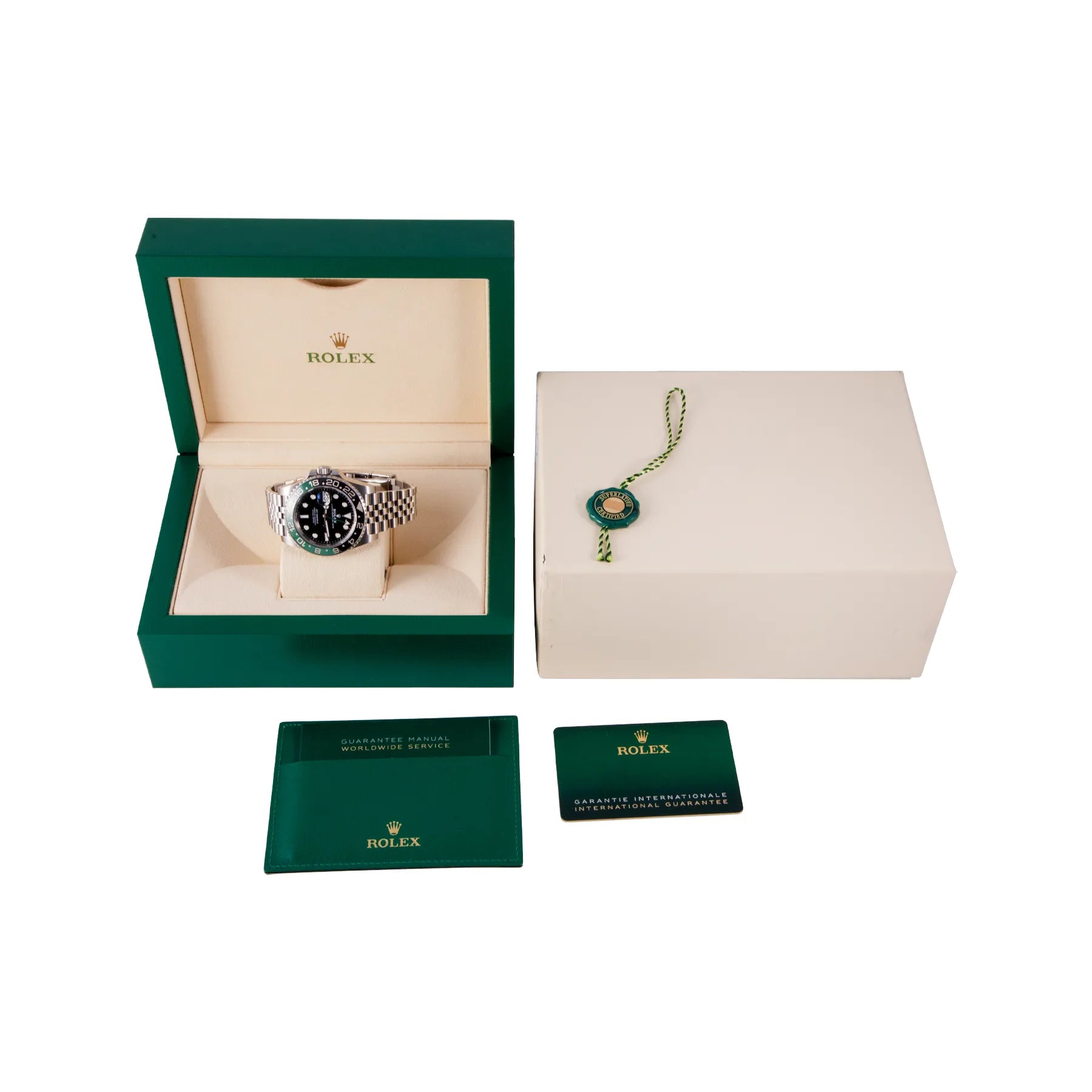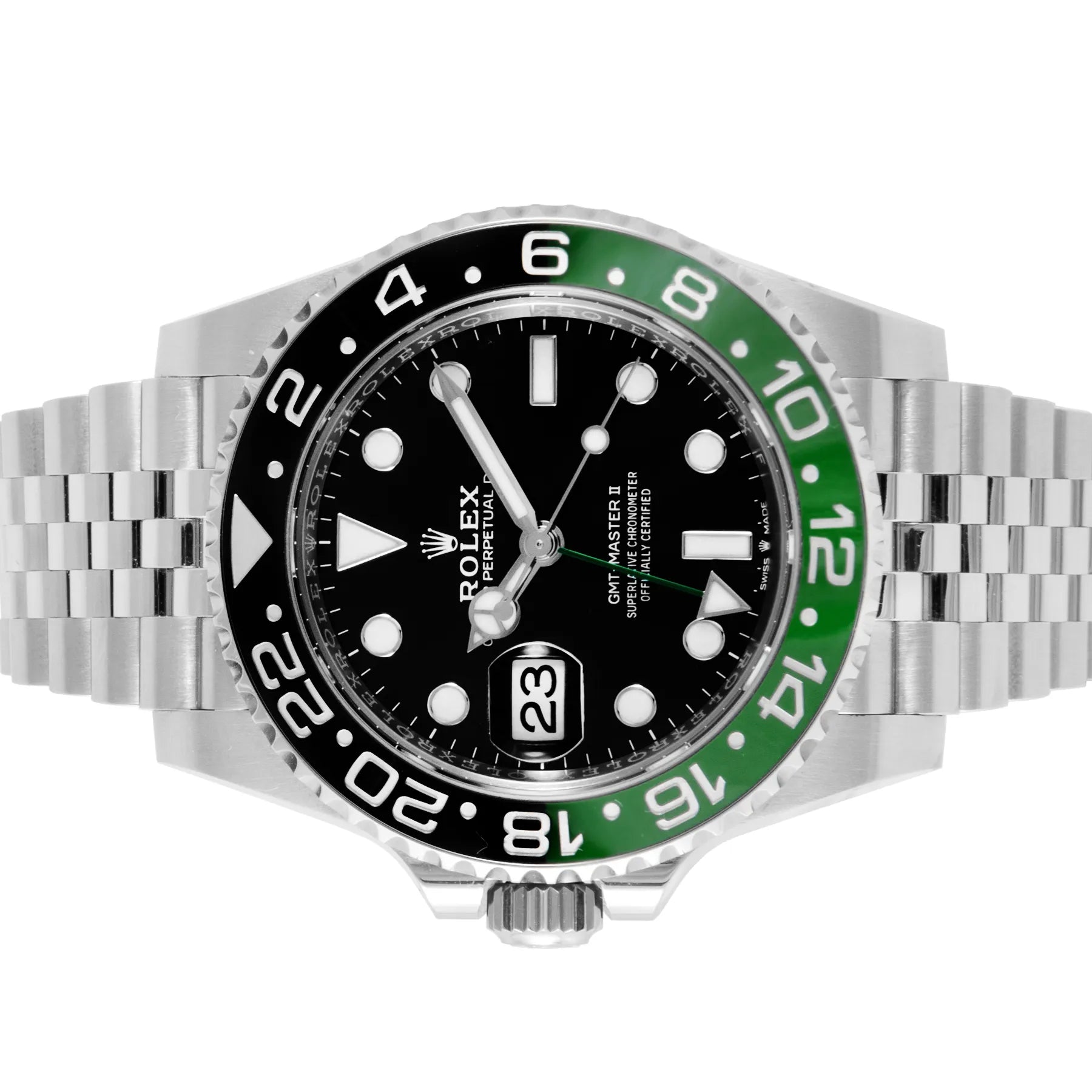 This Pre-owned Rolex GMT-Master II "Sprite" 40mm, steel case, black dial, ceramic bezel and steel jubilee bracelet with 17 links is in very good condition. Mechanised by Rolex calibre 3285 automatic movement. Includes box and sales warranty card dated February 2023.