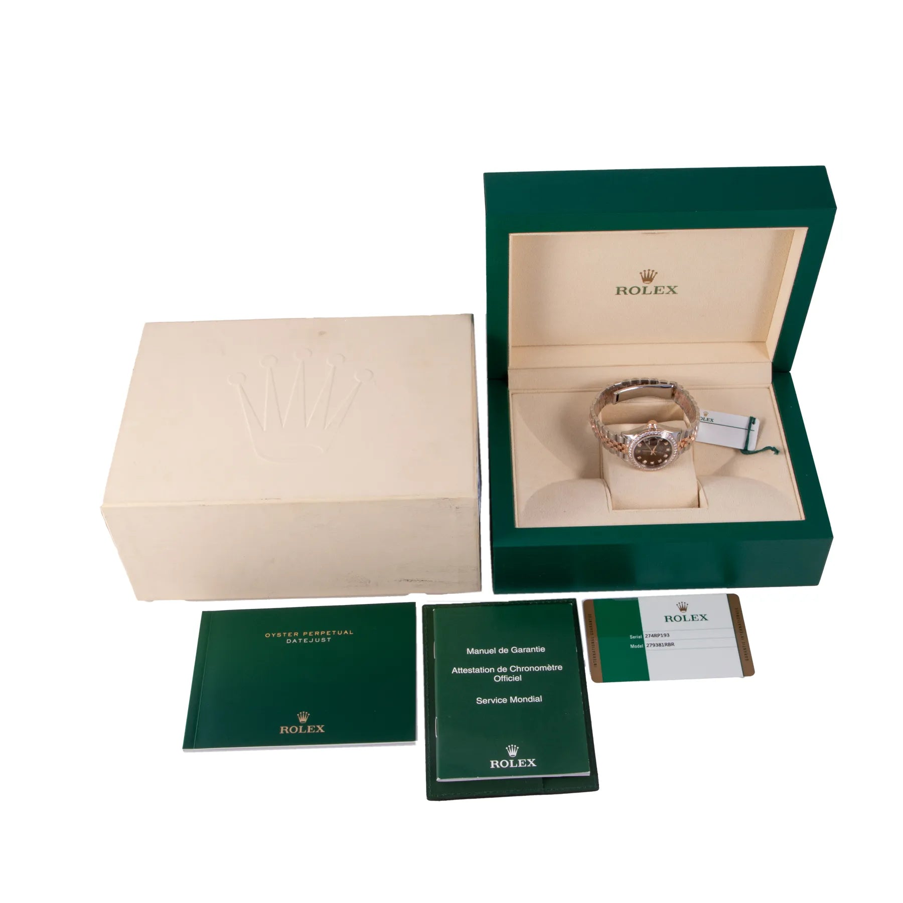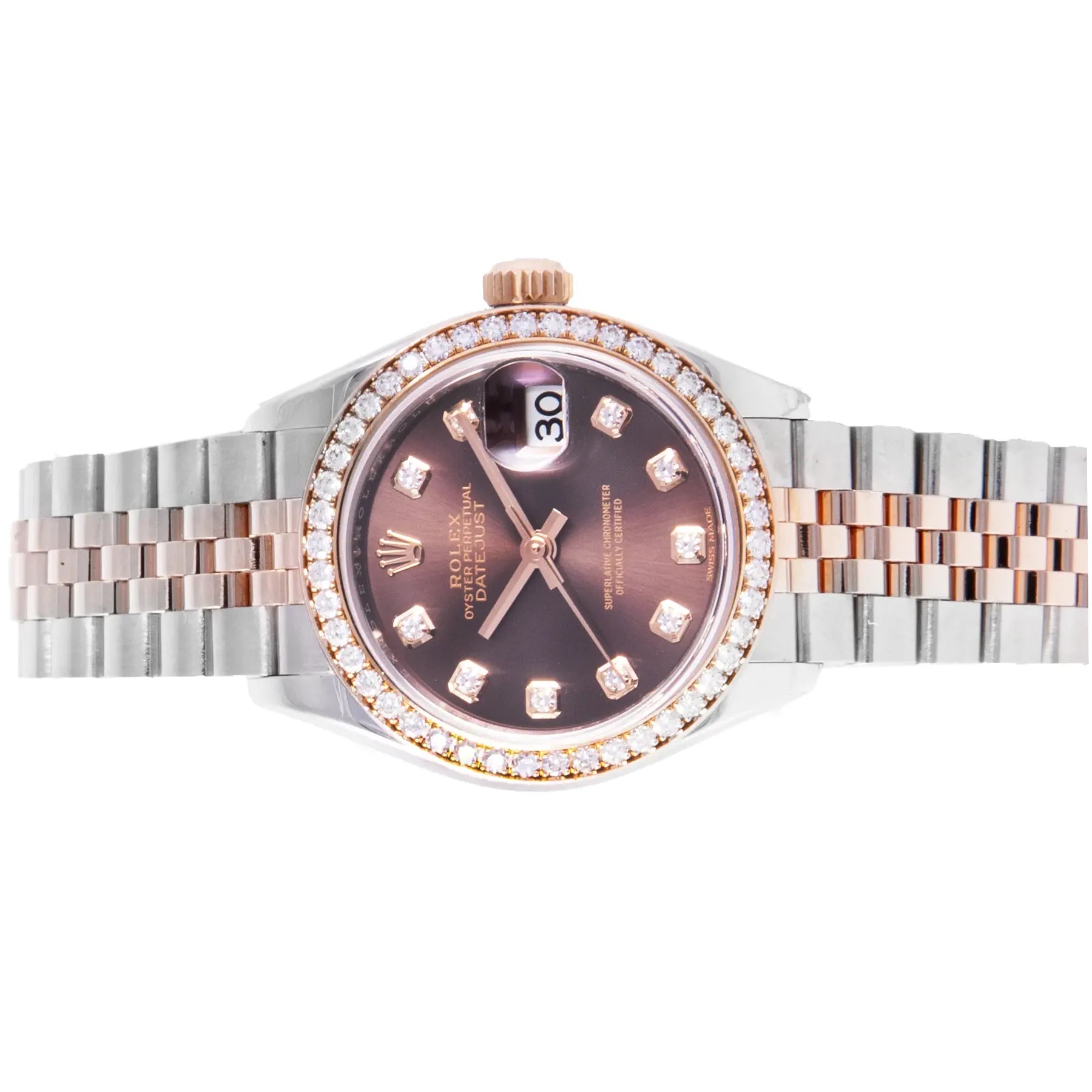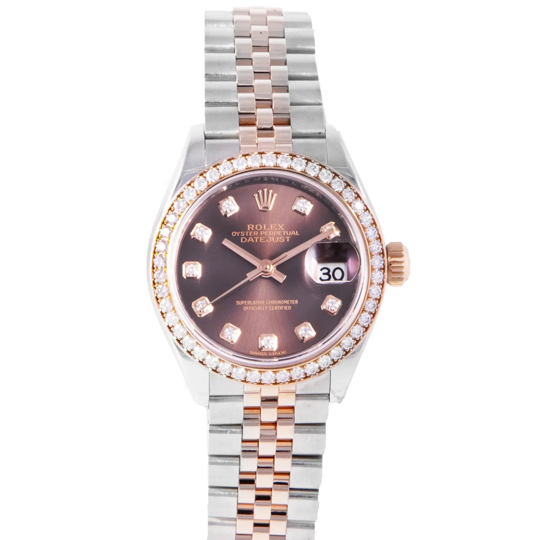 This Pre-owned Lady-Datejust 28mm, steel & rose gold case, chocolate diamond dial, diamond set on bezel and steel jubilee bracelet with 23 links is in excellent condition. Mechanised by Rolex calibre 2236 automatic movement. Includes box, sales warranty card dated March 2017, and 2 years Timepiece360 warranty.