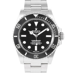 This Pre-owned Rolex Submariner No Date 41mm, steel case, black dial, ceramic bezel and steel oyster bracelet with 11 links is in excellent condition. Mechanised by Rolex calibre 3230 automatic movement. Includes box and Rolex sales warranty card dated October 2024.
