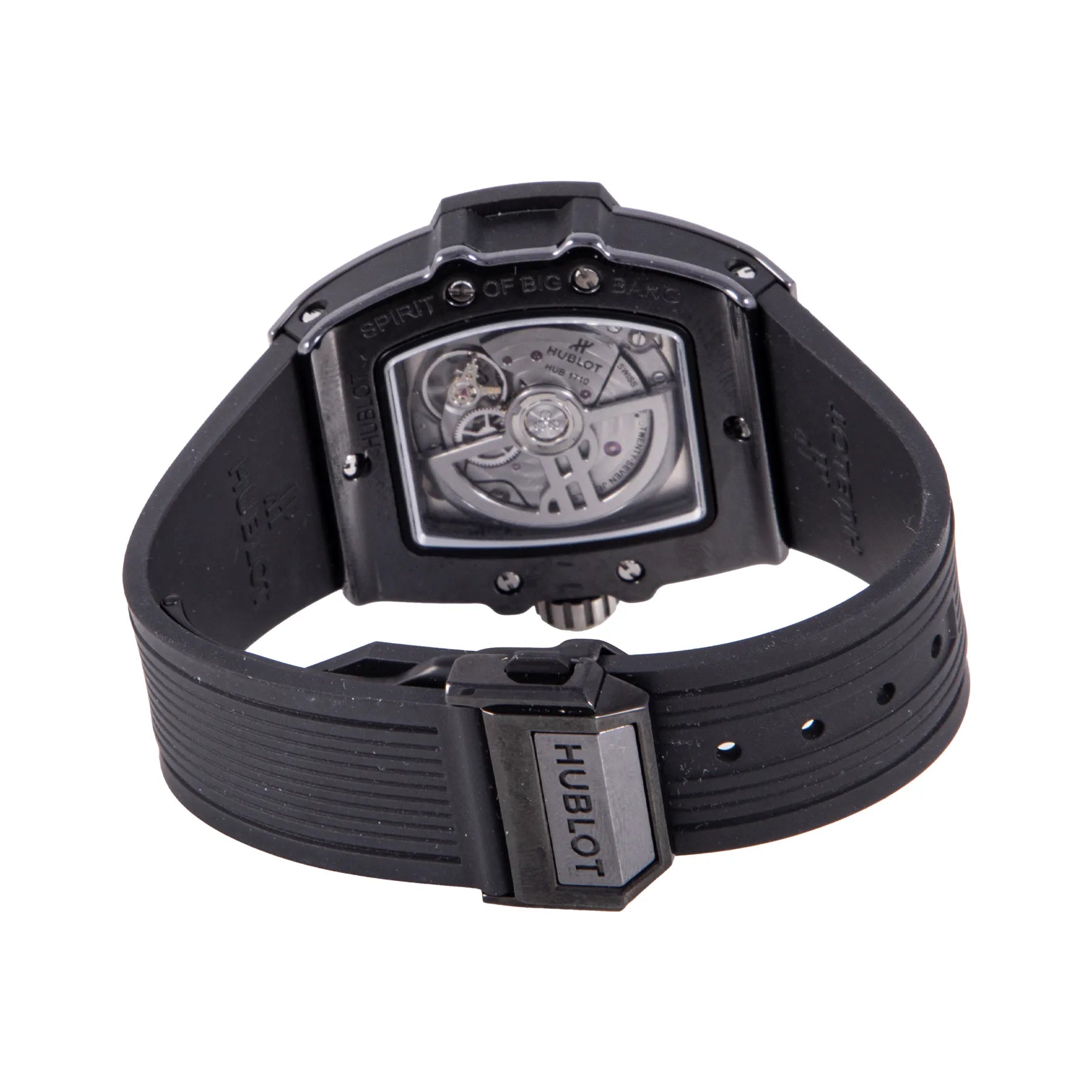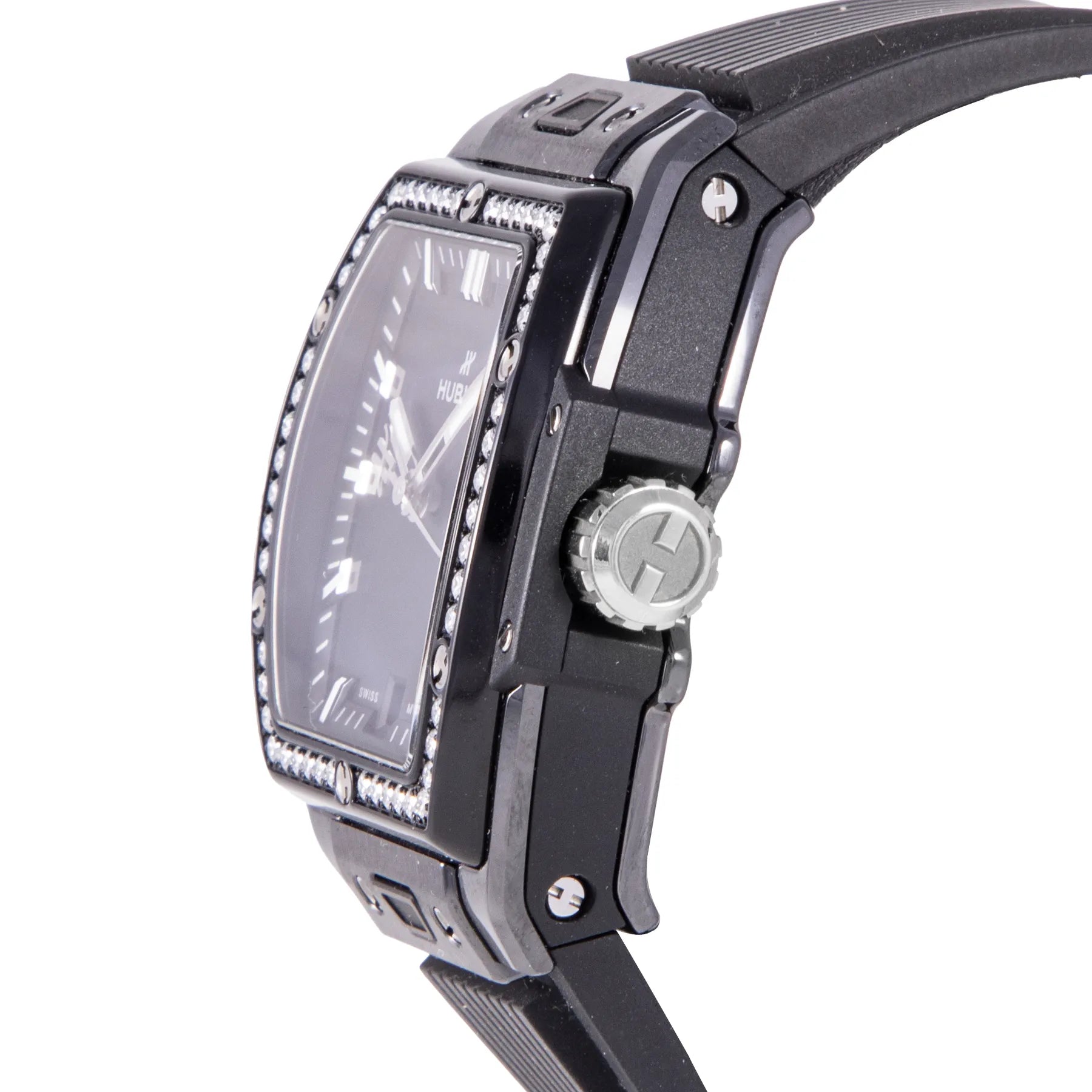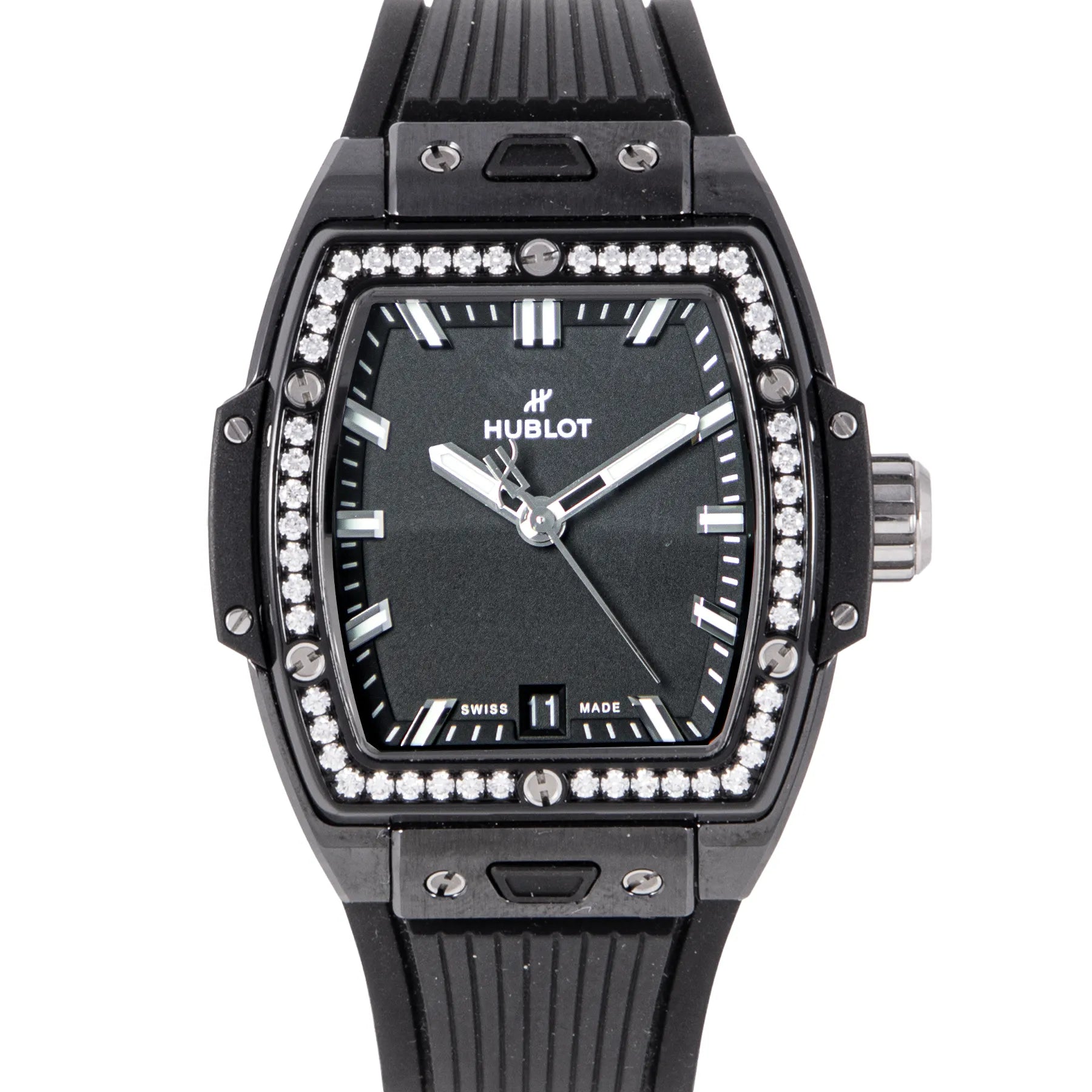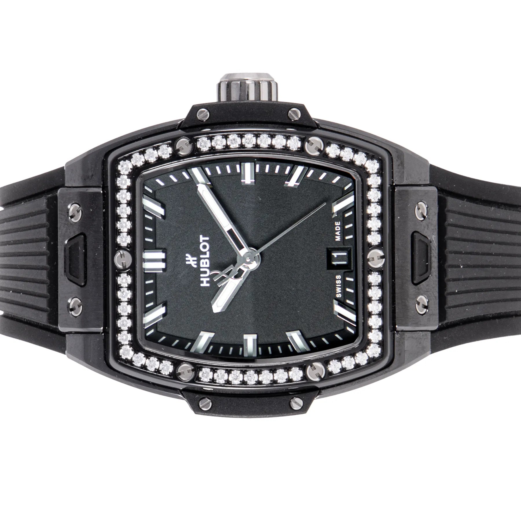 This Pre-owned Hublot Spirit of Big Bang 43mm, ceramic case, black dial, diamonds set on bezel and black rubber strap is in excellent condition. Mechanised by Hublot calibre HUB1710 automatic movement. Includes box only and 2 years Timepiece360 warranty.