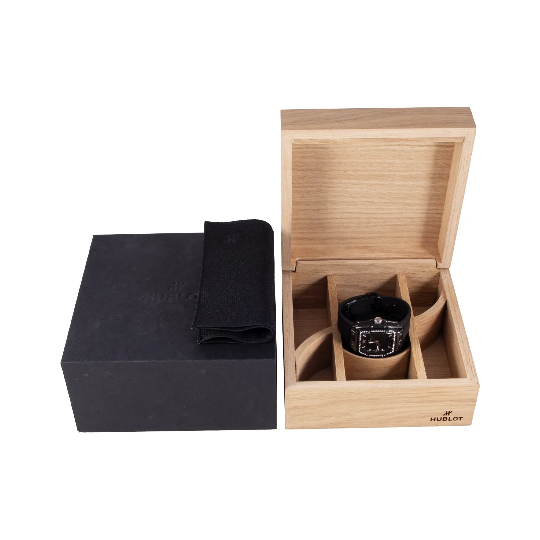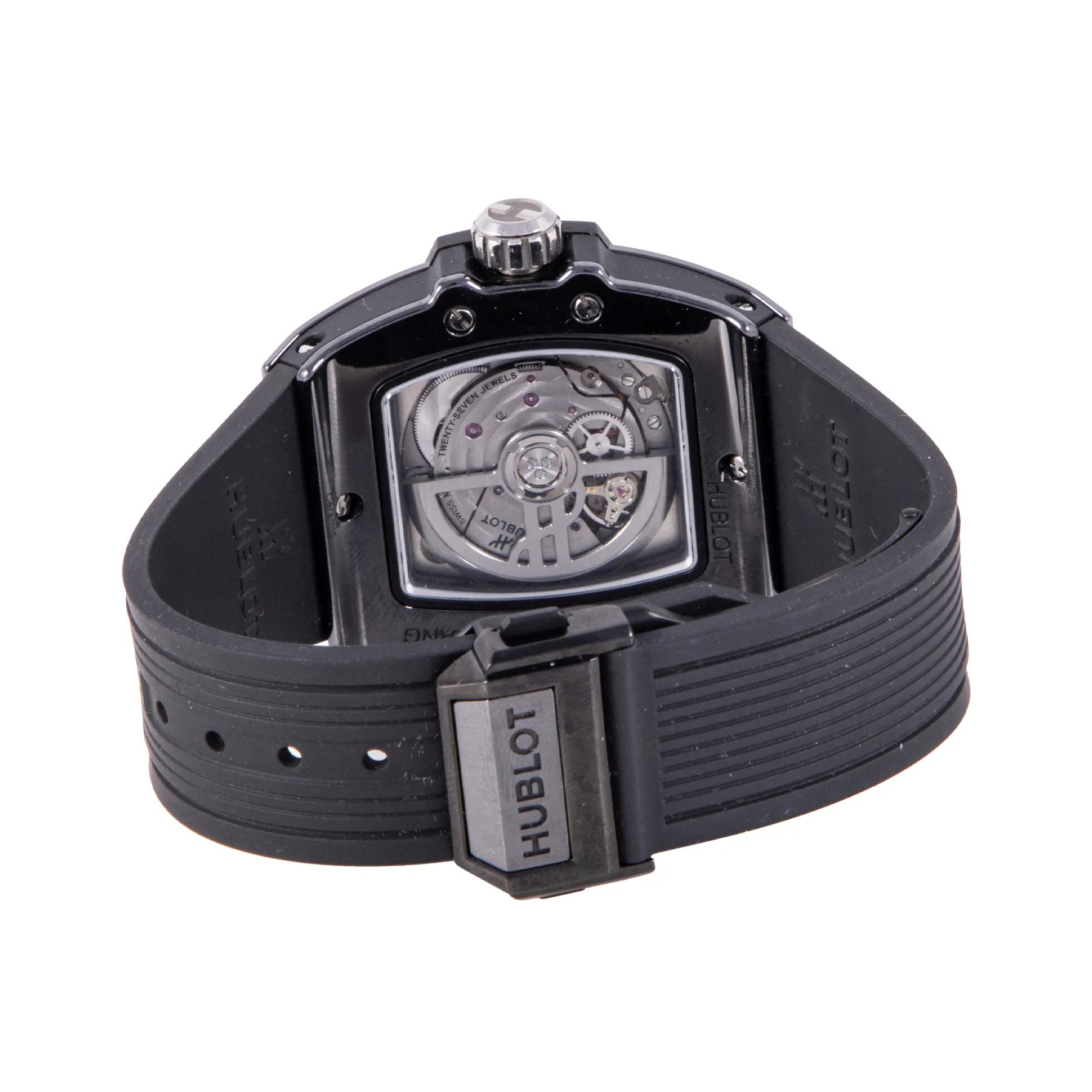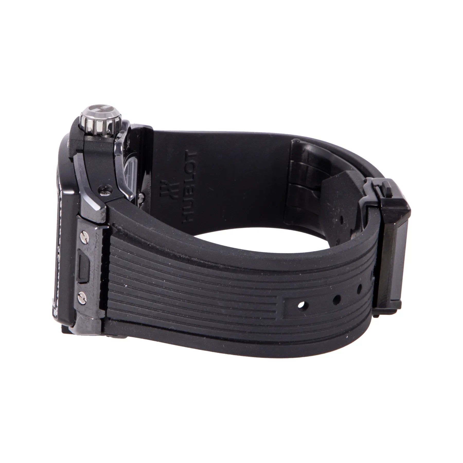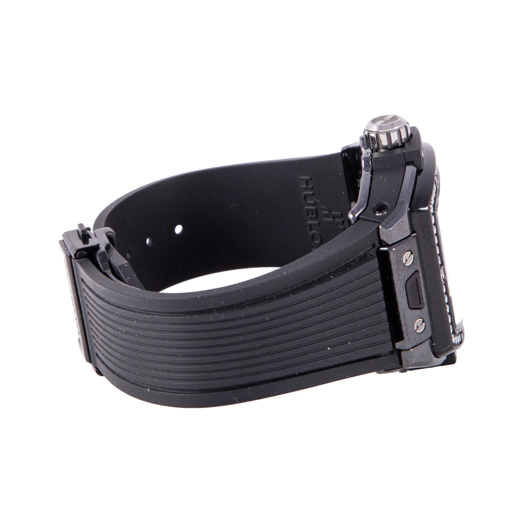 This Pre-owned Hublot Spirit of Big Bang 43mm, ceramic case, black dial, diamonds set on bezel and black rubber strap is in excellent condition. Mechanised by Hublot calibre HUB1710 automatic movement. Includes box only and 2 years Timepiece360 warranty.