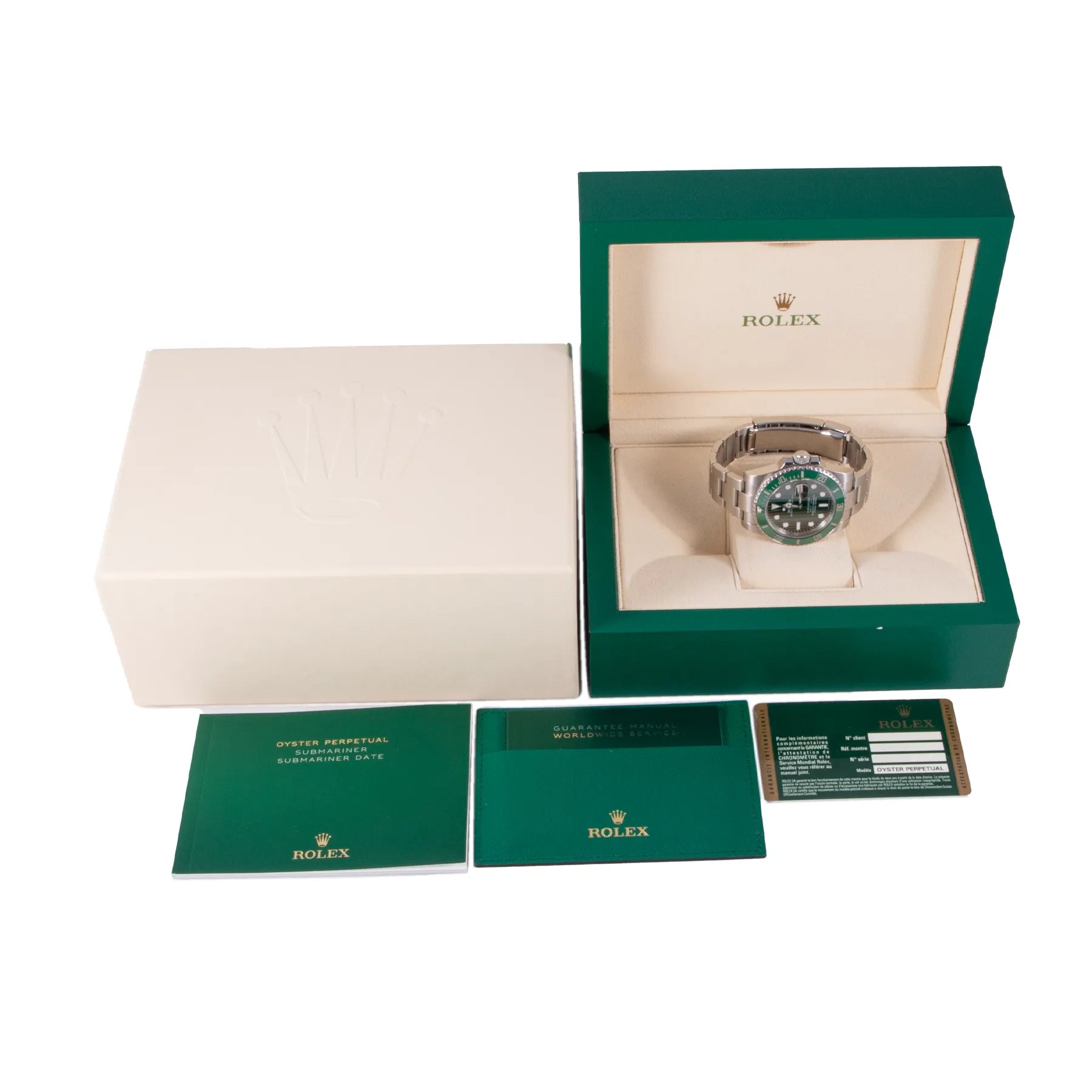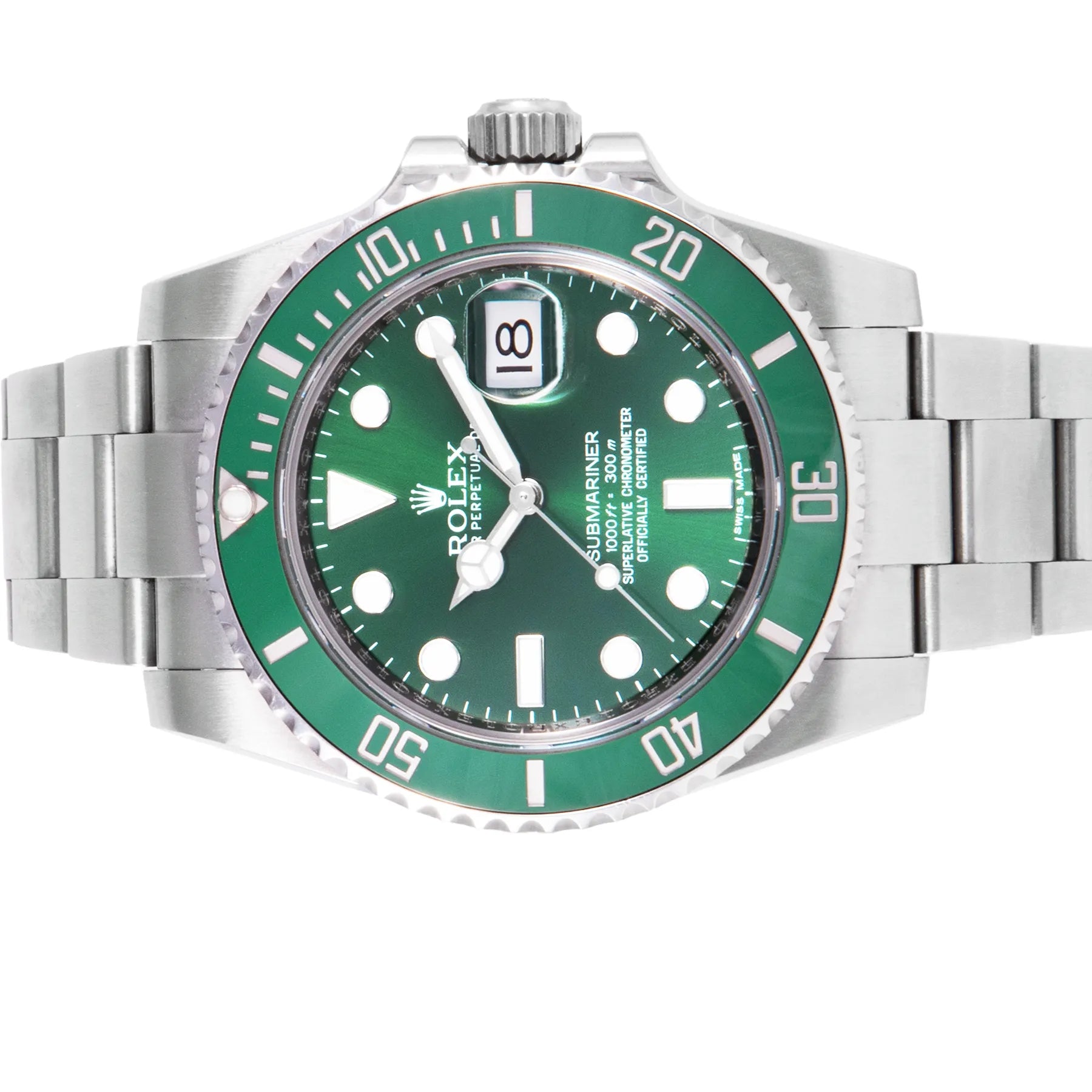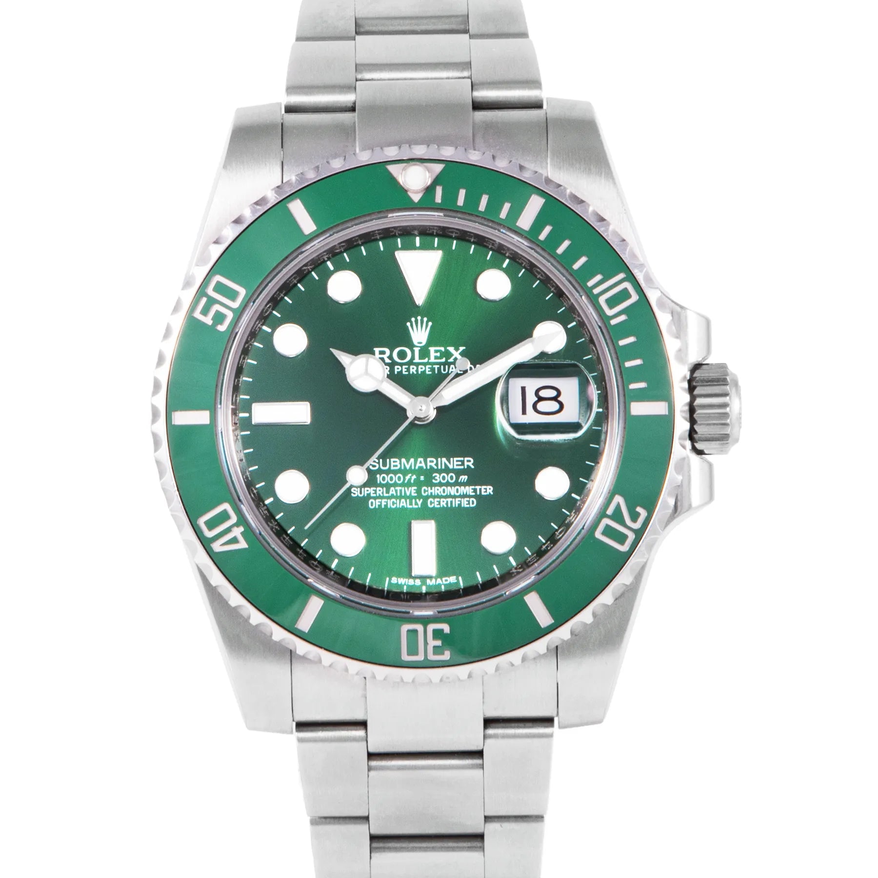 This Pre-owned Rolex Submariner Date "Hulk" 40mm, steel case, green dial, ceramic bezel and steel oyster bracelet with 10.5 links is in very good condition. Mechanised by Rolex calibre 3135 automatic movement. Includes box, Rolex sales warranty card dated February 2013 and 2 years Timepiece360 warranty.