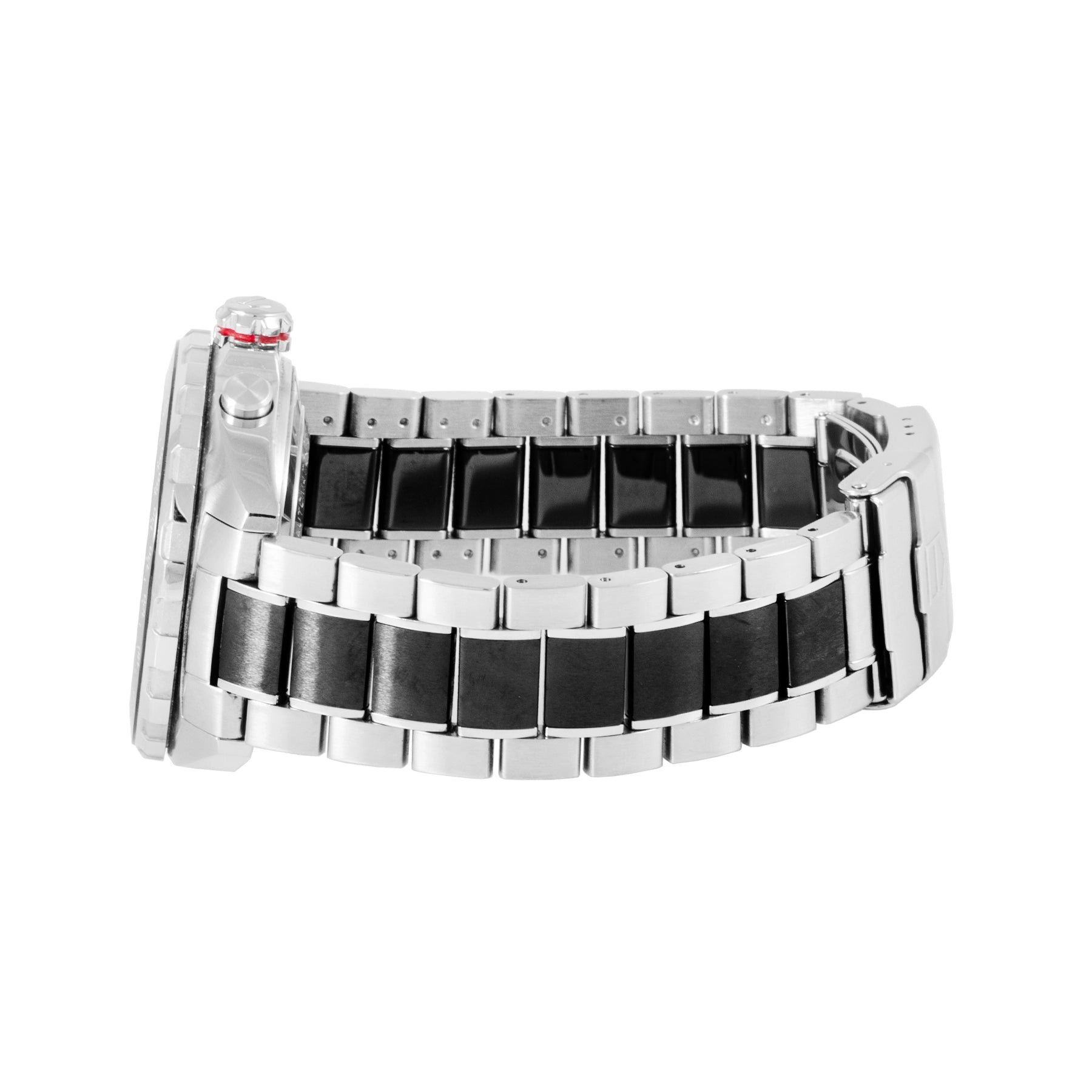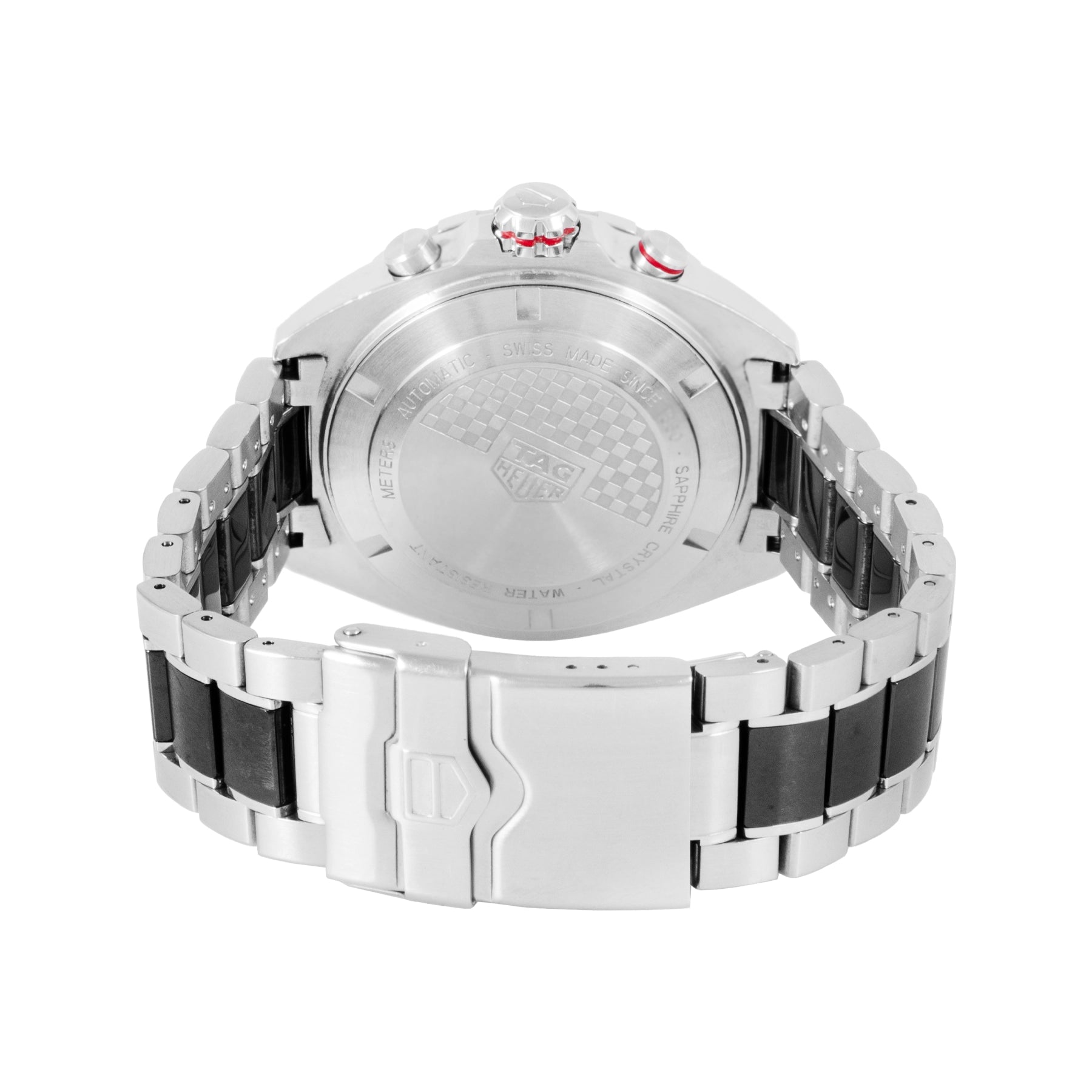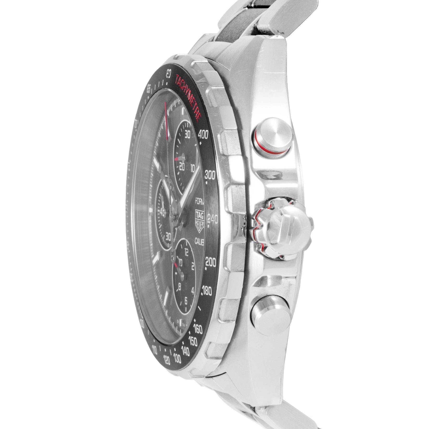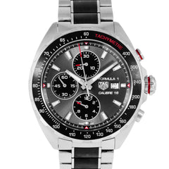 This Pre-owned TAG Heuer Formula 1 Chronograph 44mm, steel case, grey dial, ceramic bezel and steel & ceramic bracelet with 12 links is in excellent condition. Mechanised by TAG Heuer calibre 16 automatic movement. Includes box and undated sales warranty card and 2 years Timepiece360 warranty.
