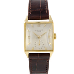 This Pre-owned Patek Philippe Vintage 36mm x 26mm, yellow gold case, silver dial, yellow gold bezel and brown leather strap is in very good condition. Mechanised by Patek Philippe manual winding movement. The watch dates from circa 1948–1953. Includes invoice copy of service done dated January 2025 and 2 years Timepiece360 warranty.