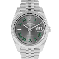 This Rolex Datejust "Wimbledon" 41mm steel case, grey roman dial, fluted white gold bezel and steel jubilee bracelet with 20 links in an unworn condition. Mechanised by Rolex calibre 3235 automatic movement. Includes box and Rolex sales warranty card dated August 2025.