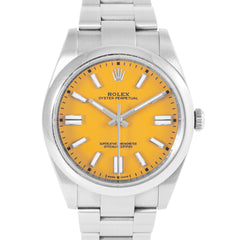 This Pre-owned Rolex Oyster Perpetual 41mm, steel case, yellow dial, steel bezel and steel bracelet with 11 links is in very good condition. Mechanized by Rolex calibre 3230 automatic movement. Includes box, Rolex sales warranty card dated May 2021, and 2 years Timepiece360 warranty.