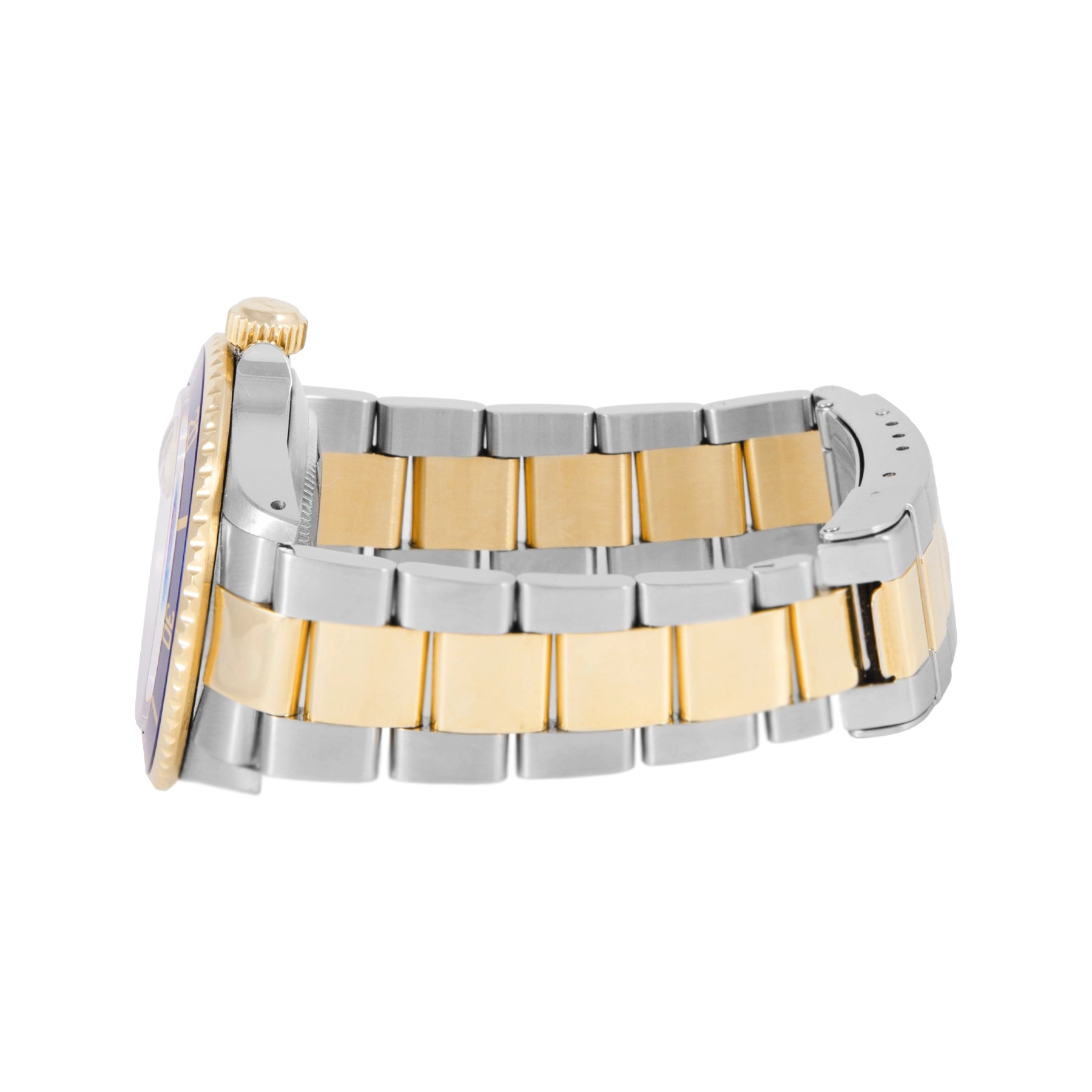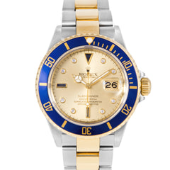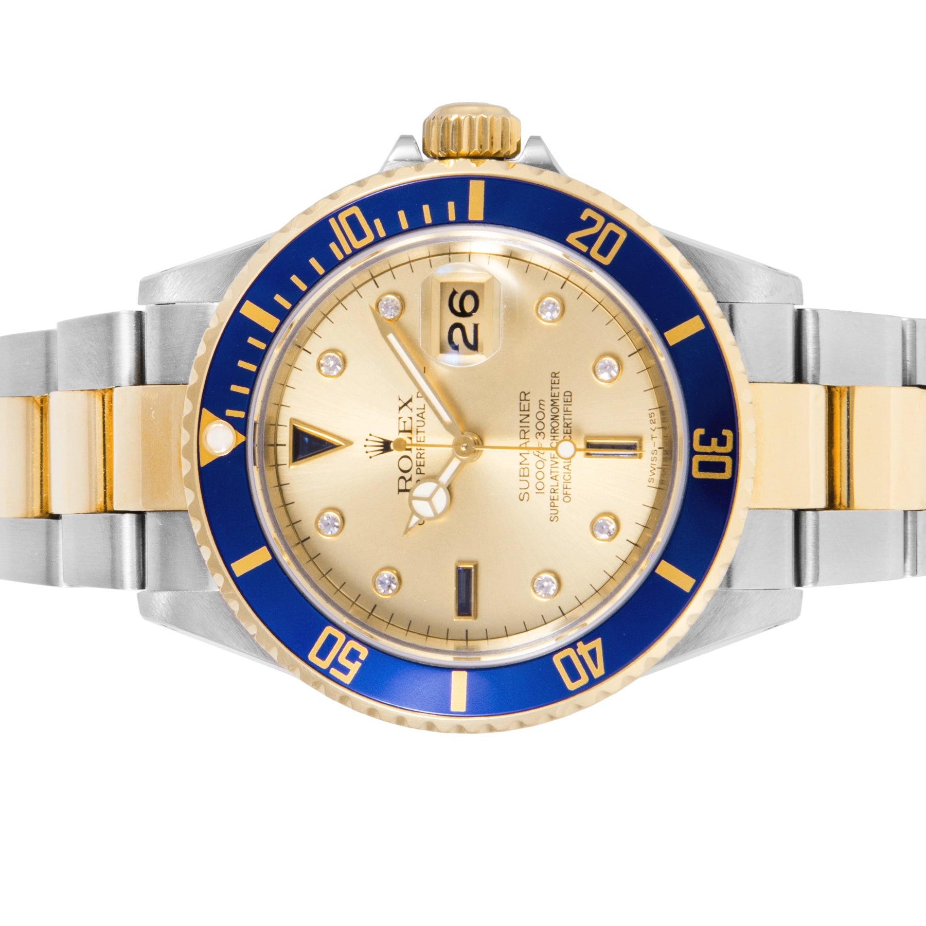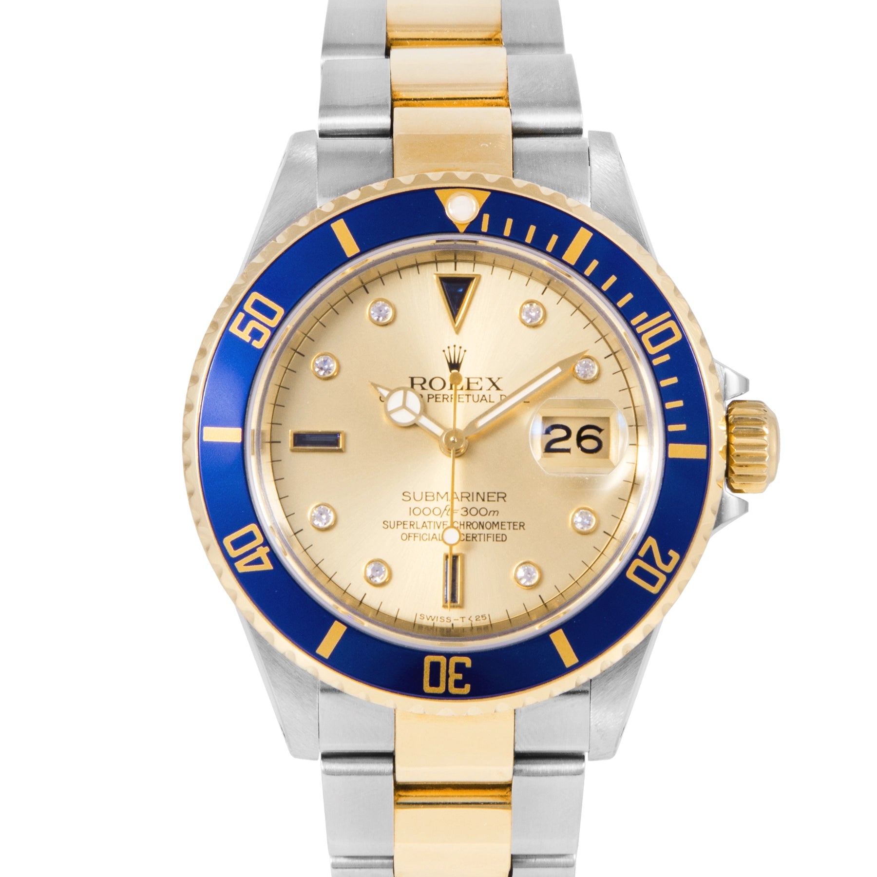 This Pre-owned Rolex Submariner Date 40mm, steel & yellow gold case, champagne diamond dial, aluminium bezel and steel & yellow gold bracelet with 10 links is in very good condition. The year of production is 1990 as determined by the serial number starting with "E". Mechanised by Rolex calibre 3135 automatic movement. Includes box and 2 years Timepiece360 warranty.