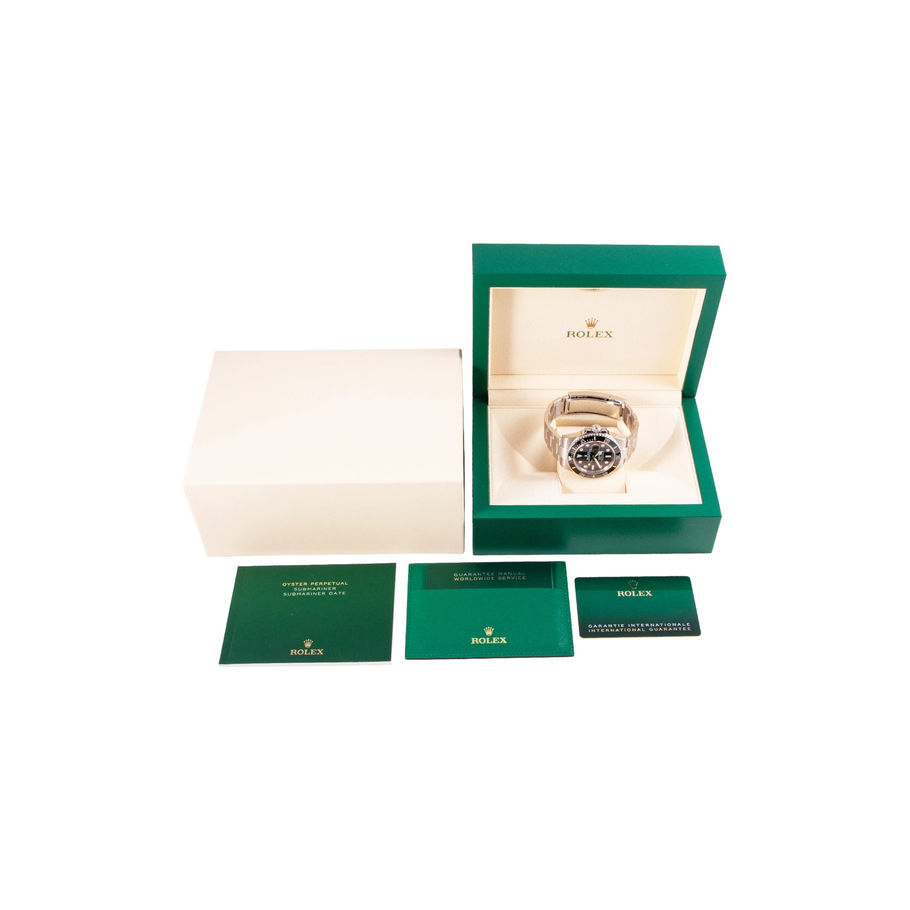 This Rolex Submariner Date 41mm, steel case, black dial, ceramic bezel and steel oyster bracelet with 11 links in unworn condition. Mechanised by Rolex calibre 3235 automatic movement. Includes box and Rolex sales warranty card dated January 2026.