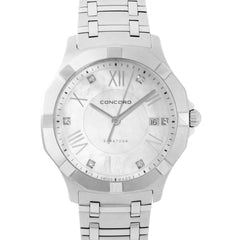 This Concord Saratoga 40mm, steel case, mother of pearl diamond dial, steel bezel and steel bracelet with 17 links in an unworn condition. Mechanized by Concord quartz movement. Includes box, Concord sales warranty card dated December 2015 and 2 years Timepiece360 warranty.