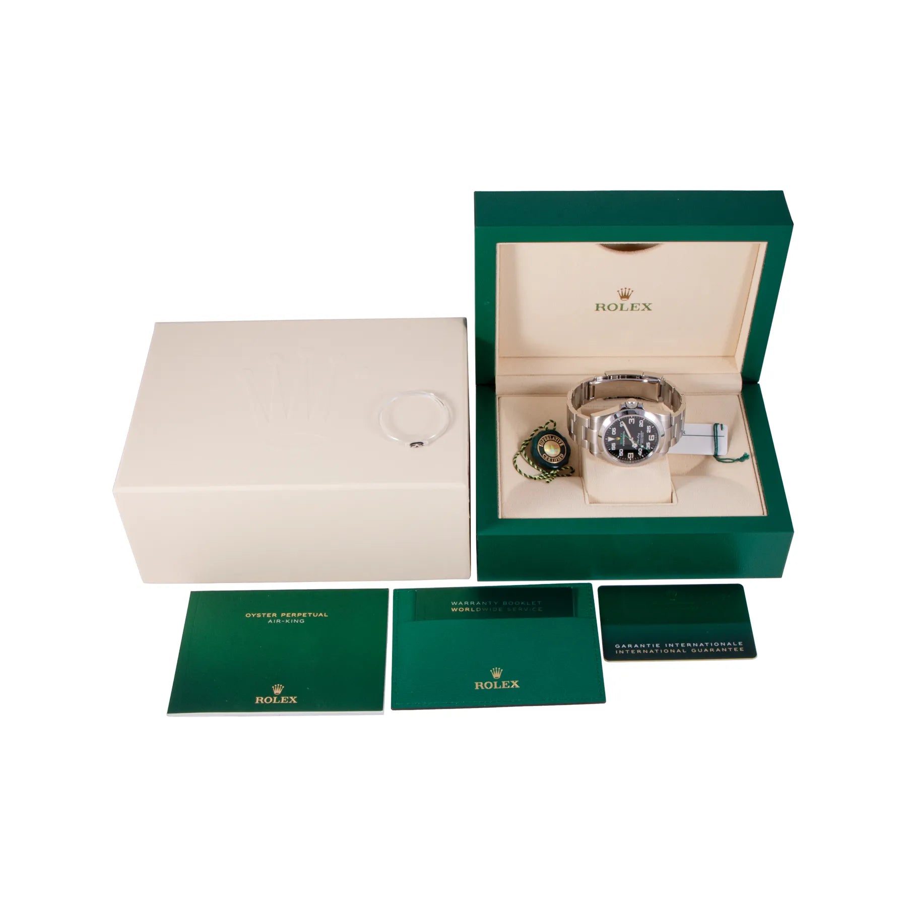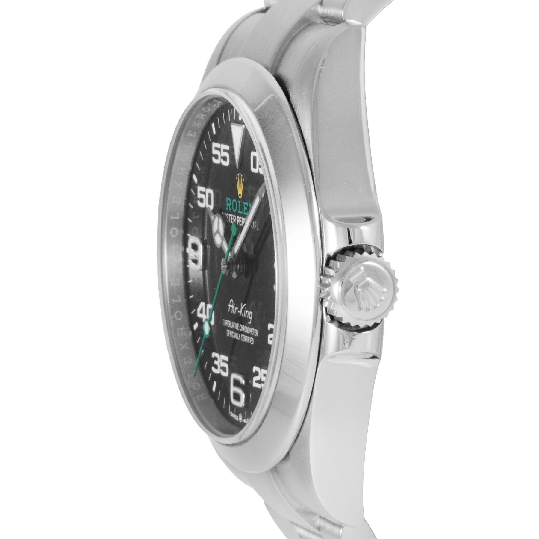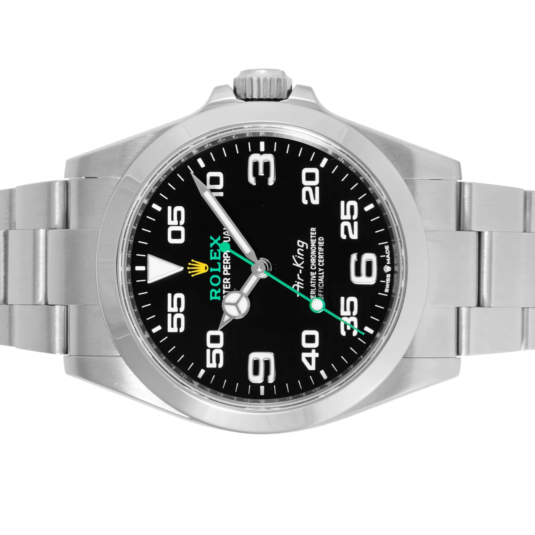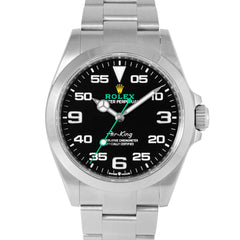This Pre-owned Rolex Air-King 40mm, steel case, black dial, steel bezel and steel oyster bracelet with 12 links is in excellent condition. Mechanised by Rolex calibre 3230 automatic movement. Includes box and sales warranty card dated June 2022.