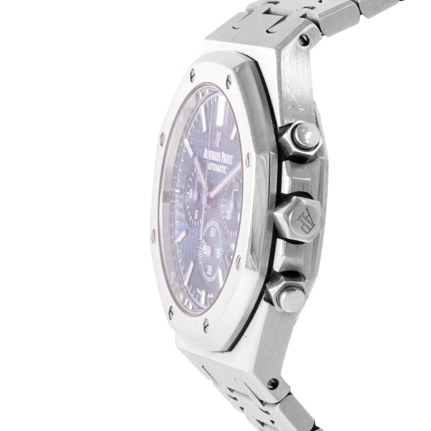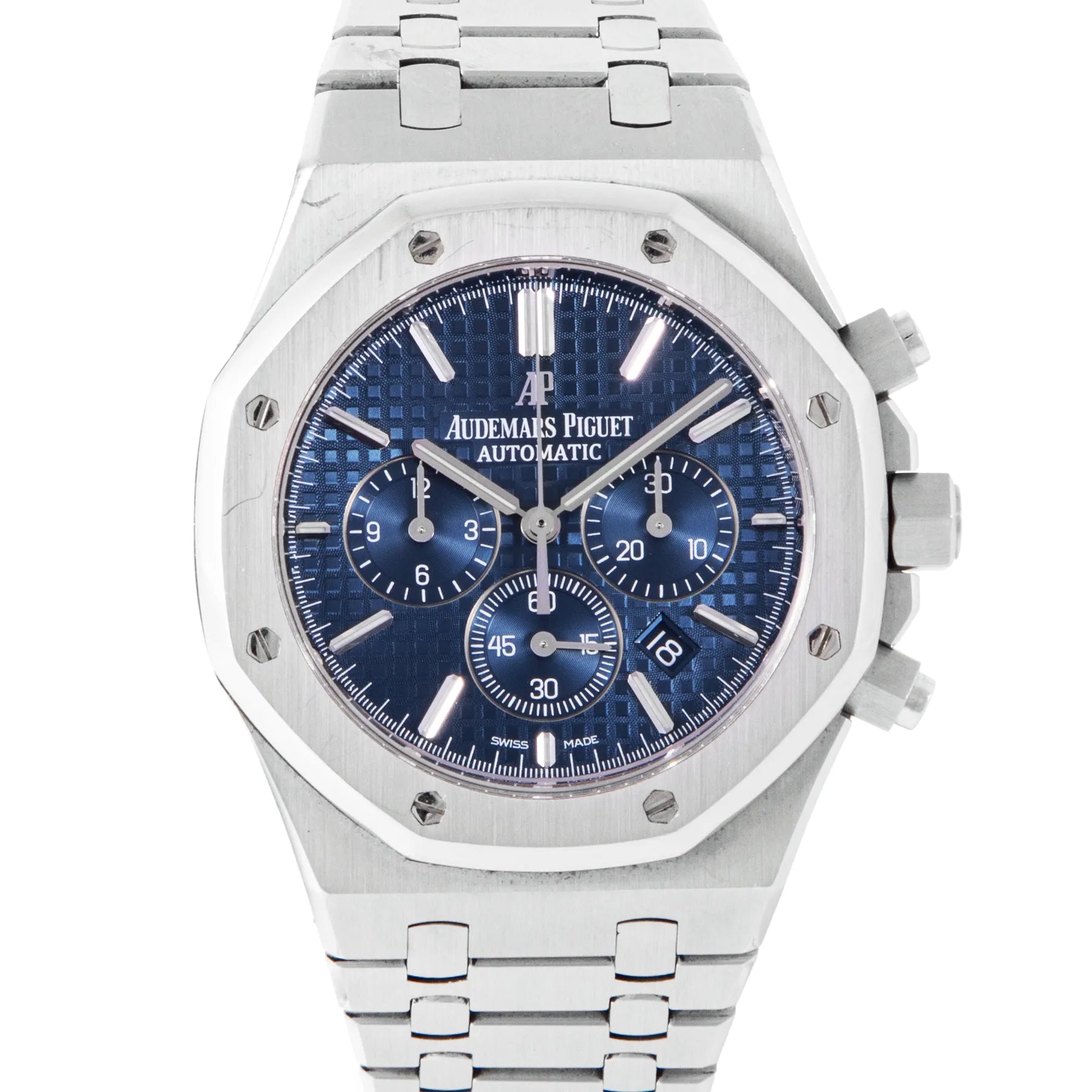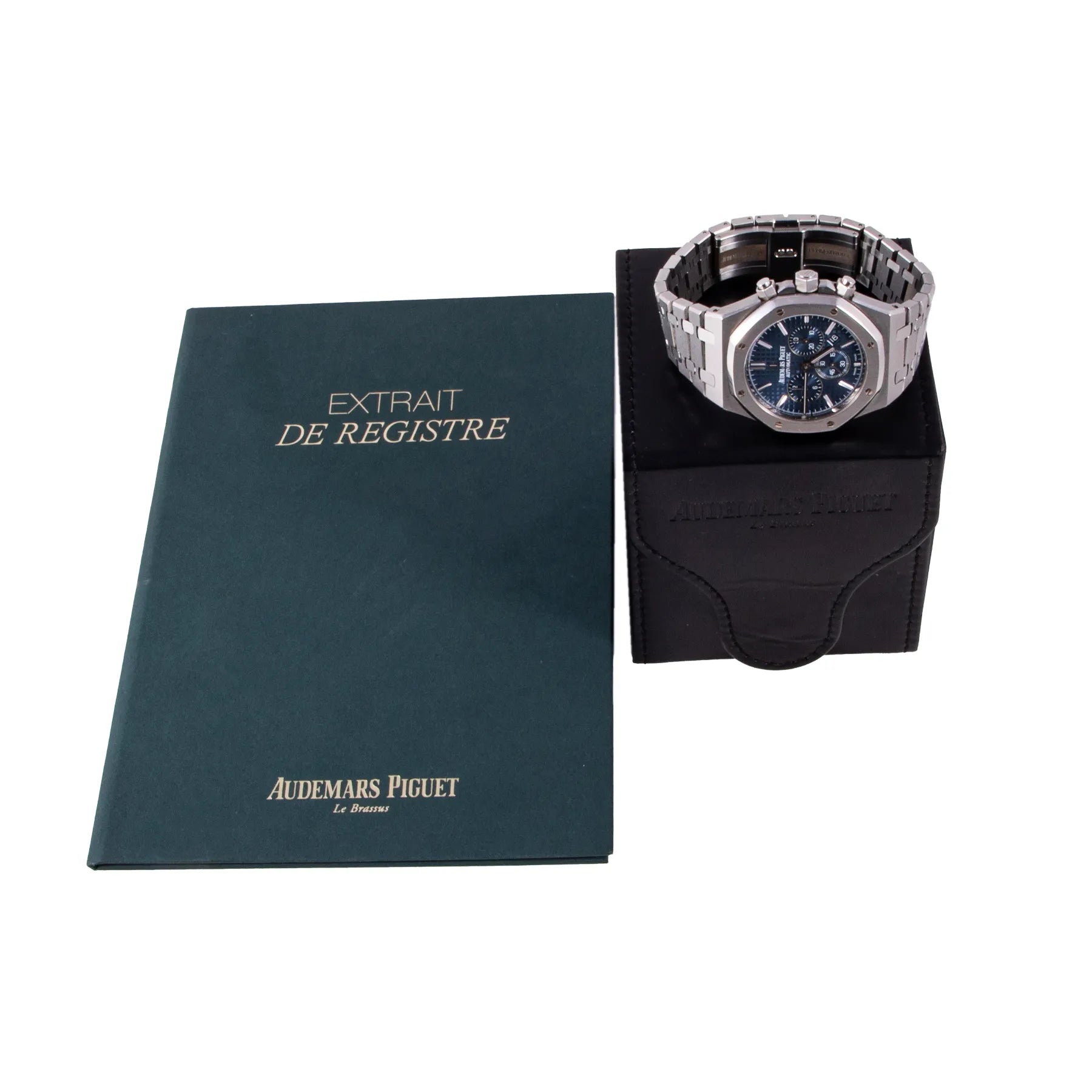 This Pre-owned Audemars Piguet Royal Oak Chronograph 41mm, steel case, blue dial, steel bezel and steel bracelet with 20 links is in very good condition. Mechanised by Audemars Piguet calibre 2385 automatic movement. Includes AP Pouch, sales warranty card dated April 2015 and 2 years Timepiece360 warranty.
