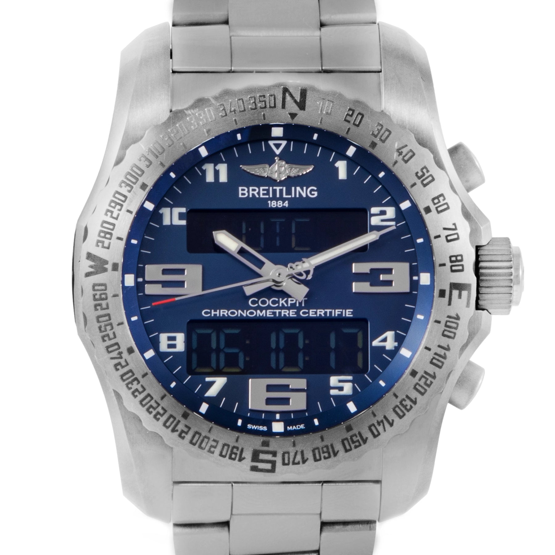 This Pre-owned Breitling Cockpit B50 46mm, titanium case, blue digital dial, titanium bezel and titanium bracelet with 9 links is in excellent condition. Mechniased by Breitling calibre 50 quartz movement. Includes box, charger, sales warranty card dated April 2018 and 2 years Timepiece360 warranty.