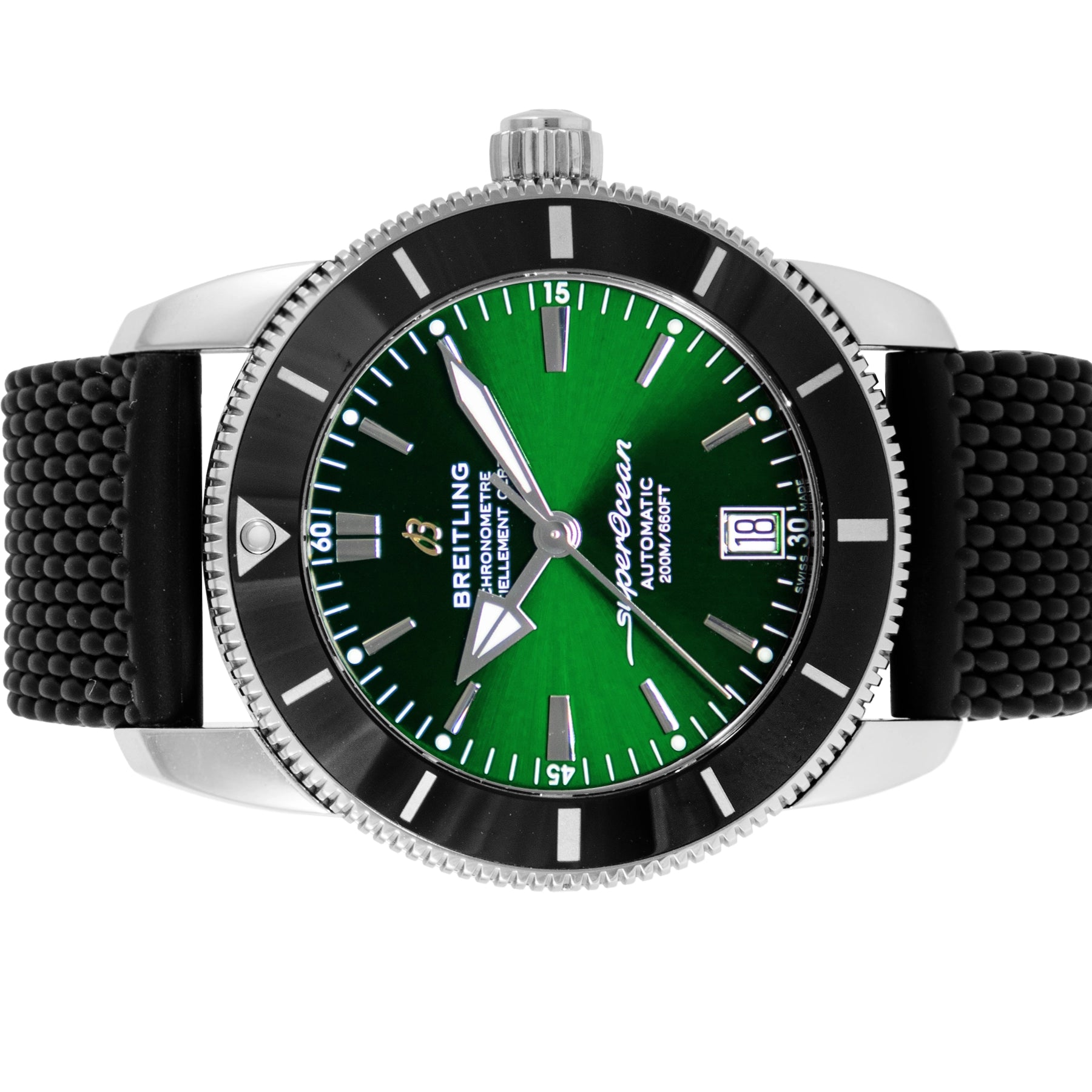 This Pre-owned Breitling Superocean Heritage B20 42mm, steel case, green dial, ceramic bezel and black rubber strap in very good condition. Mechanised by Breitling calibre B20 automatic movement. Includes Breitling sales warranty card valid until August 2027.