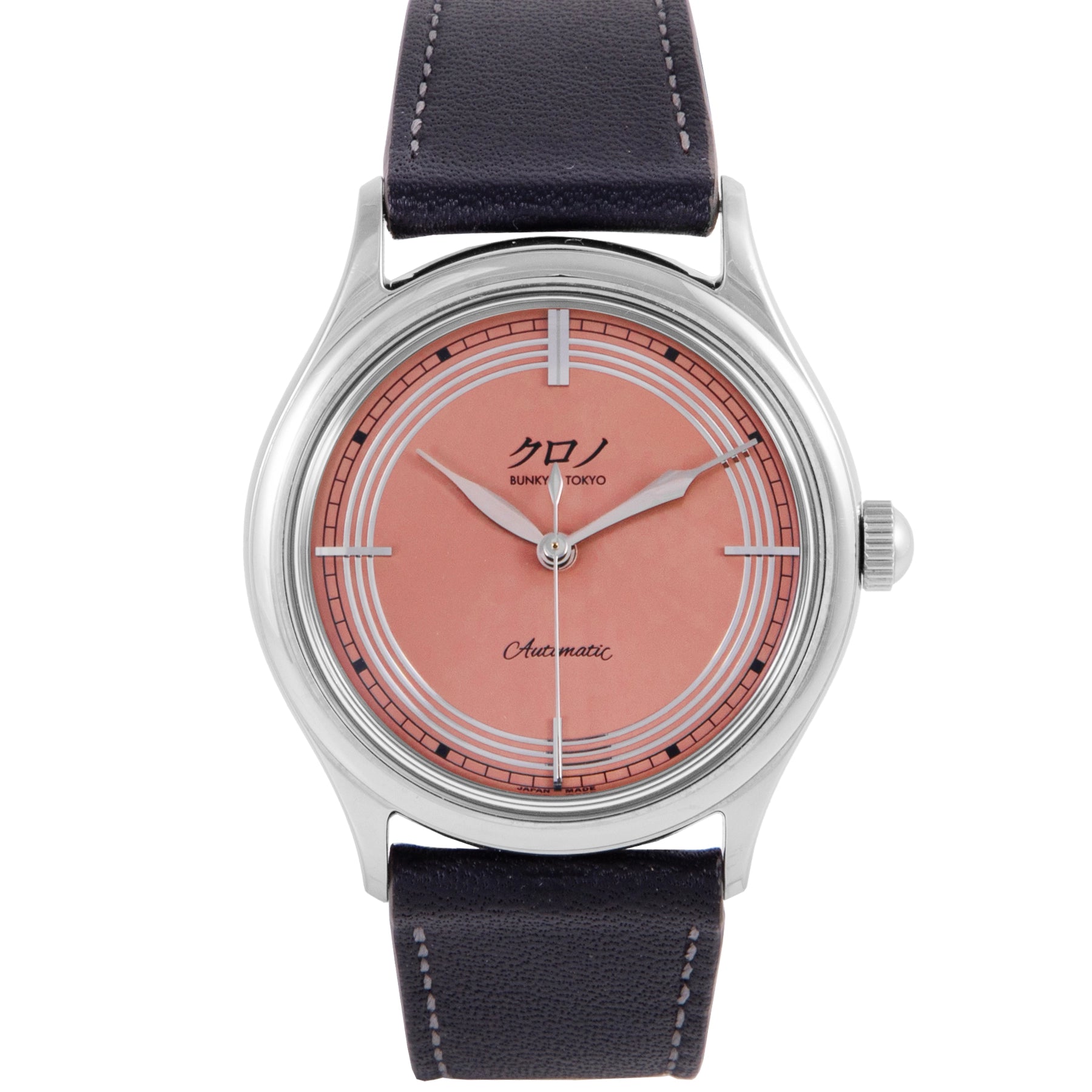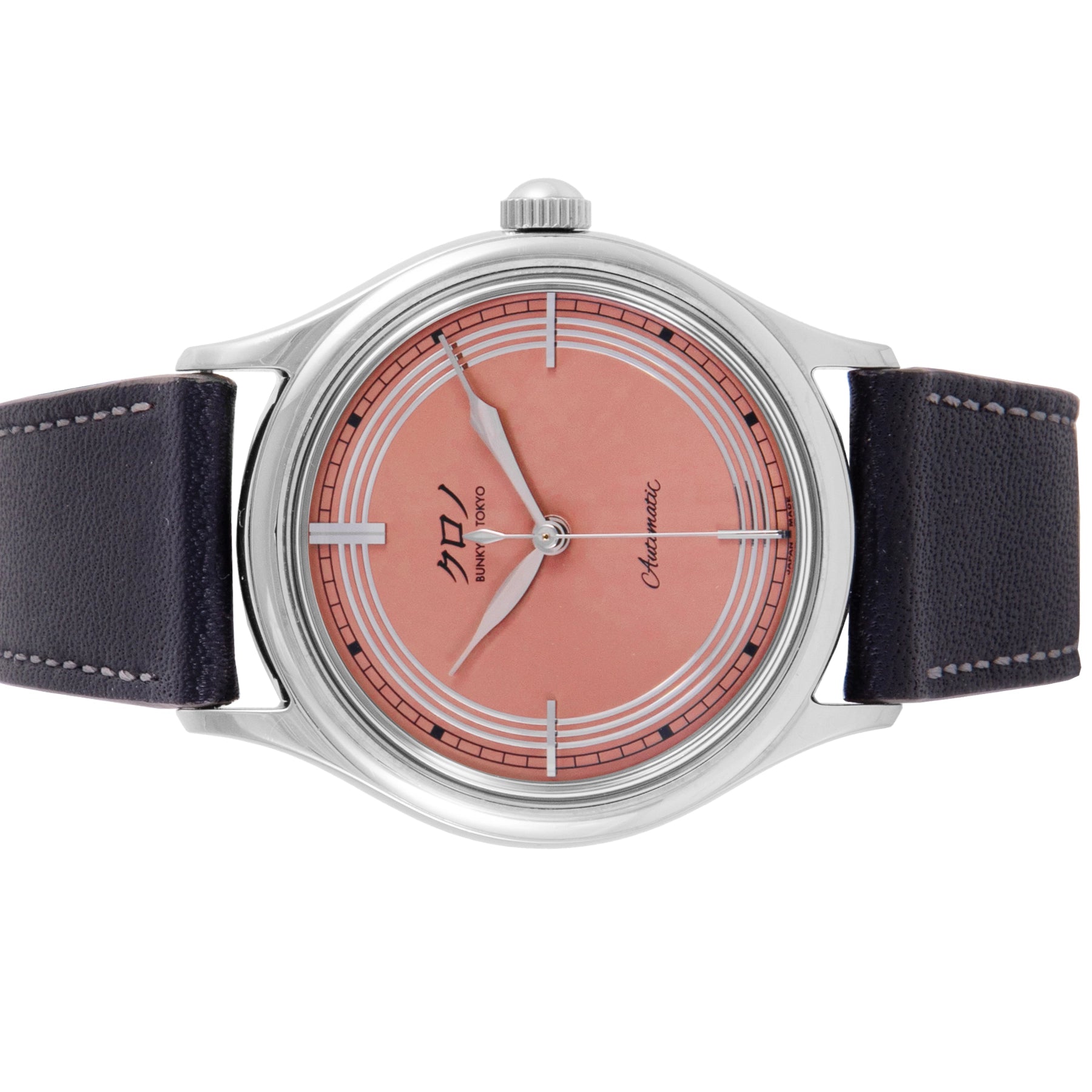 This Pre-owned Bunkyo Tokyo 2021 Anniversary Toki Metallic 37mm, steel case, coral dial, steel bezel and black leather strap is in good condition. Mechanised by Bunkyo Tokyo calibre 90S5 automatic movement. Includes box, Bunkyo Tokyo sales warranty card dated August 2021 and 2 years Timepiece360 warranty.