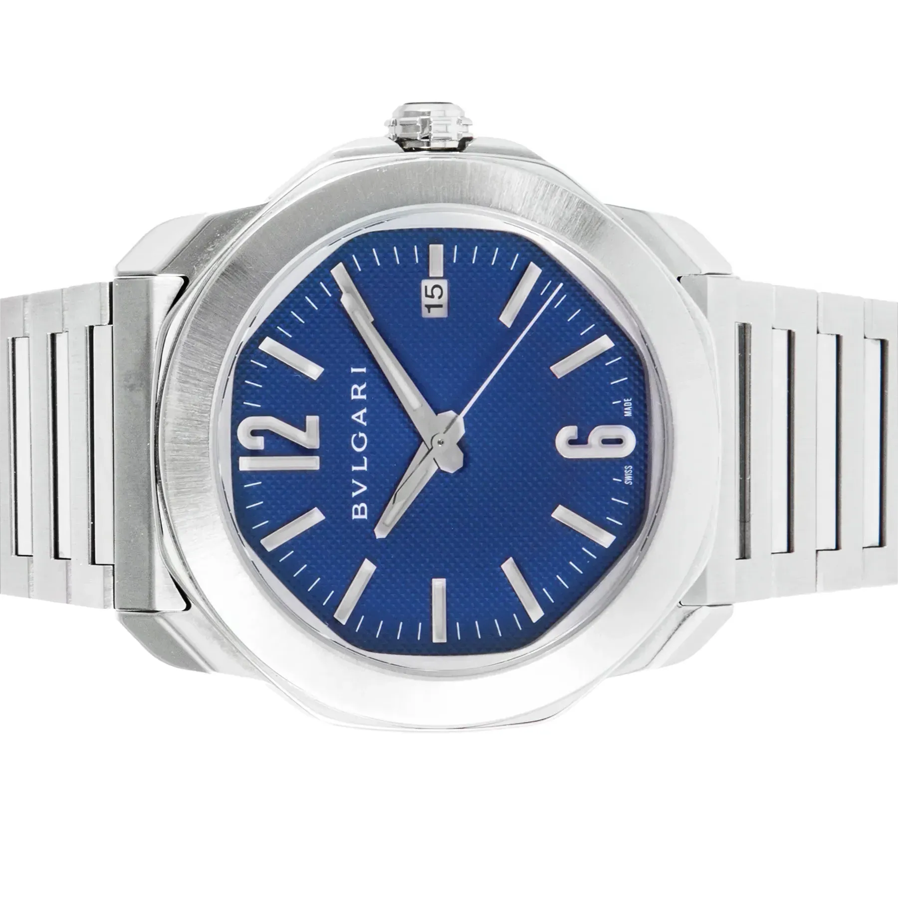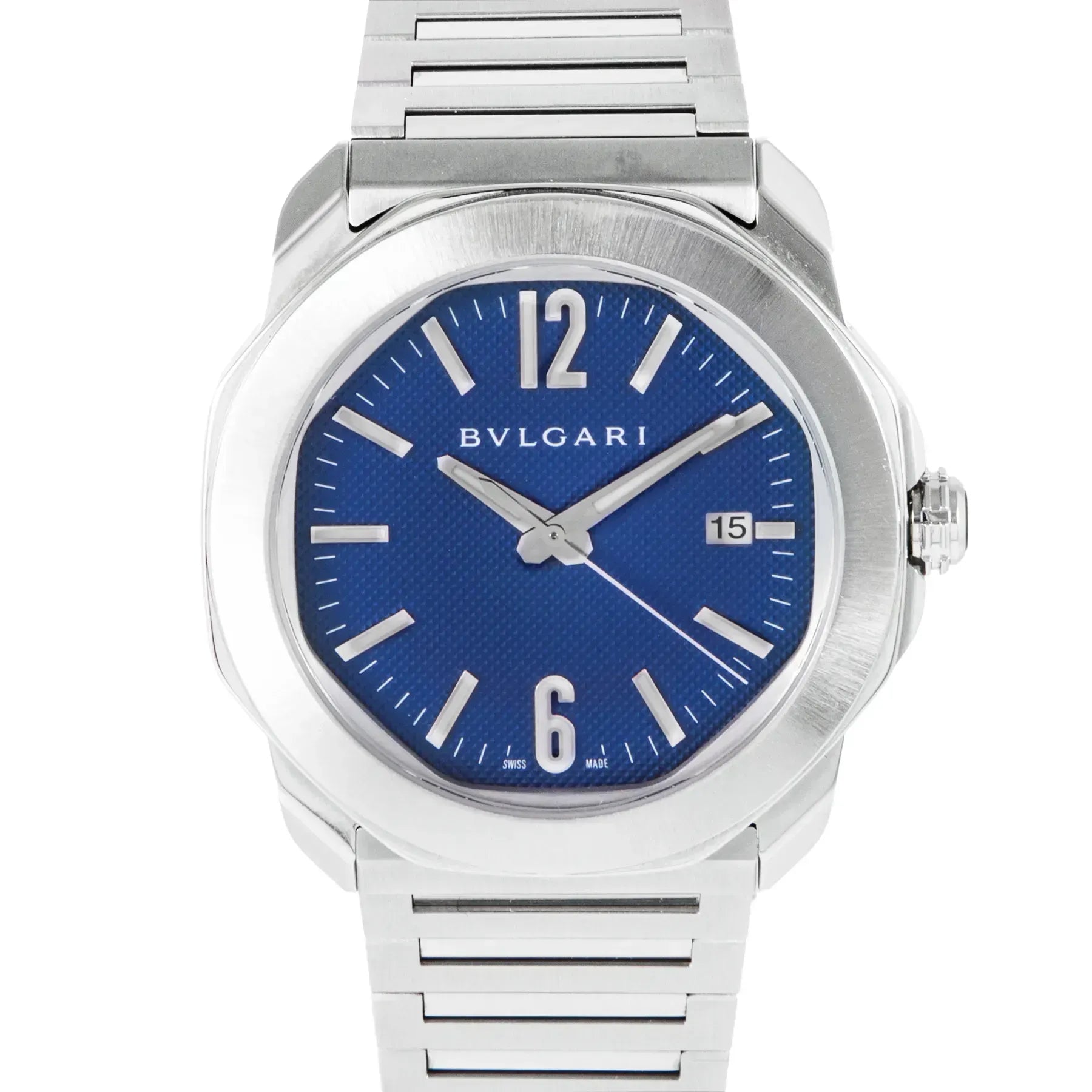 This Pre-owned Bvlgari Octo Roma 41mm, steel case, blue dial, steel bezel and steel bracelet with 29 links is in very good condition. Mechanised by Bvlgari calibre BLV 191 automatic movement. Includes box, 2 sets of blue rubber strap and sales warranty card dated July 2023 valid until July 2028.