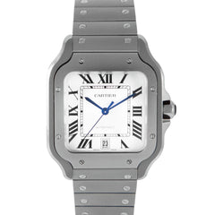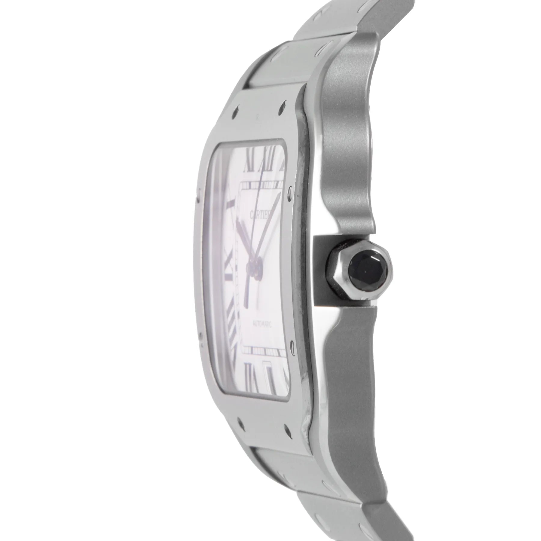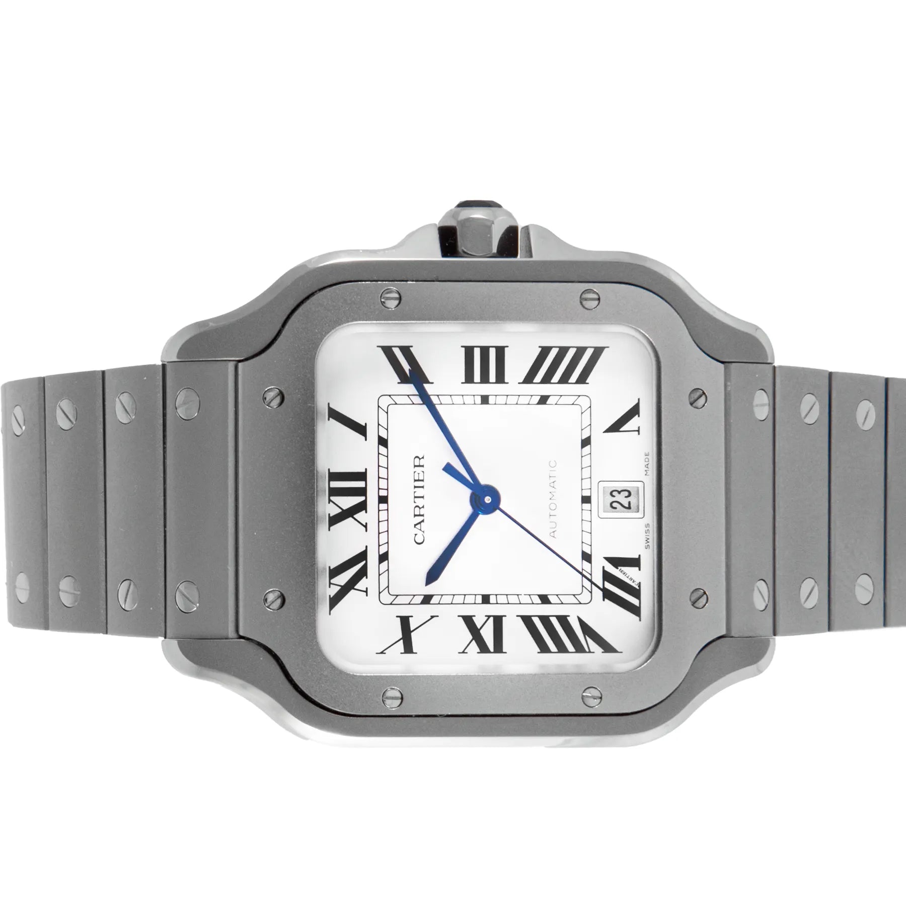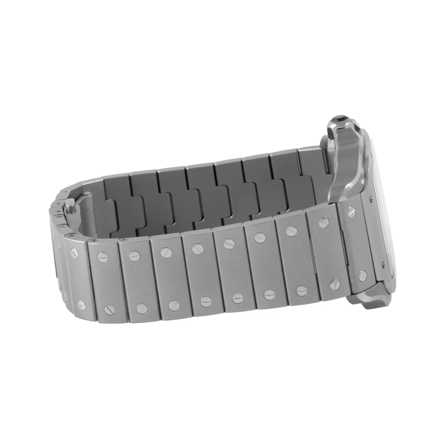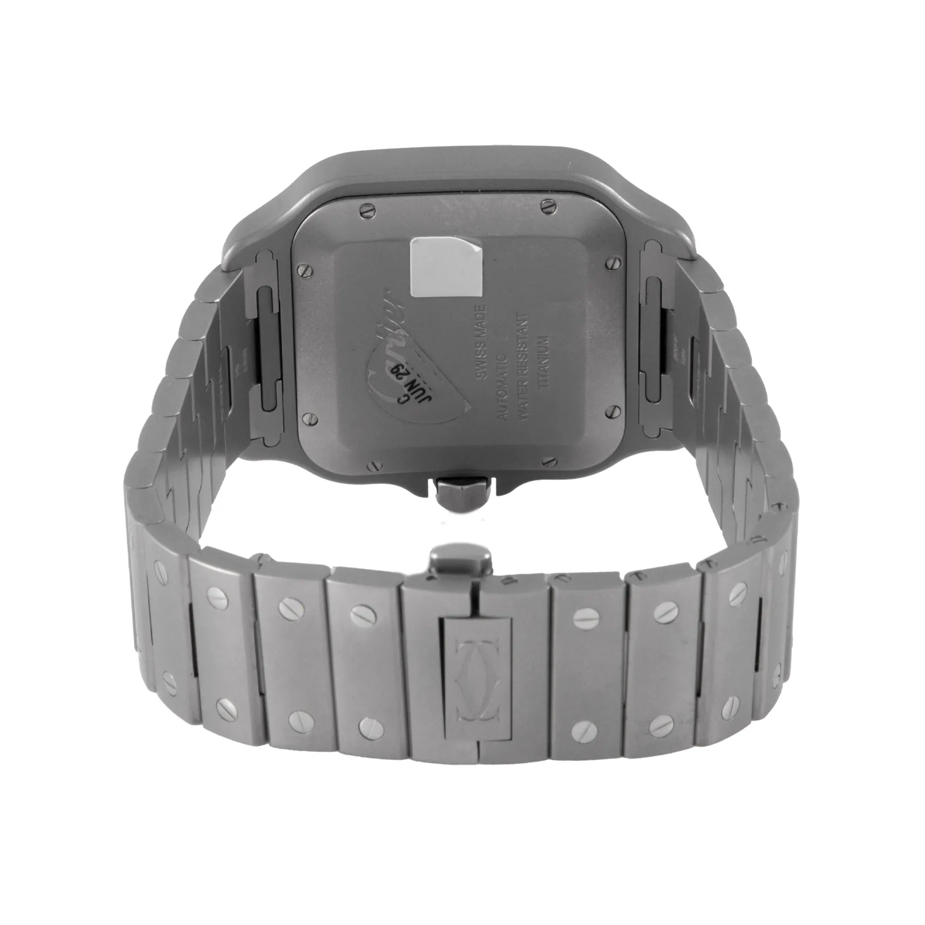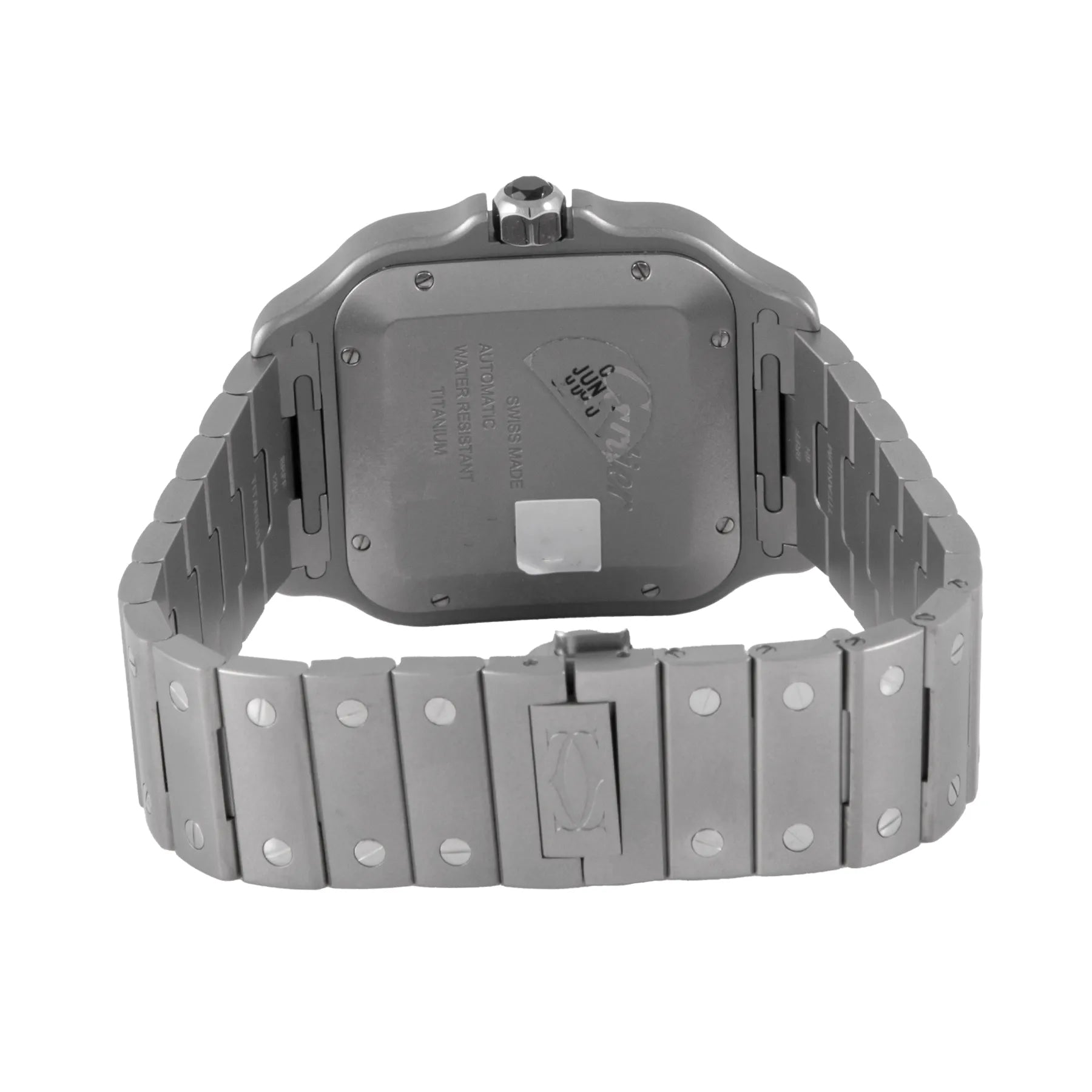This Pre-owned Cartier Santos De Cartier 47.5mm x 39.8mm, titanium case, silver dial, titanium bezel and titanium bracelet with 22 links is in excellent condition. Mechanised by Cartier calibre 1847 automatic movement. Includes box, extra black leather strap, extra black rubber strap and sales warranty card dated November 2025.