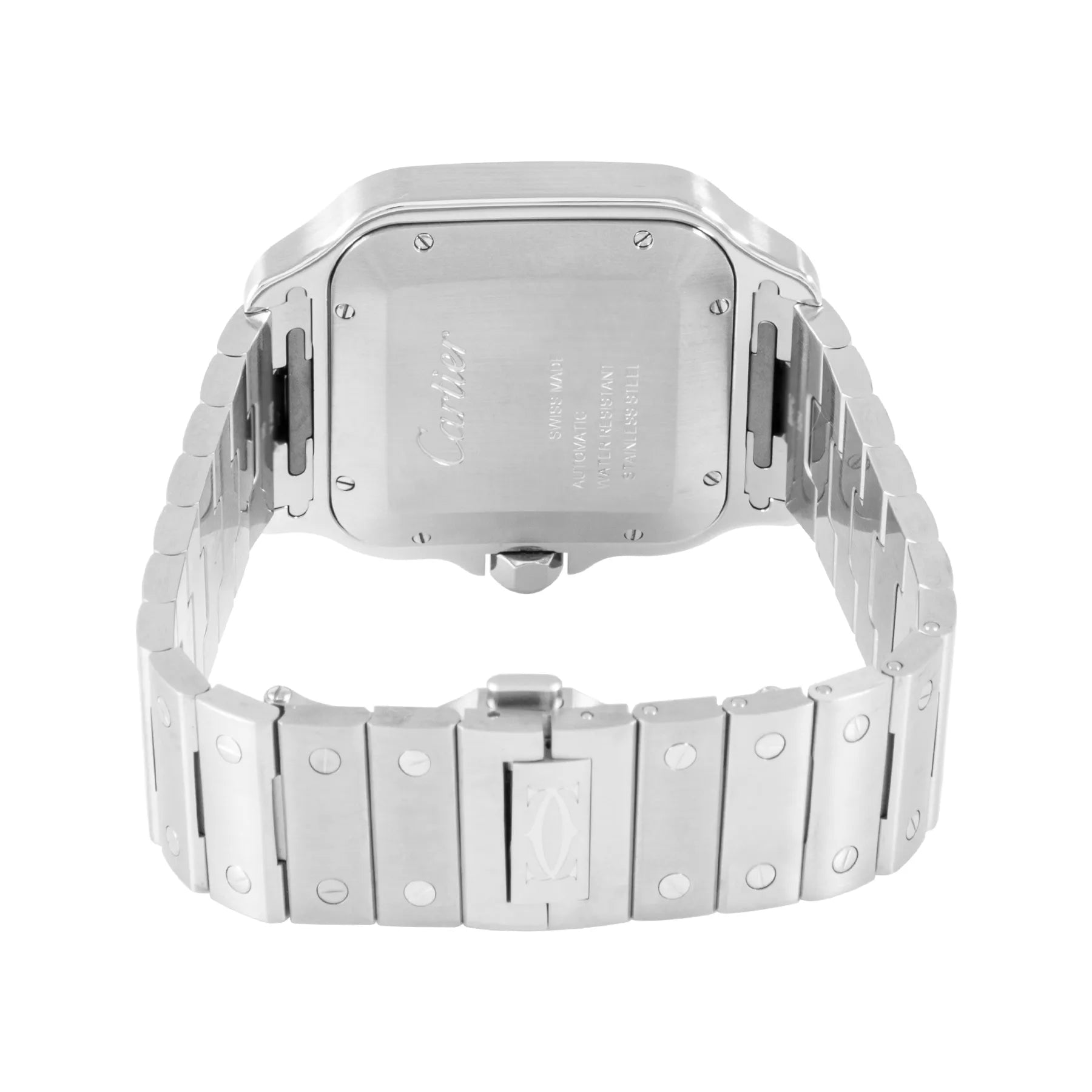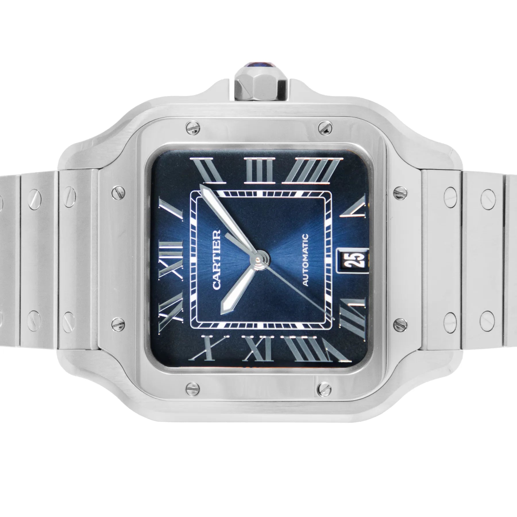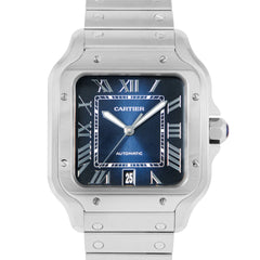 This Pre-owned Cartier Santos De Cartier 47.5mm x 39.8mm, steel case, blue dial, steel bezel and steel bracelet with 19 links is in excellent condition. Mechanised by Cartier calibre 1847MC automatic movement. Includes box and sales warranty card dated May 2025 valid until May 2033.