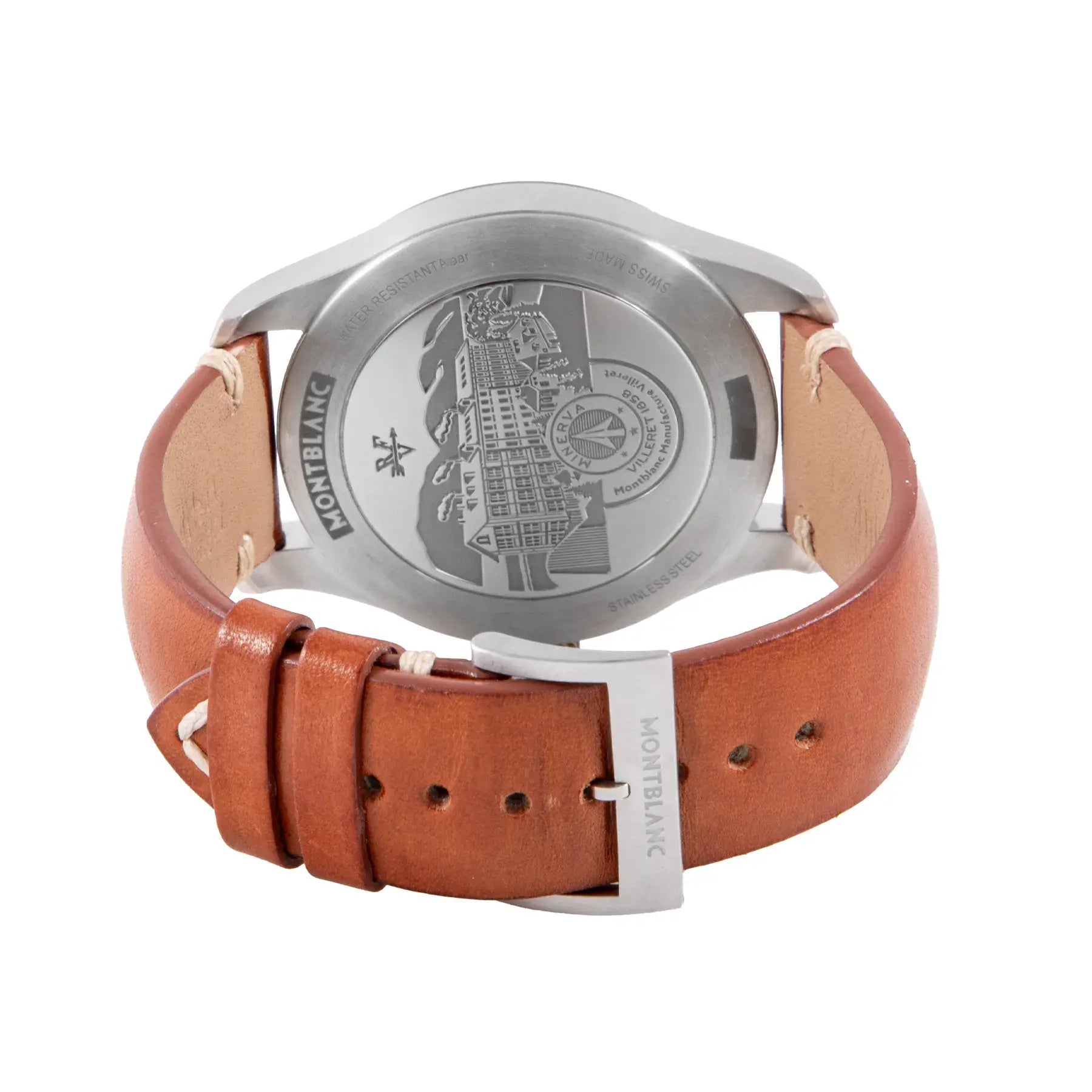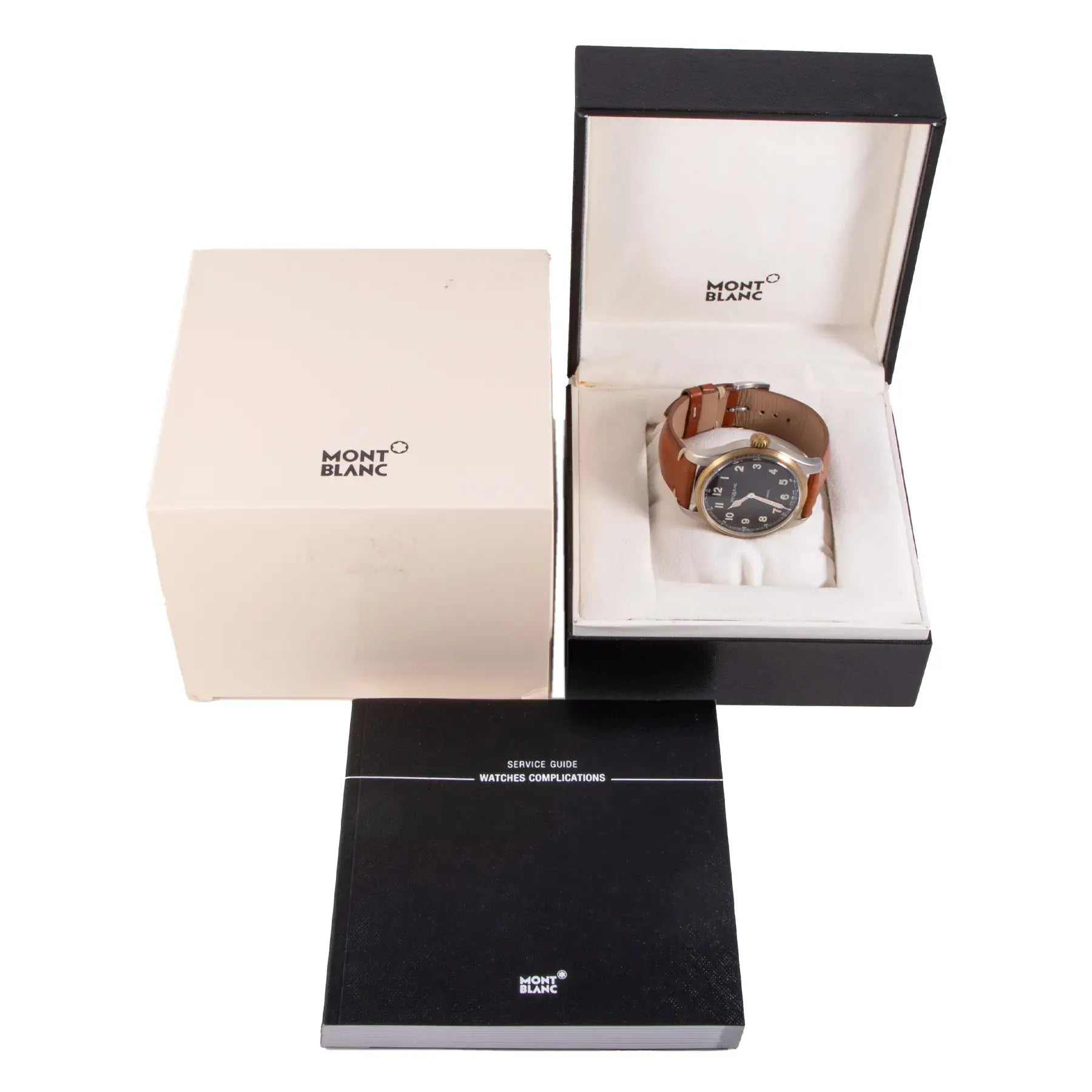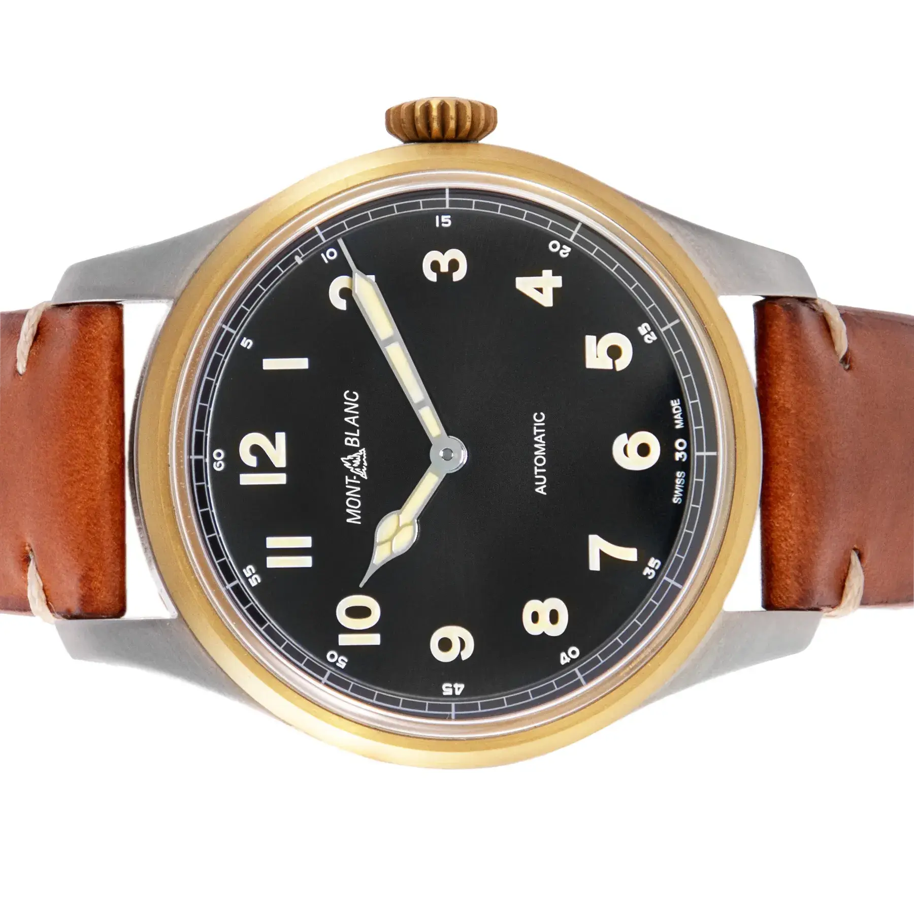 This Pre-owned Montblanc Minerva Villeret 44mm, steel case, black dial, bronze bezel and brown leather strap is in excellent condition. Mechanised by Montblanc calibre MB 2415 automatic movement. Includes box, sales warranty card dated April 2021 and 2 years Timepiece360 warranty.