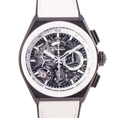 This Pre-owned Zenith Defy El Primero 21 Boutique Edition 44mm, ceramic case, skeleton dial, ceramic bezel and white rubber strap is in excellent condition. Mechanized by Zenith caliber El Primero 9004 automatic movement. Includes box, extra black rubber strap, Zenith sales warranty card dated March 2021 and 2 years Timepiece360 warranty.