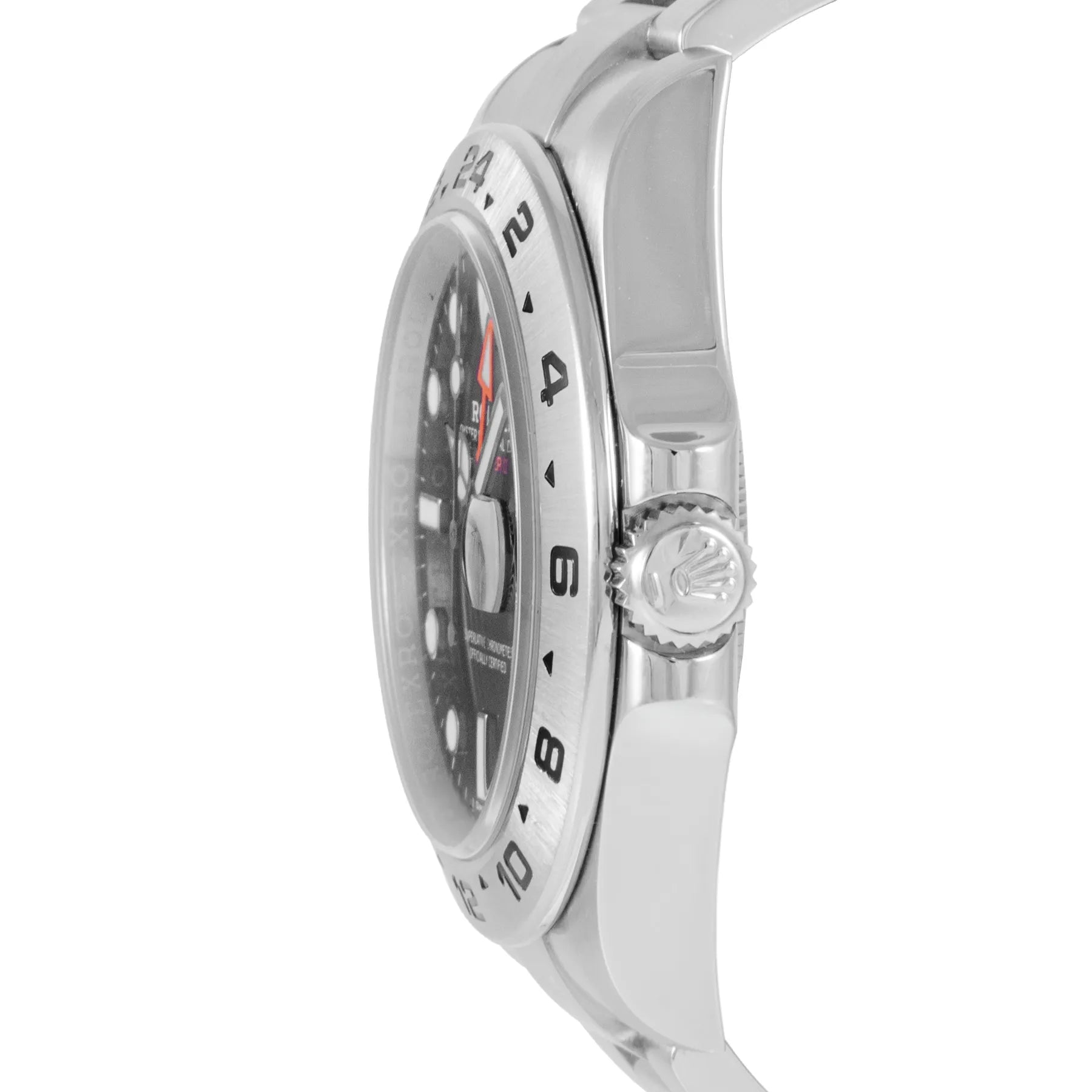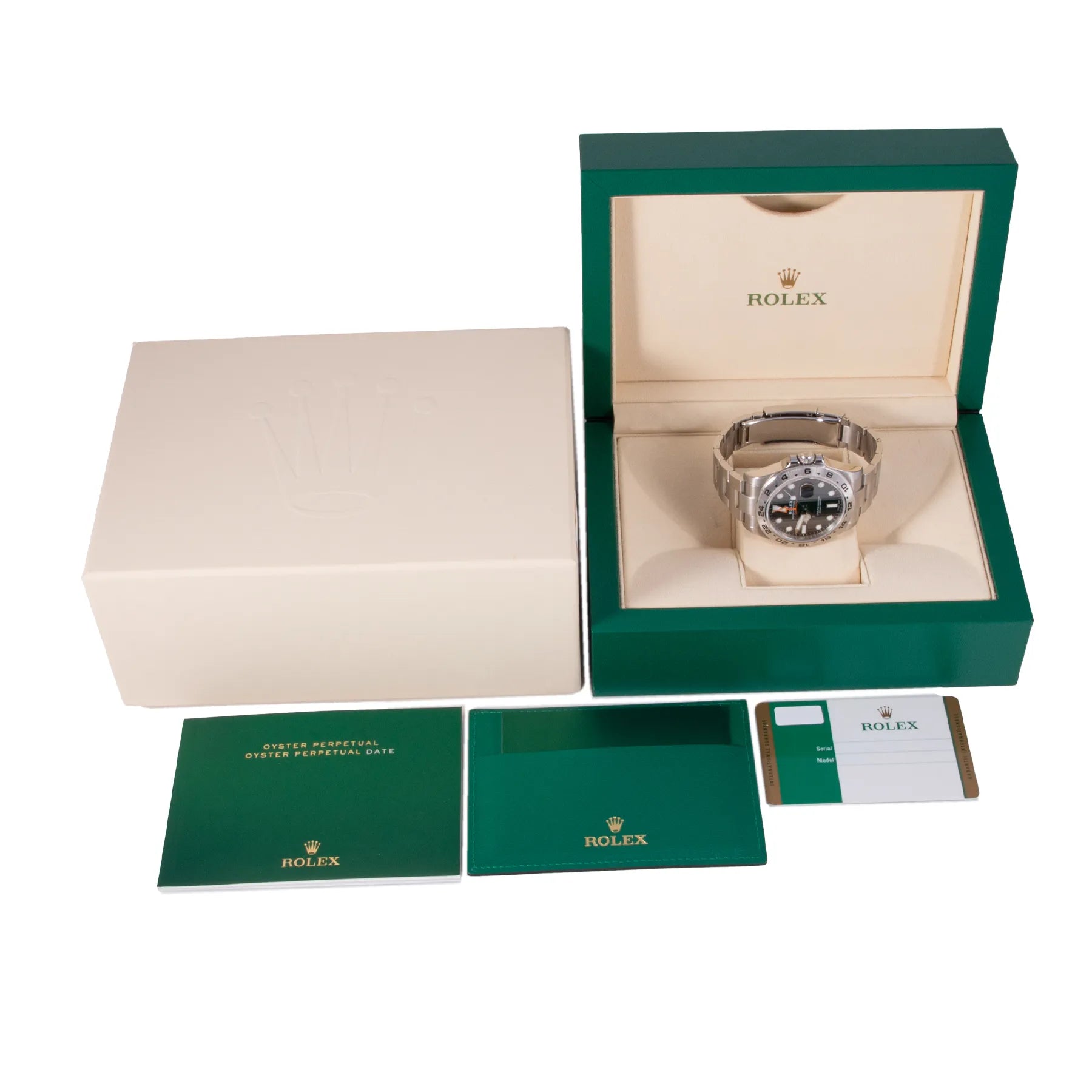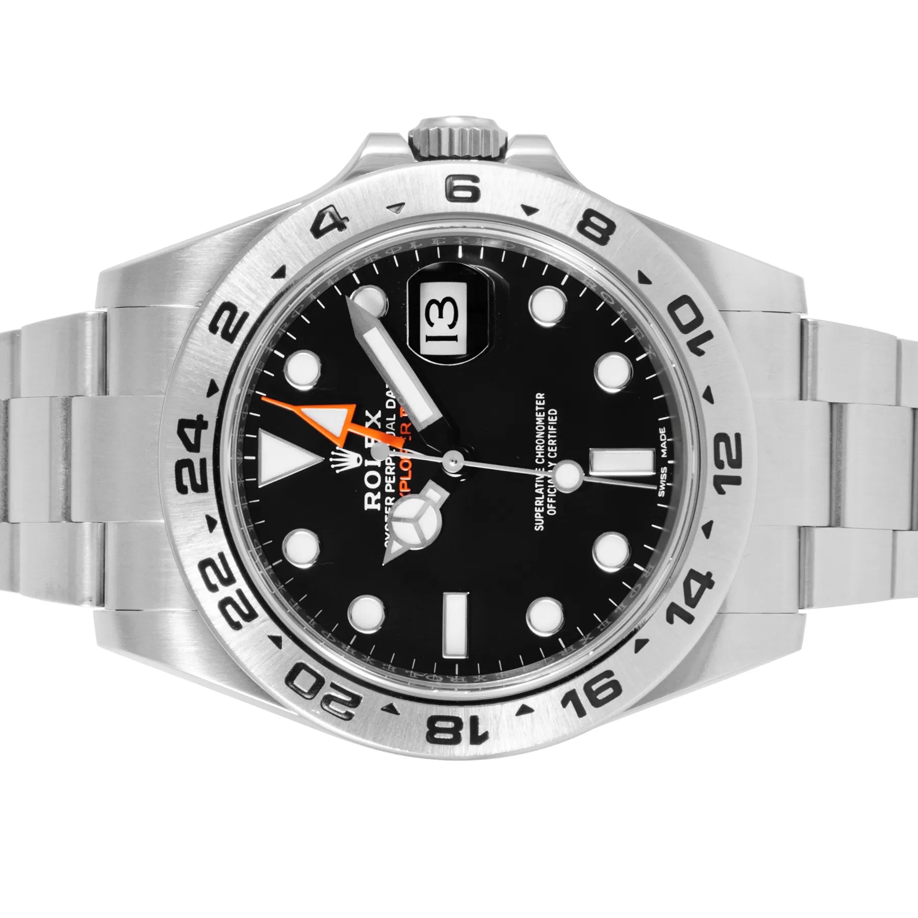 This Pre-owned Rolex Explorer II 42mm, steel case, black dial, steel bezel and steel oyster bracelet with 10 links is in excellent condition. Mechanised by Rolex calibre 3187 automatic movement. Includes box, sales warranty card dated February 2019 and 2 years Timepiece360 warranty.