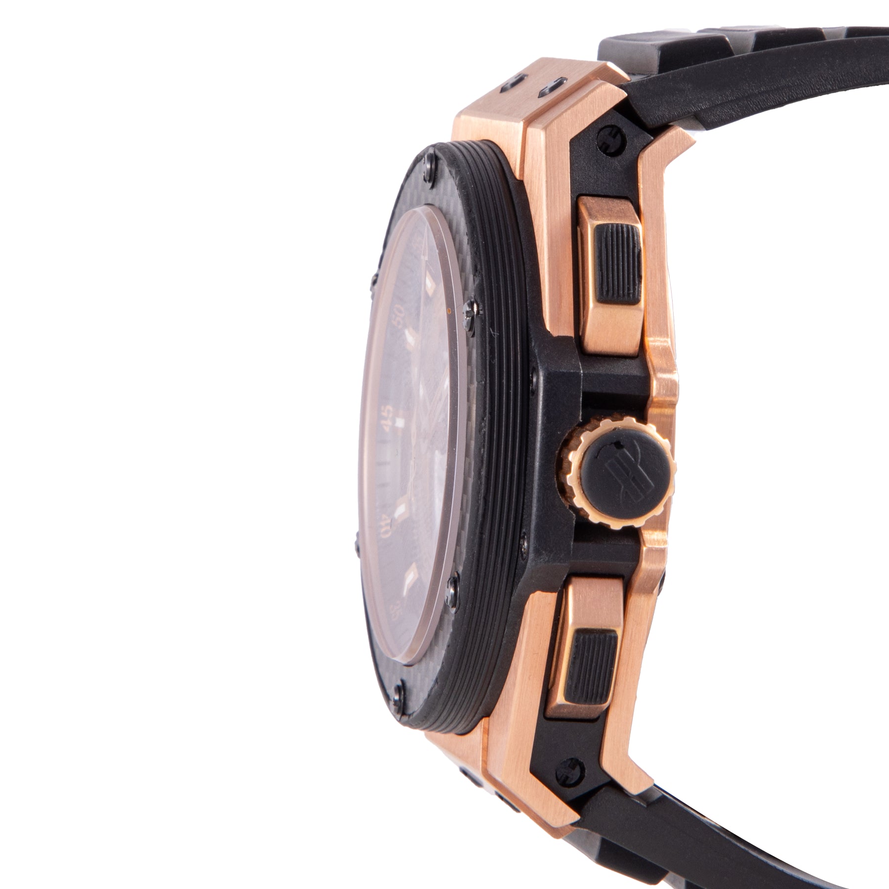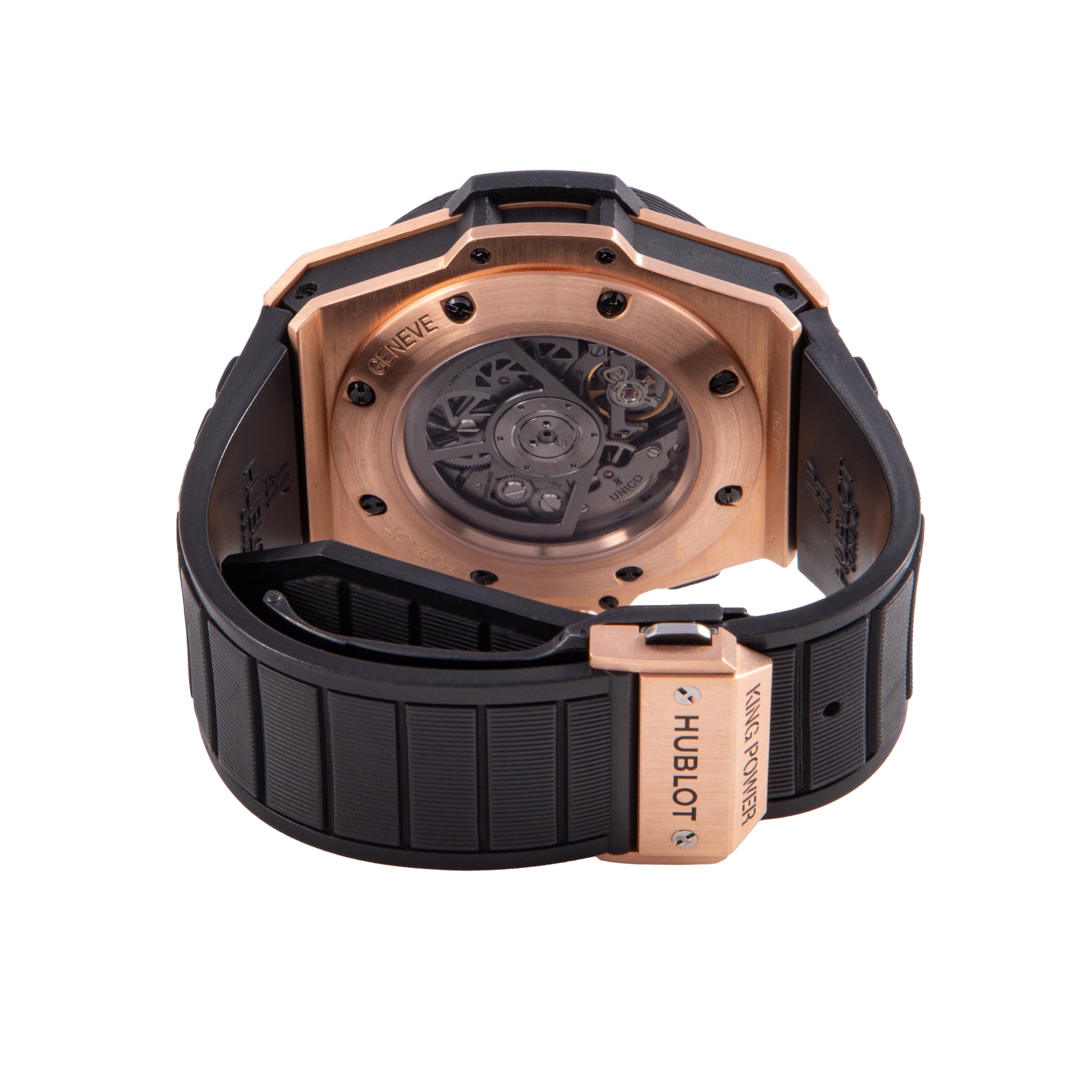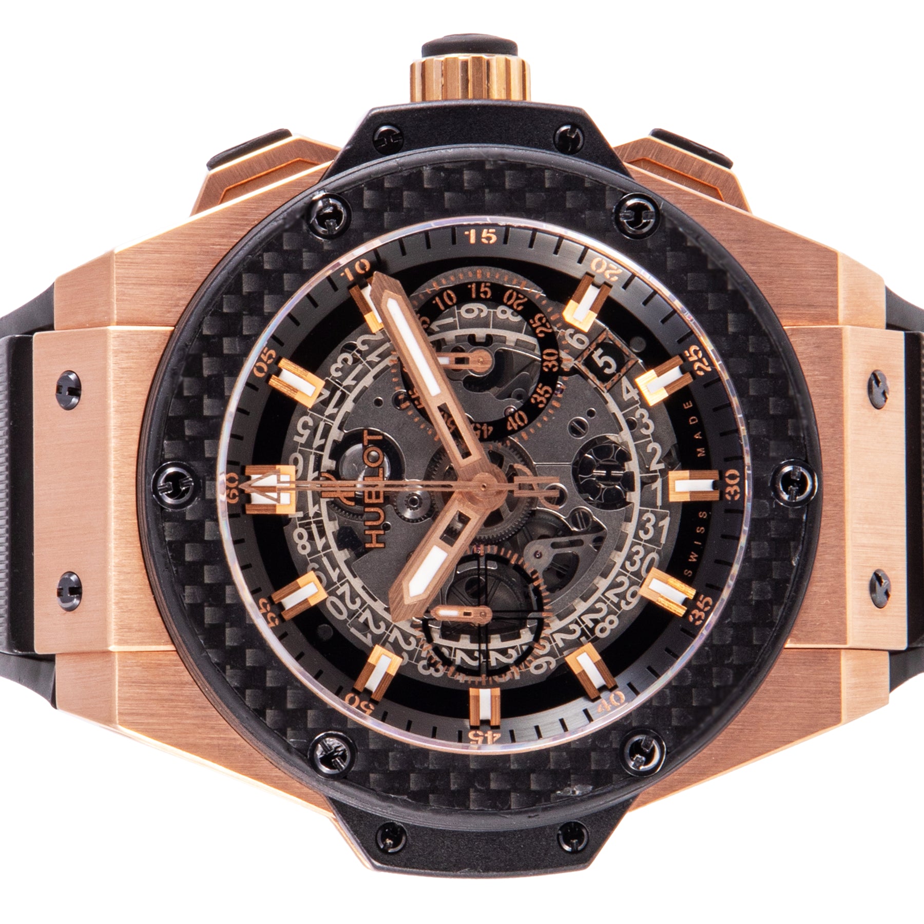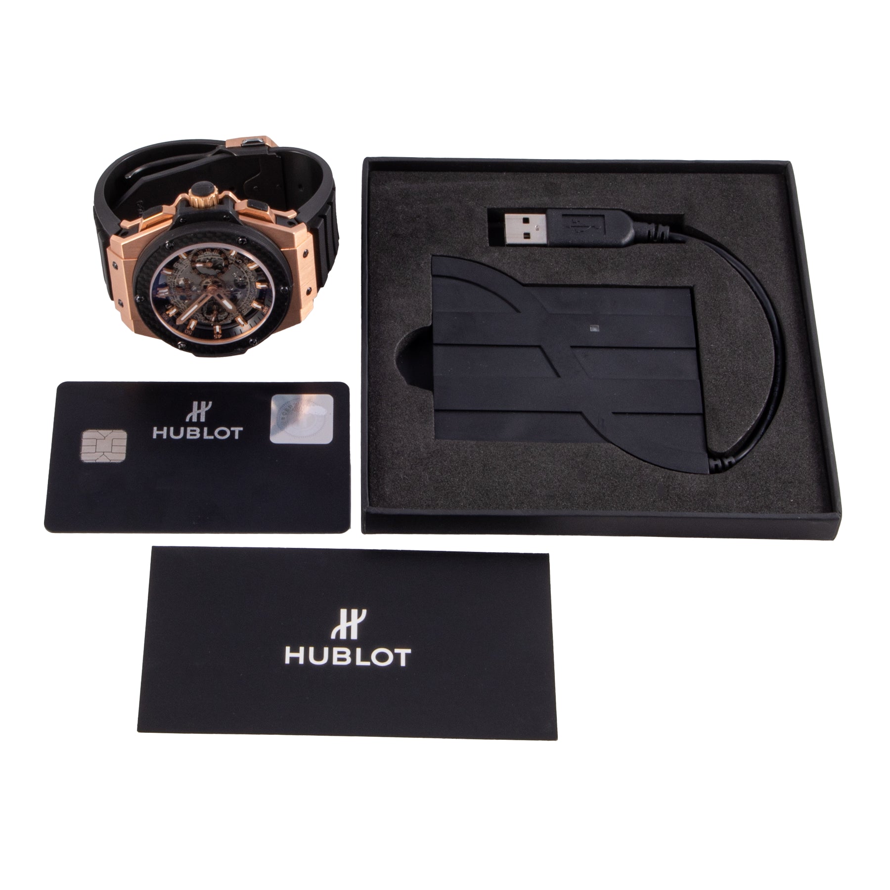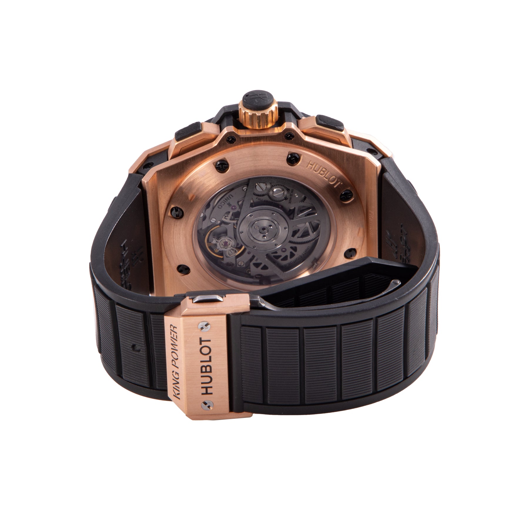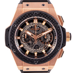 This Pre-owned Hublot King Power Unico 48mm, rose gold case, skeleton dial, carbon fiber bezel and black rubber strap is in very good condition. Mechanised by Hublot calibre HUB 1240 automatic movement. Includes undated sales warranty card and 2 years Timepiece360 warranty.