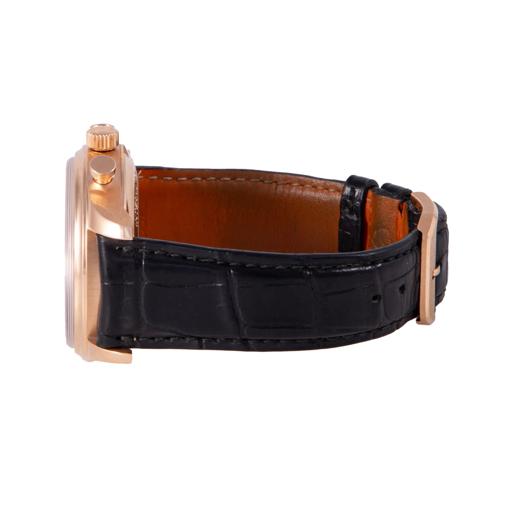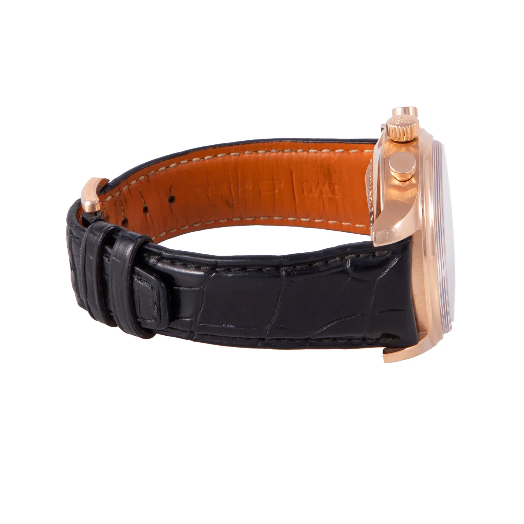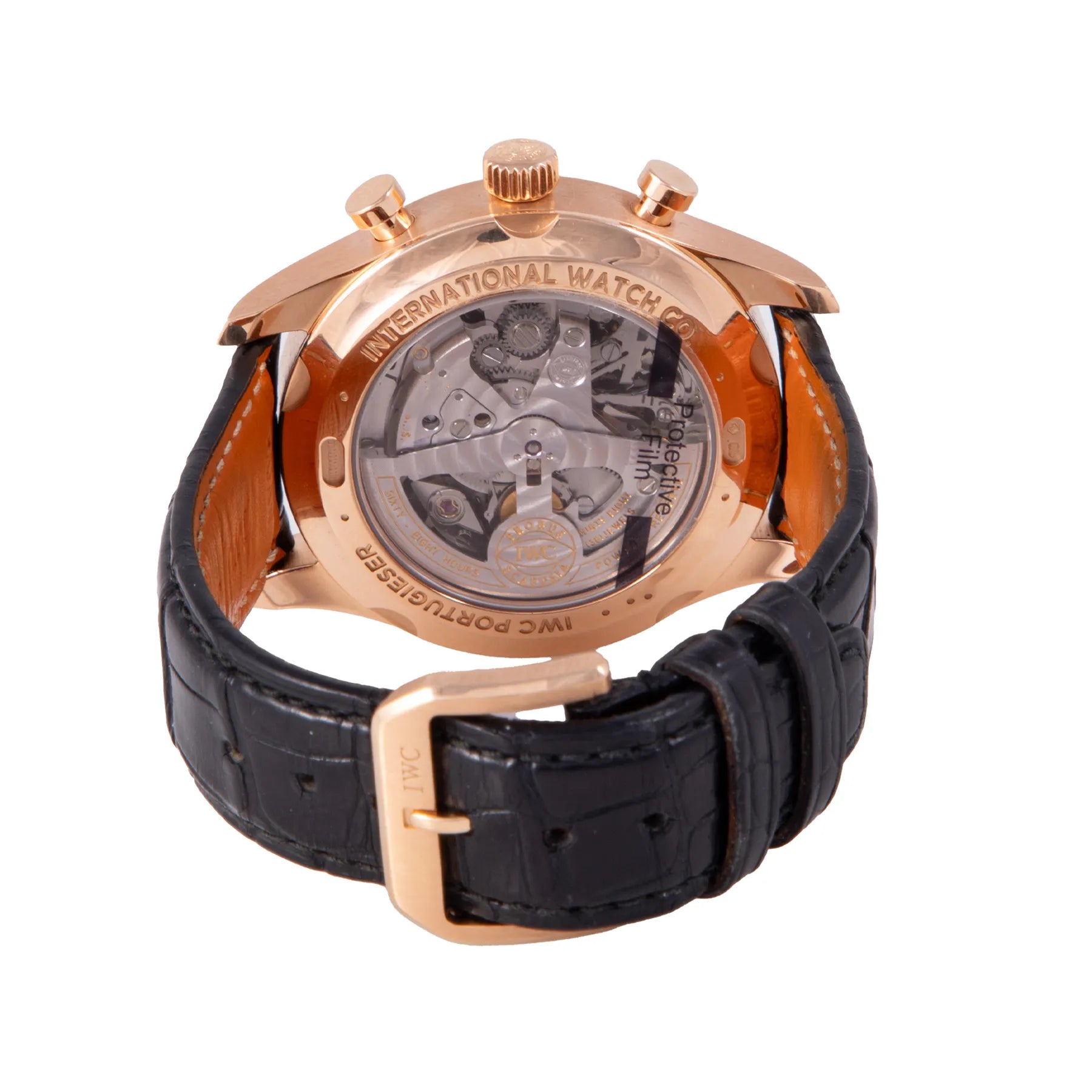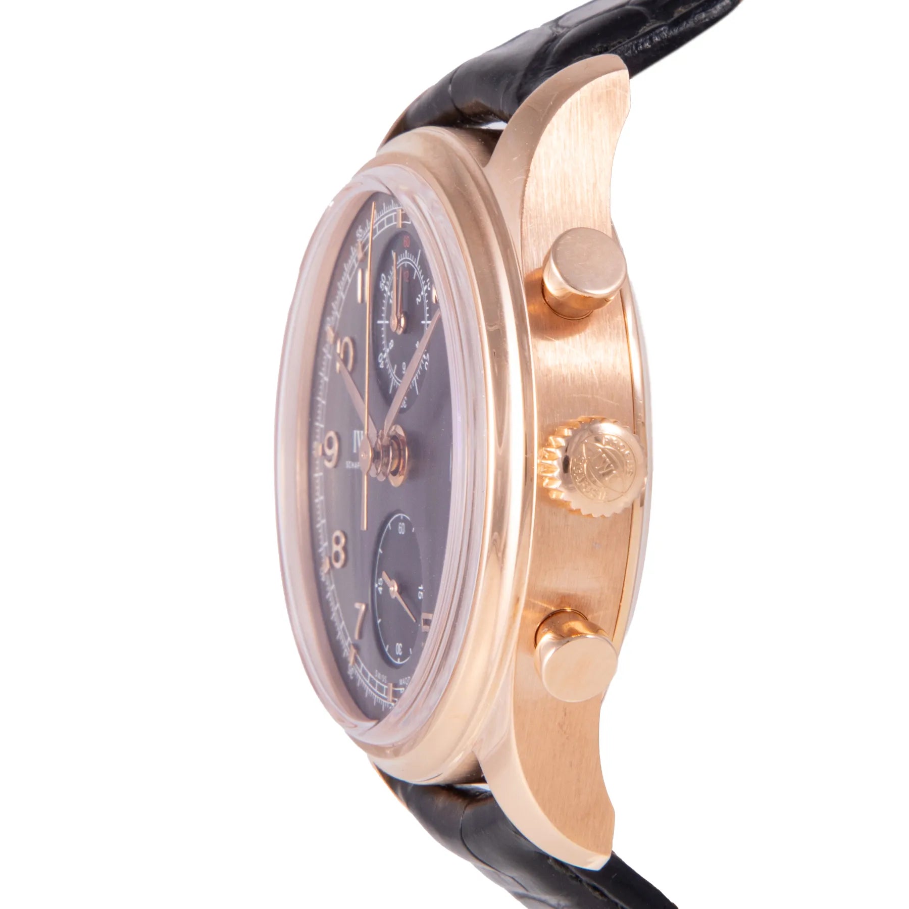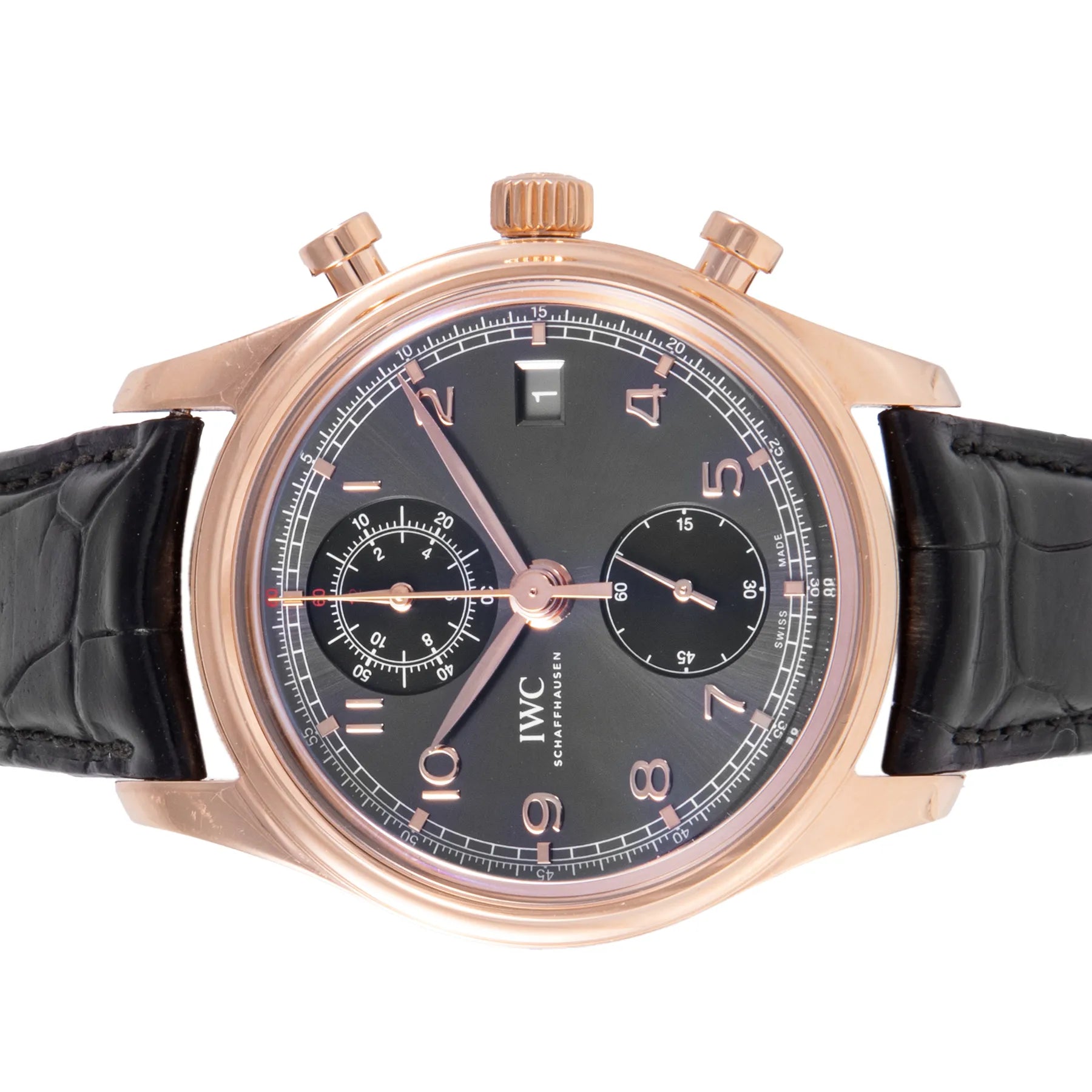 This Pre-owned IWC Portuguese Chronograph Classic 42mm, rose gold case, grey dial, rose gold bezel and black leather strap is in very good condition. Mechanised by IWC calibre C.89361 automatic movement. Includes service paper dated April 2025.