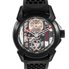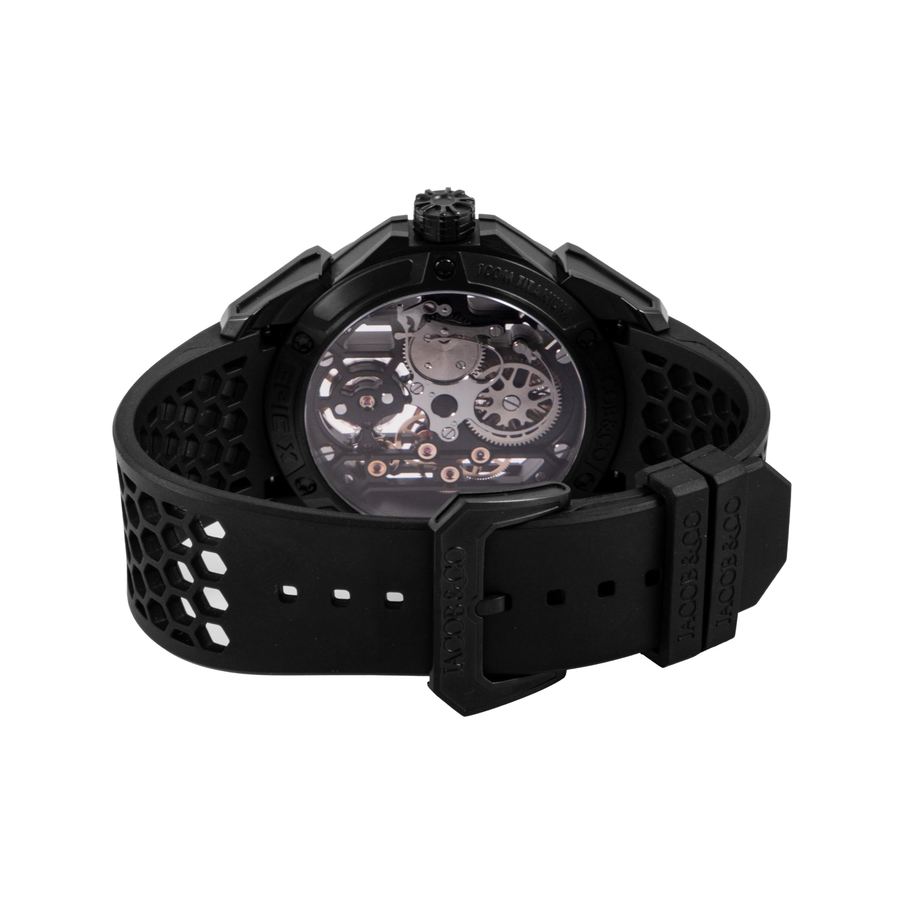 This Pre-owned Jacob & Co Epic x 44m, titanium case, skeleton dial, titanium bezel and black rubber strap is in excellent condition. Mechanised by Jacob & Co calibre JCAM45 automatic movement. Includes box, extra red rubber strap and Jacob & Co sales warranty dated February 2025.