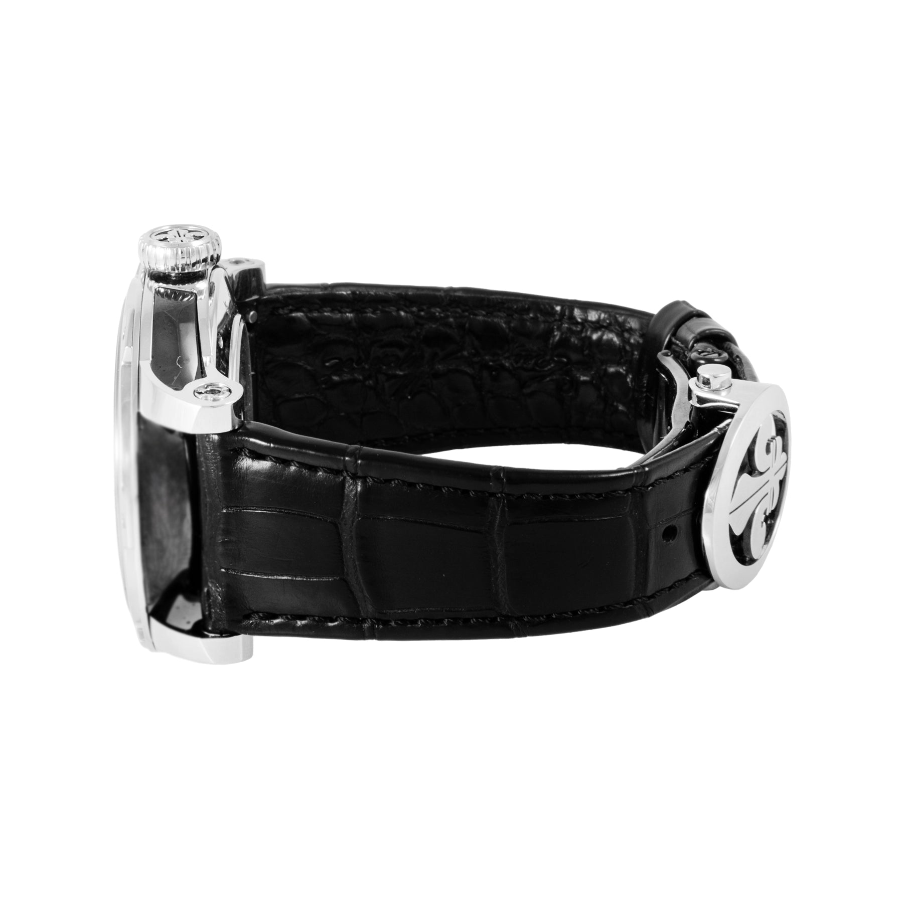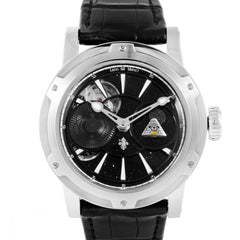 This Pre-owned Louis Moinet Space One Cosmic Art 45.4mm, steel case, black dial, steel bezel and black leather strap is in excellent condition. Mechanised by Louis Moinet calibre 003 automatic movement. This watch is limited to 12 pieces only. Includes box, extra strap and sales warranty card dated May 2025.