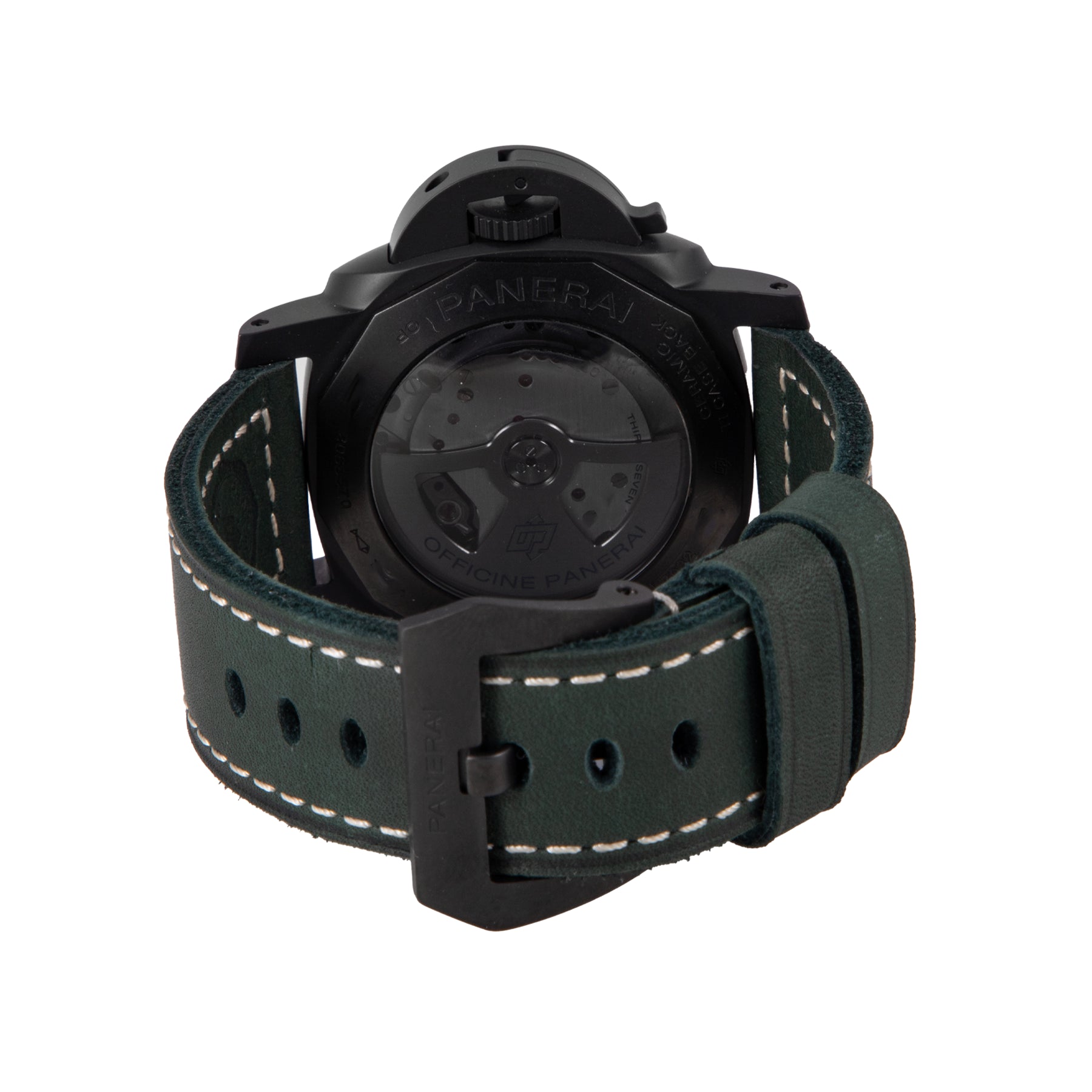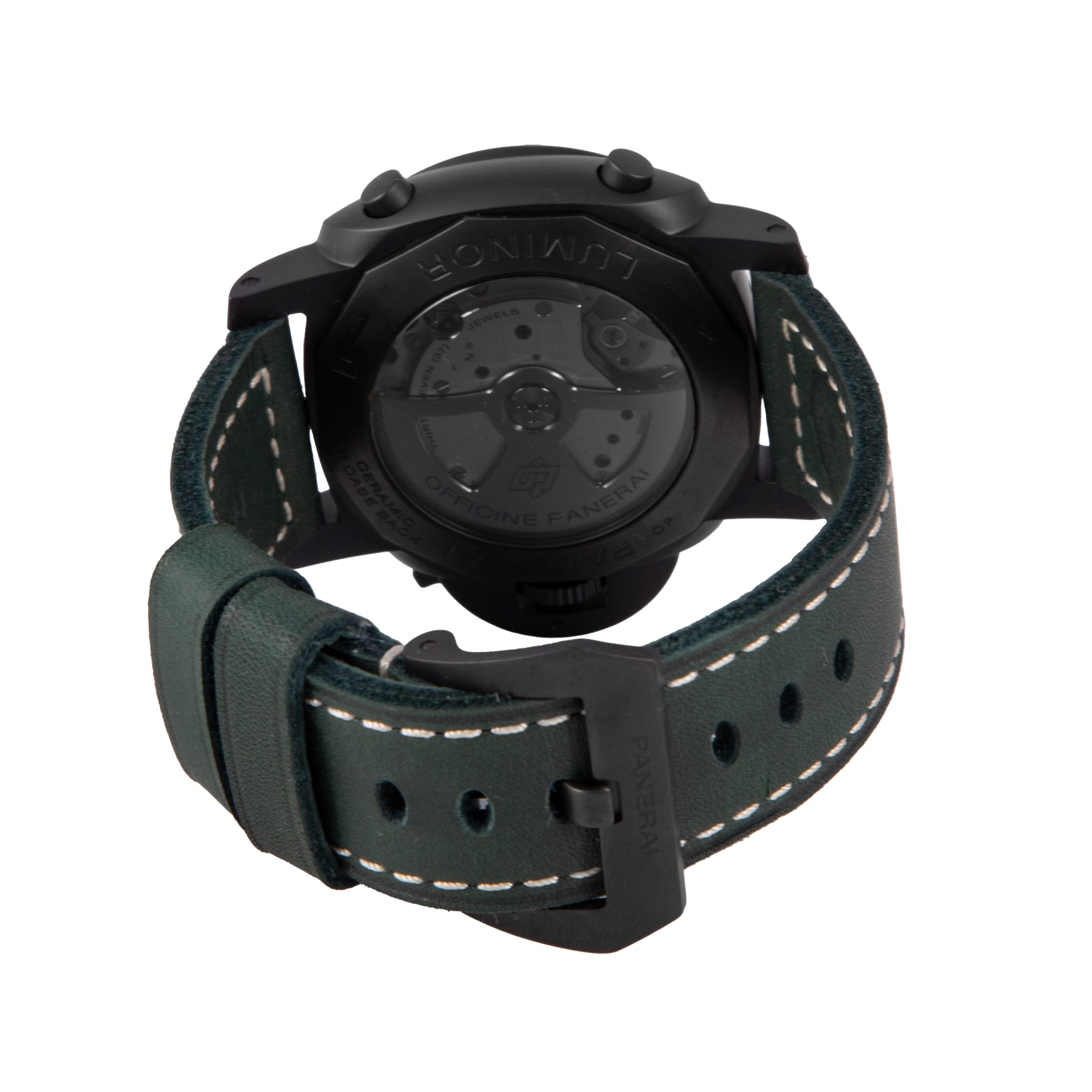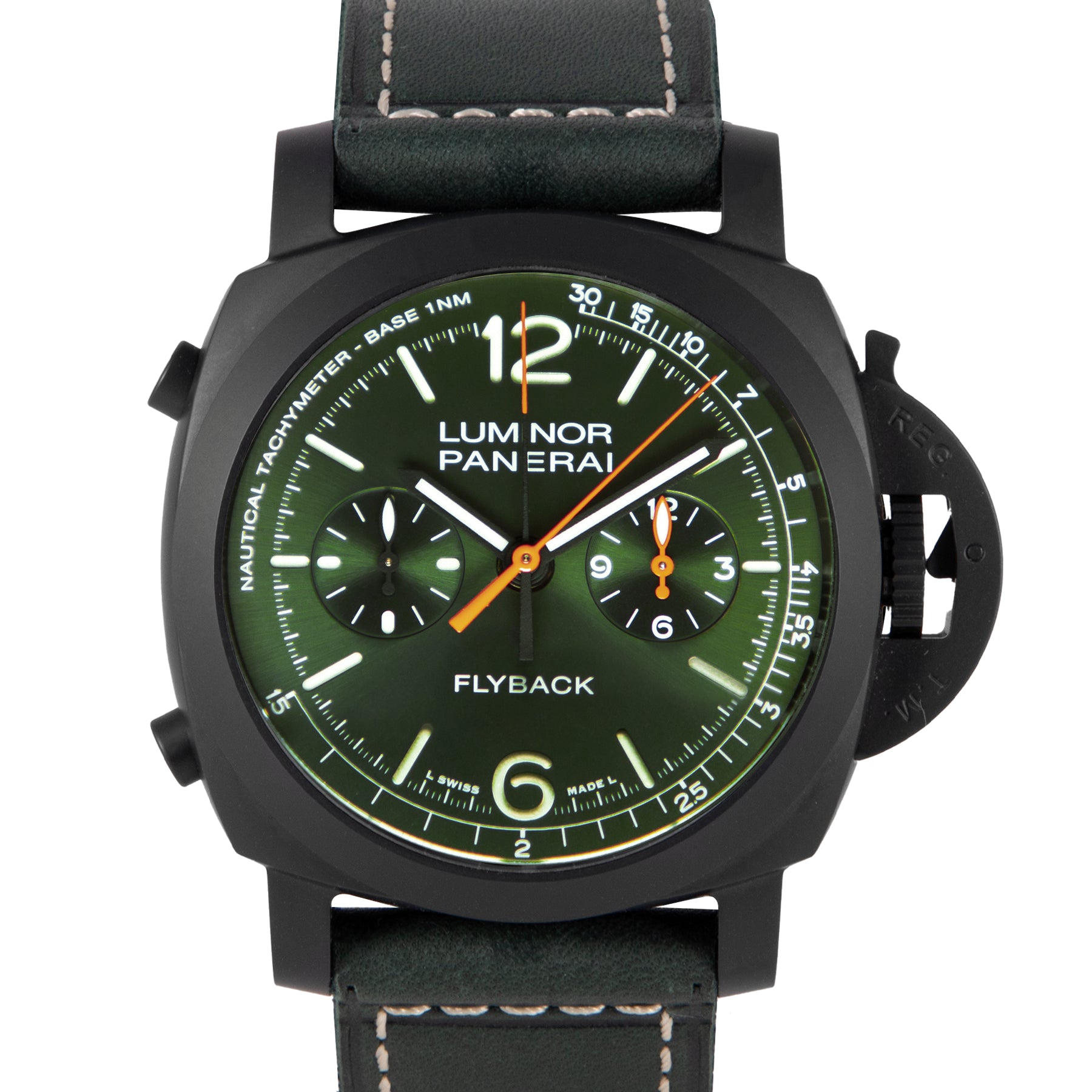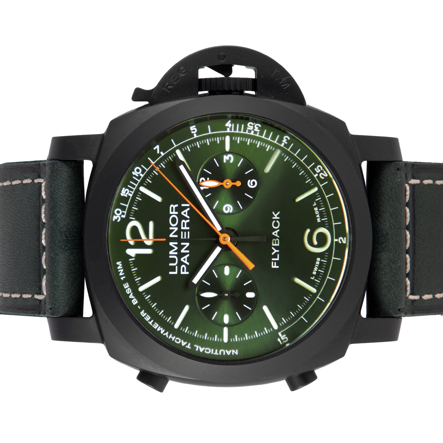 This Pre-owned Officine Panerai Luminor Chrono Flyback 44mm, ceramic case, green dial, ceramic bezel and green leather strap is in excellent condition. This watch is Limited to 200 pieces only. Mechanised by Officine Panerai calibre 9100 automatic movement. Includes box, extra green rubber strap, sales warranty card dated November 2023 and 2 years Timepiece360 warranty.