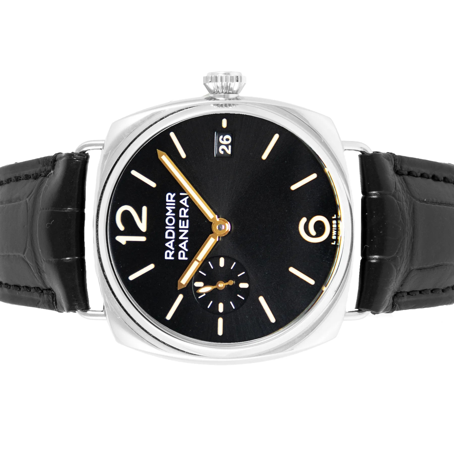 This Pre-owned Officine Panerai Radiomir Quaranta 40mm, steel case, black dial, steel bezel and black leather strap is in excellent condition. Mechanised by Officine Panerai calibre P.900 automatic movement. Includes box, undated sales warranty card and 2 years Timepiece360 warranty.