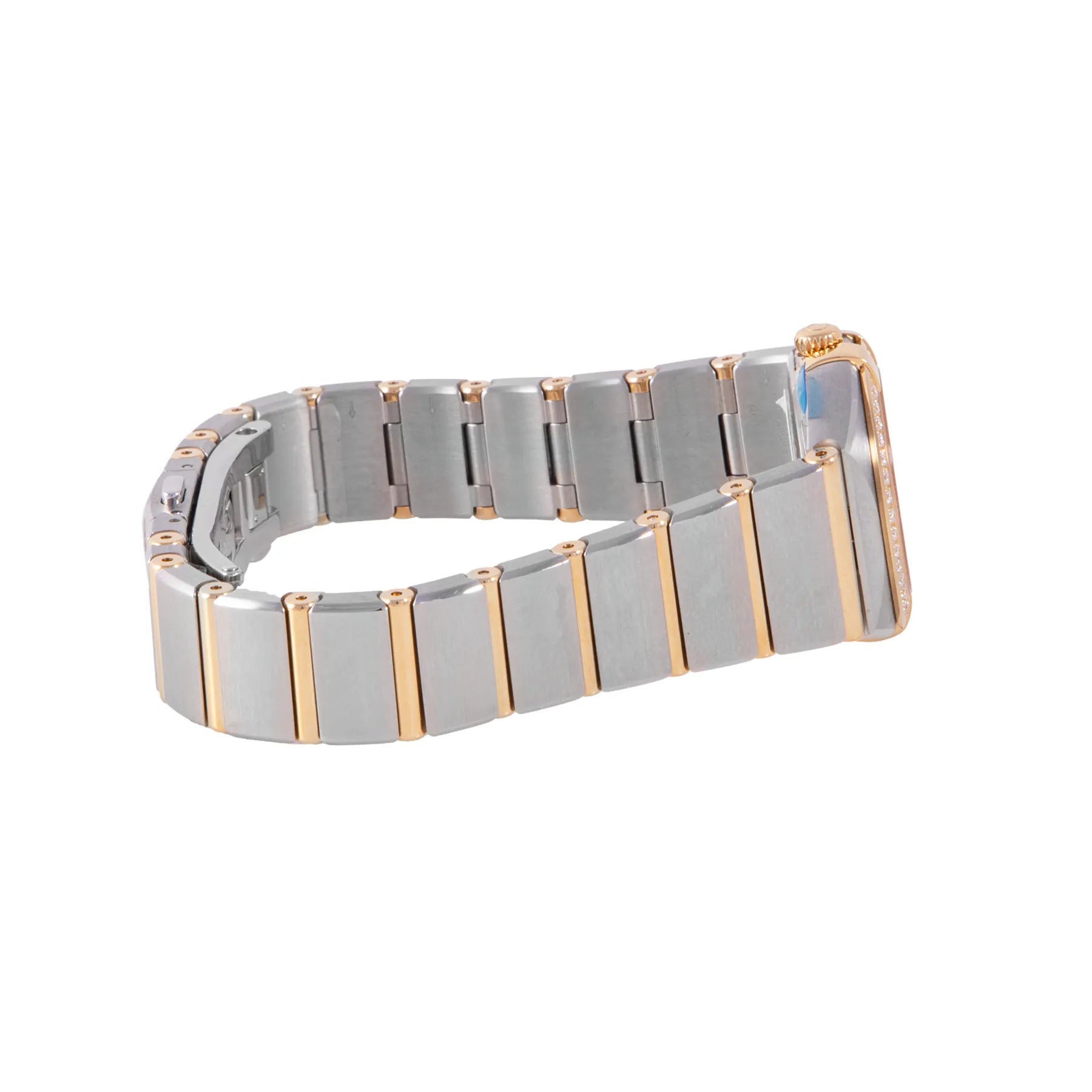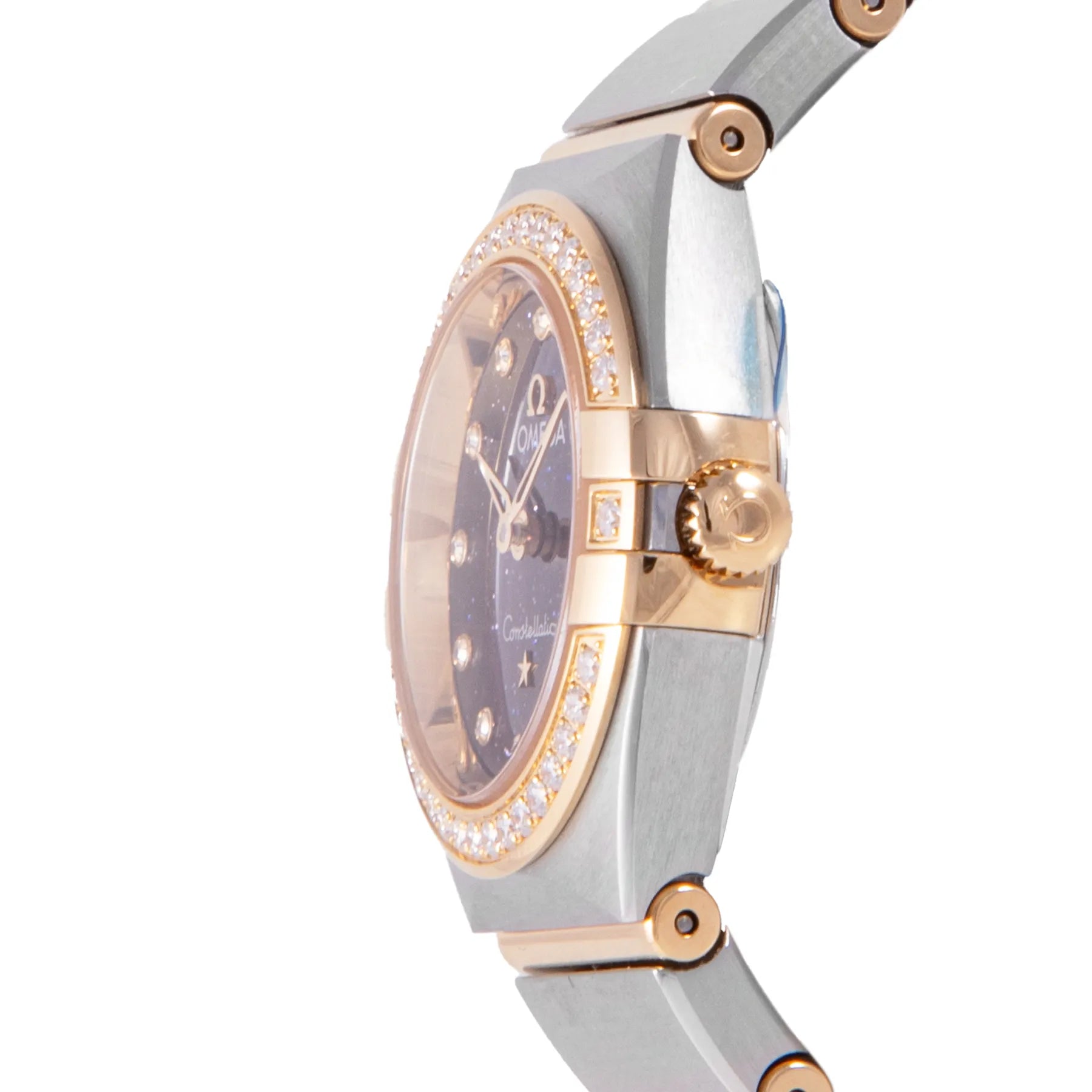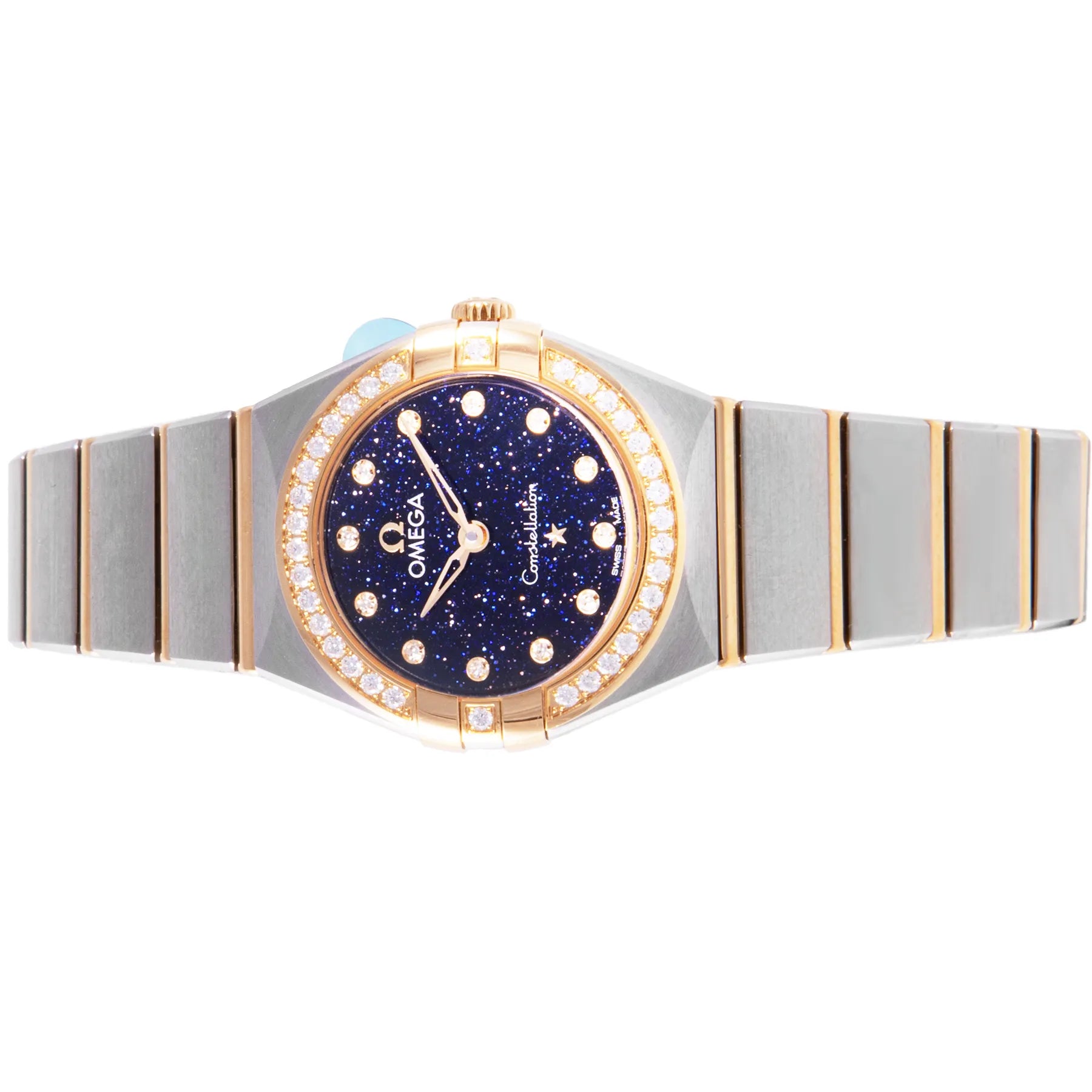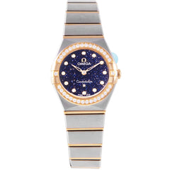 This Omega Constellation 25mm, steel & yellow gold case, blue diamond dial, diamonds set on bezel and steel & yellow gold bracelet with 17 links in an unworn condition. Mechanised by Omega calibre 4061 quartz movement. Includes box and sales warranty card dated February 2024.