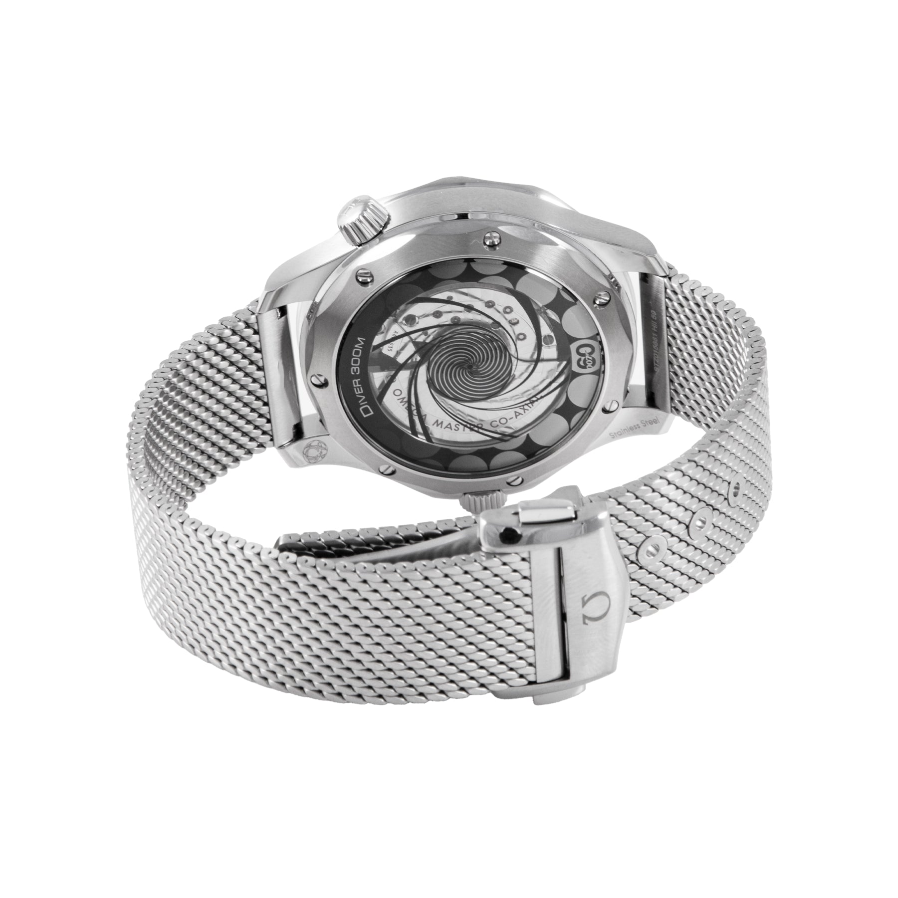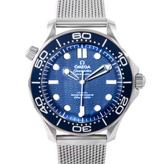 This Pre-owned Omega Seamaster Diver 300M "James Bond 60th Anniversary" 42mm, steel case, blue dial, aluminium bezel and steel bracelet is in excellent condition. Mechanised by Omega calibre 8806 automatic movement. Includes box and Omega sales warranty card dated February 2025.